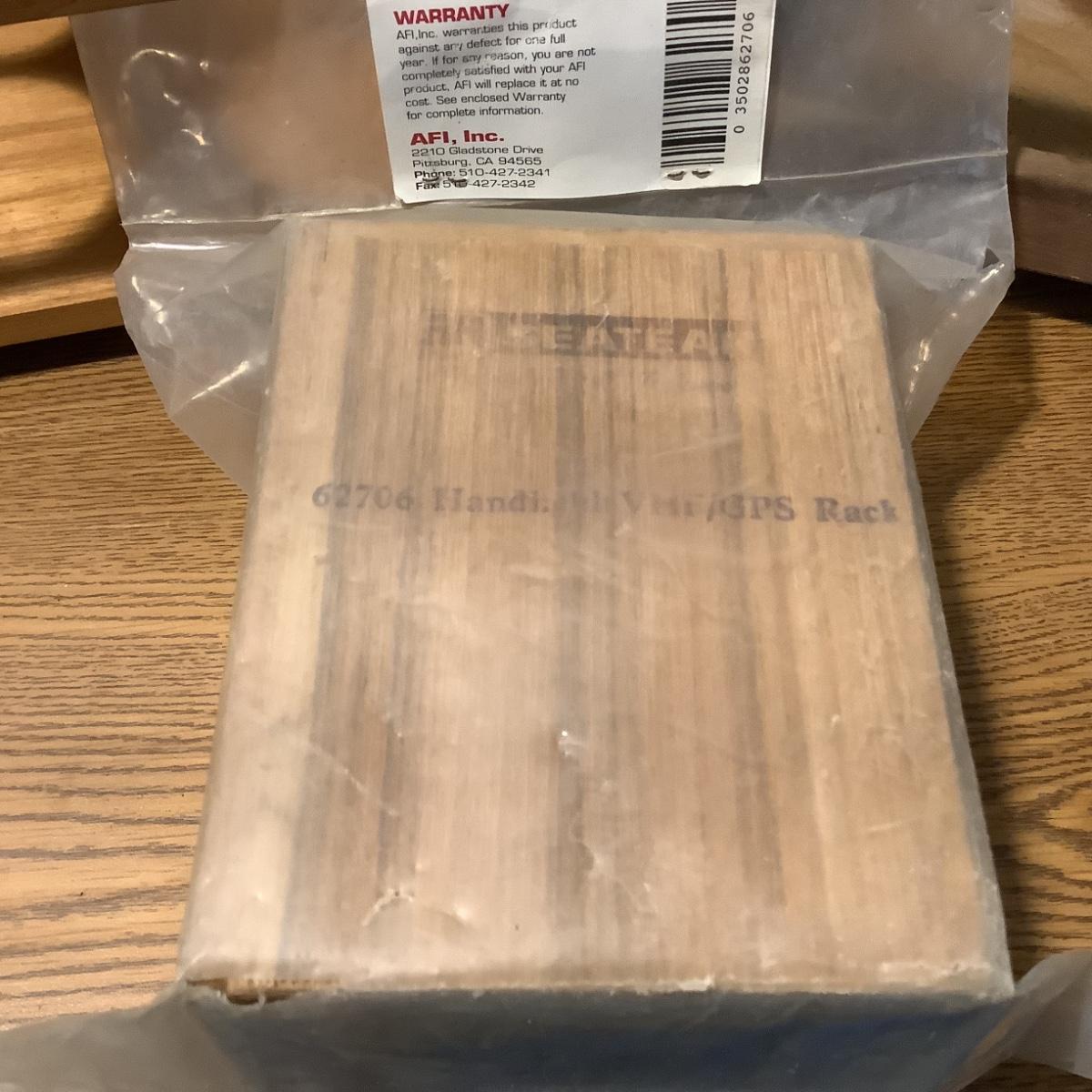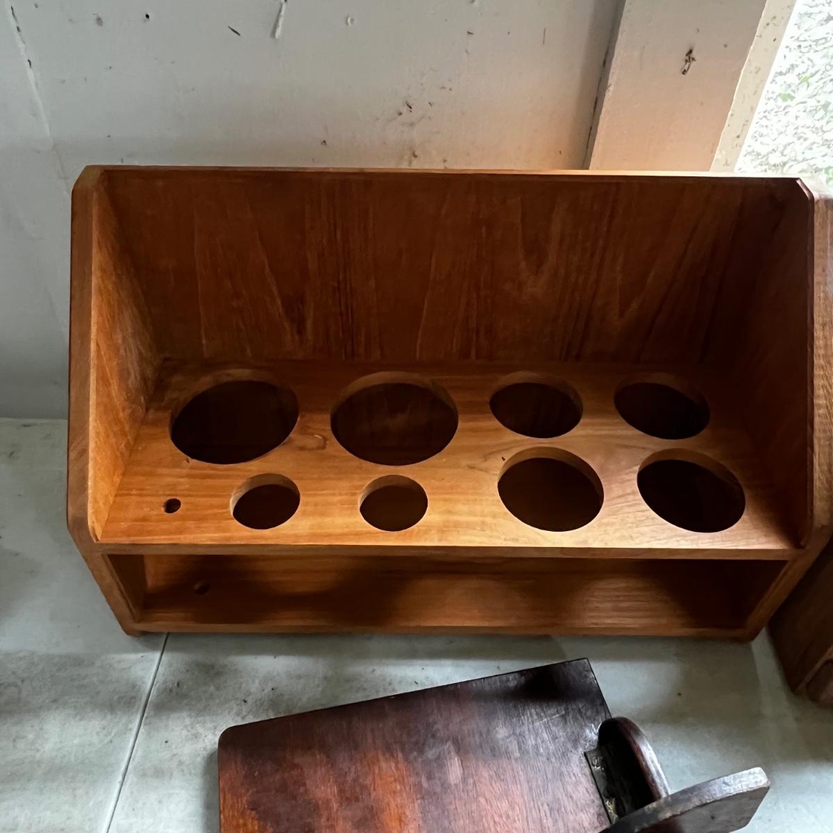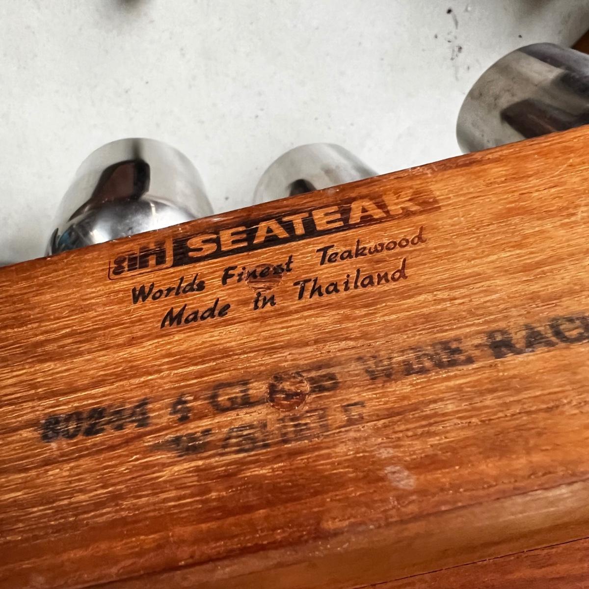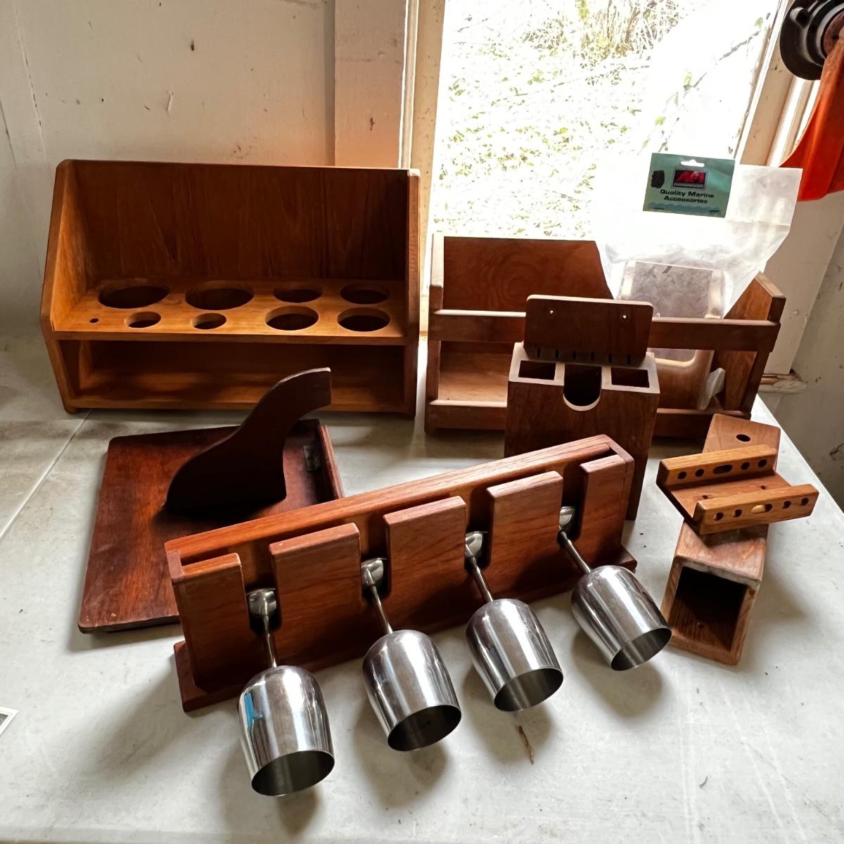 The boat shelves are all teak and ready to hang. There is a shelf with holes for sauces, rectangular wall box, and a brand new VHF radio holder, wine glass rack with 4 silver plate goblets, silverware rack, small wench hand holder.