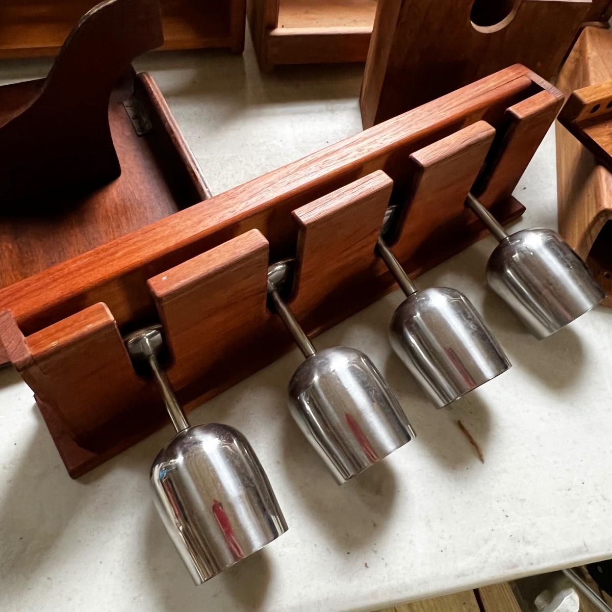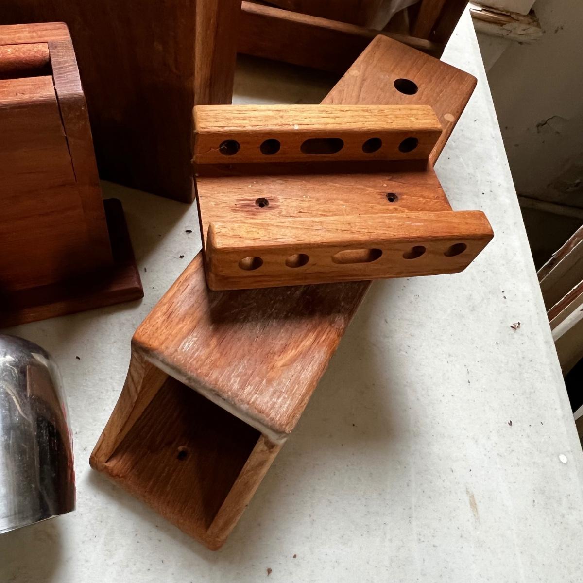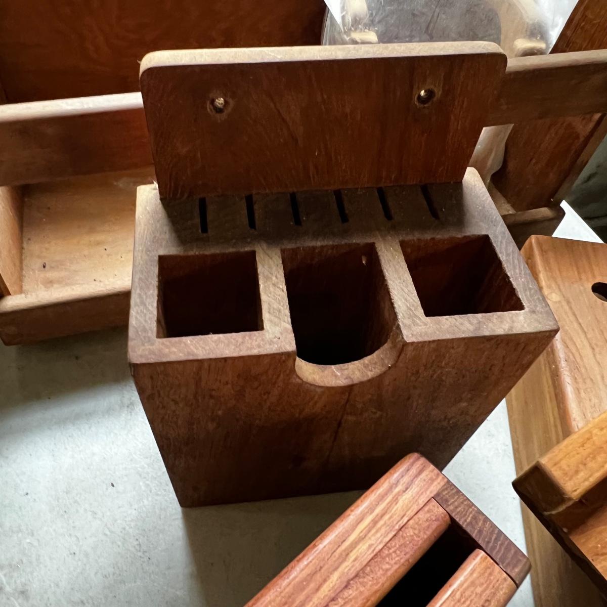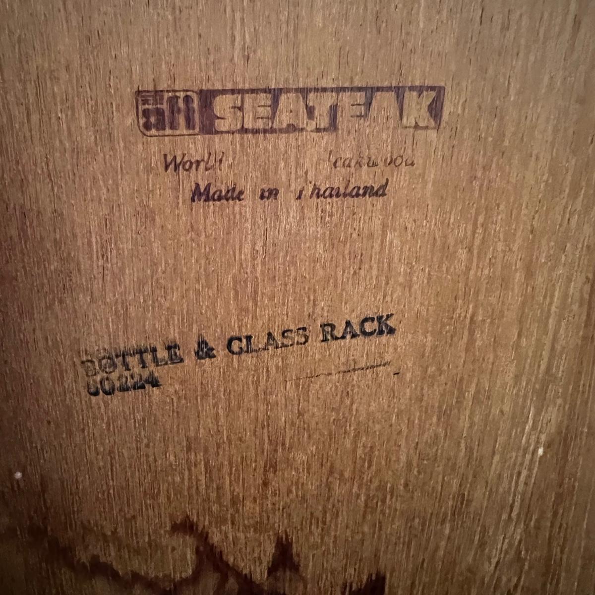 The boat shelves are all teak and ready to hang. There is a shelf with holes for sauces, rectangular wall box, and a brand new VHF radio holder, wine glass rack with 4 silver plate goblets, silverware rack, small wench hand holder.