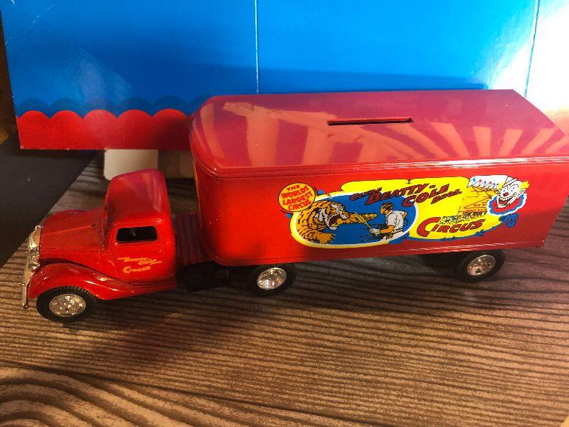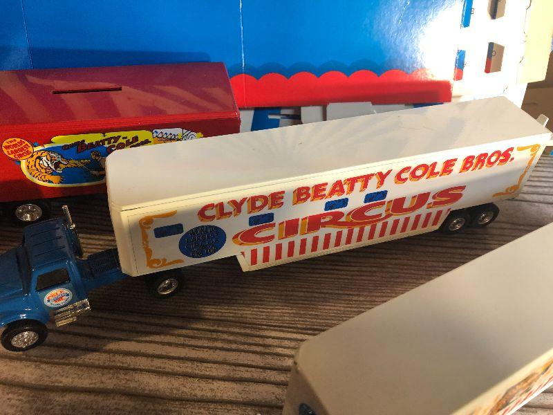 This lot includes Ertl Diecast Beatty Cole Circus trucks, and the red one is a bank. These have been opened but still look new. Please see pics for exact content of this lot, condition of the items, and sizes if needed. Thank you for looking and have fun bidding.
