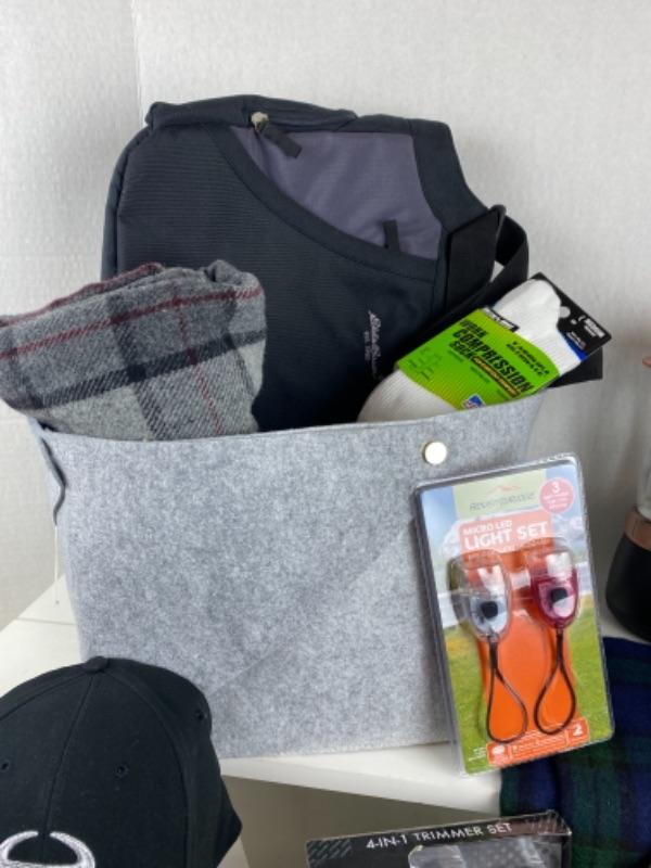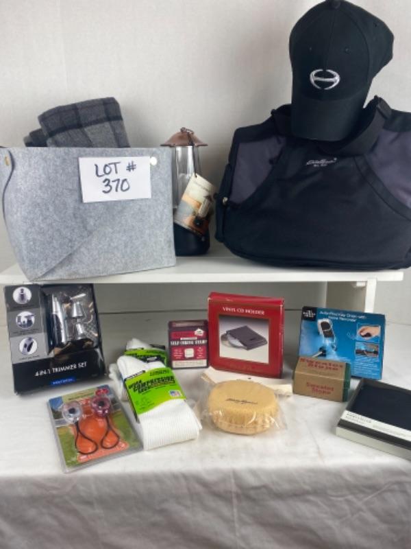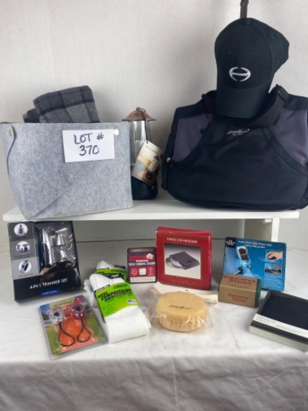 Eddie Bauer Lunch Tote with Rhino Hat, scarves, wool blanket, wool basket, ink pen, Trimmer Set, cd holder, sweater stone , lantern