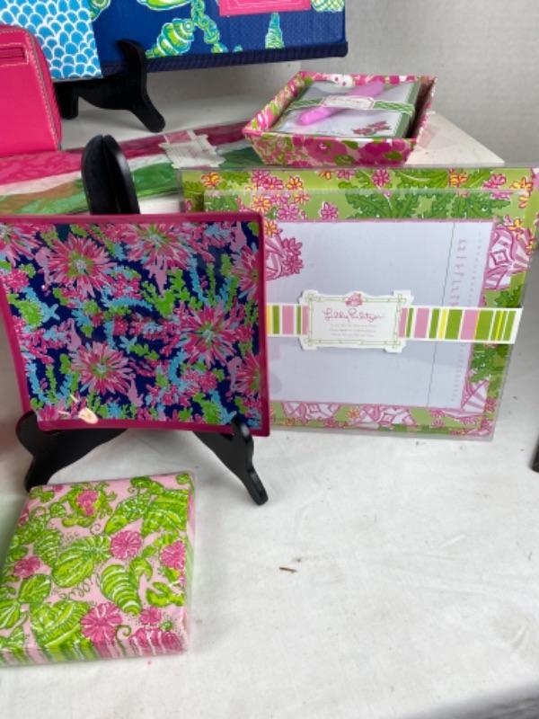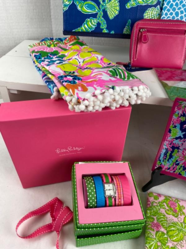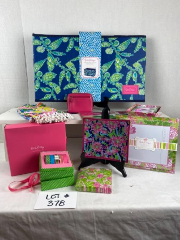 Lilly Pulitzer Gift Lot with plate, note pad, pastel colored watch, napkins, baakgaard wallet, tissue and more