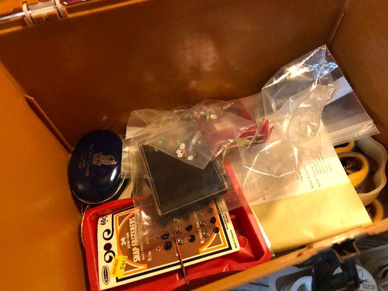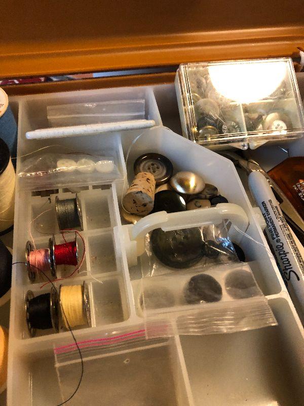 Thread, Bobbins, Scissors and more. Great kit with everything for a person who sews. Please see pics for exact content of this lot, condition of the items, and sizes if needed. Thank you for looking and have fun bidding.