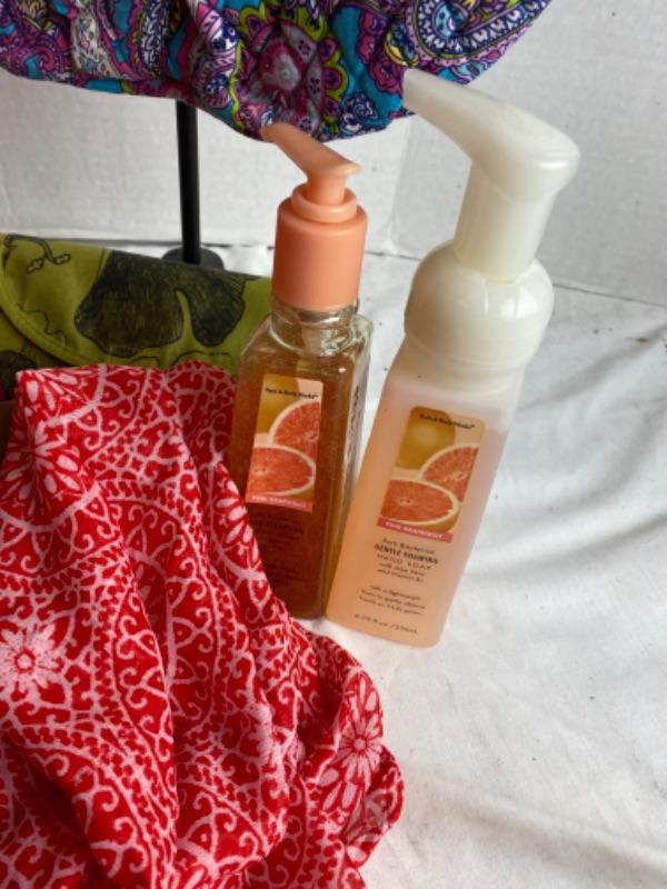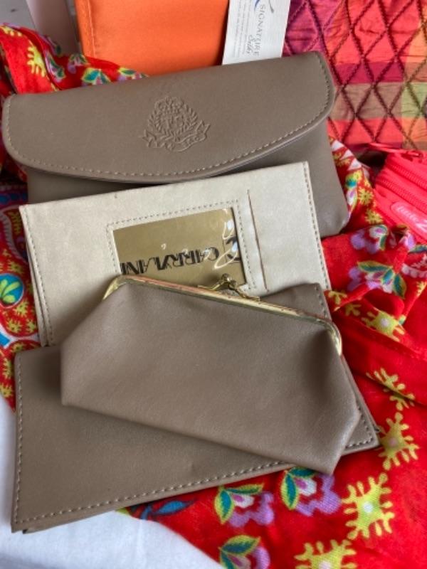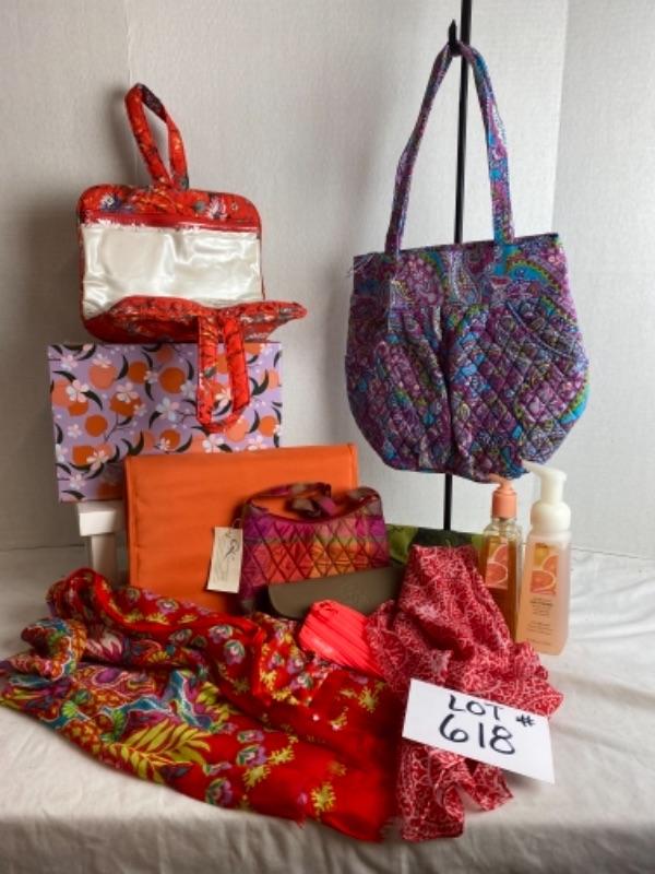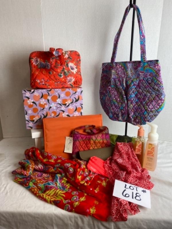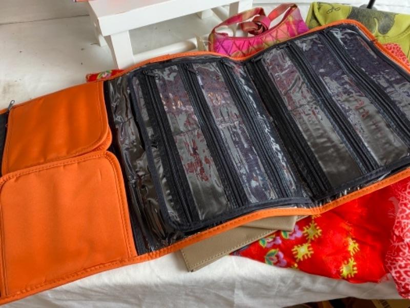 Orange travel jewelry case and makeup case , index card box, leather wallet with checkbook inserts, small hand bag, purple paisley print quilted bag, Bath and Bodyworks hand soap, two scarves and much more