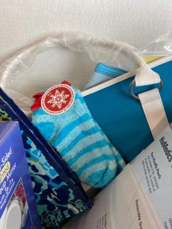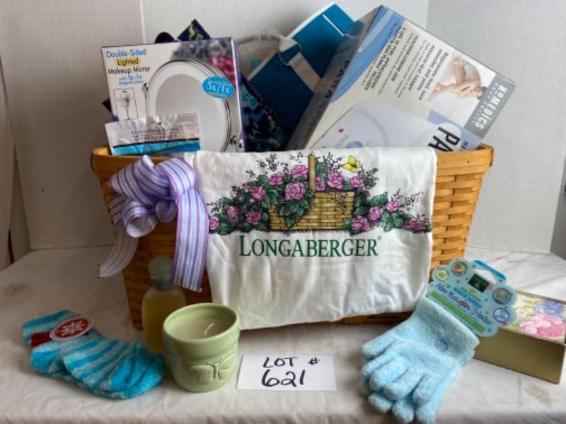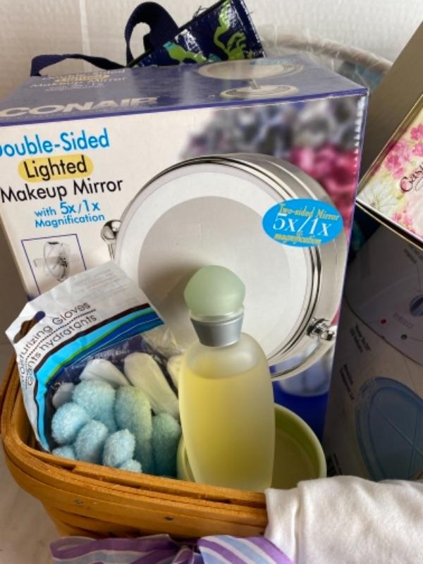 Large Longaberger gift basket with paragon bath , Double sided lighted makeup mirror, tote bag, candle, perfume by L.L. Bean, socks, aloe moisture gloves, longaberger shirt size extra large and much more