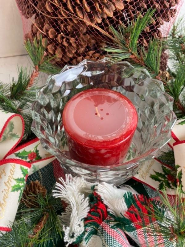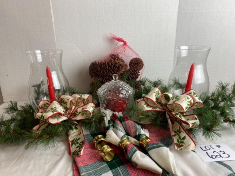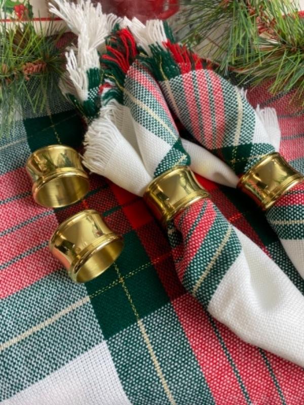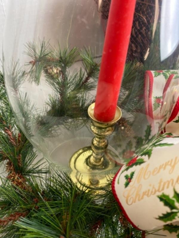 Pair of Baldwin brass candlesticks with hurricane Globes, set of four Baldwin napkin rings, with plaid tablecloth, bag of pinecones, glass votive with candle