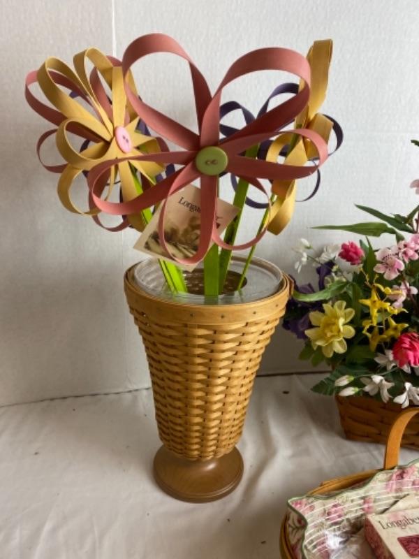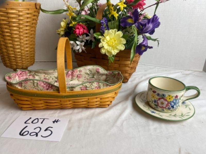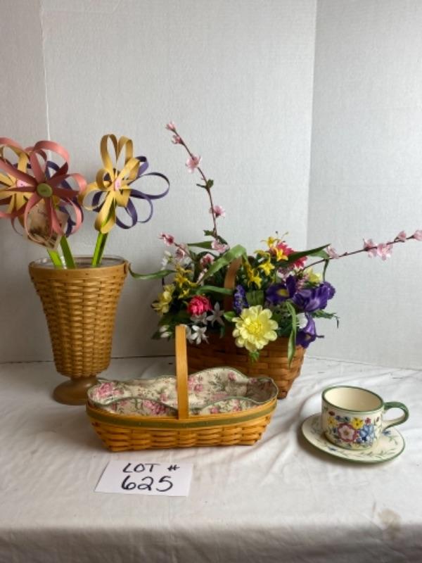 Néw with Box Longaberger 6 wooden button flowers (signed) in tall basket with peony basket and floral arrangement in handled basket with cup and saucer