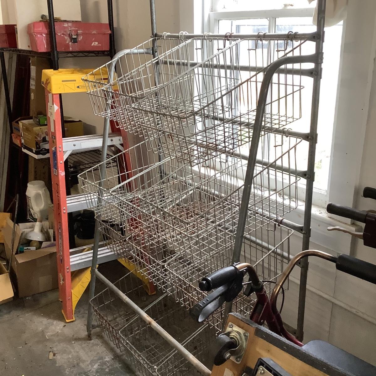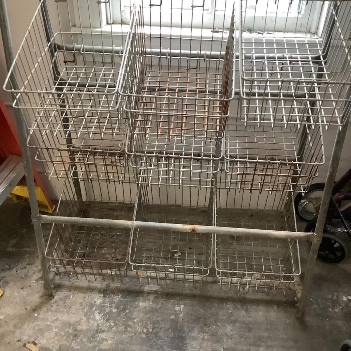 Has 12 baskets and measures 64" high x 3' wide x 18" deep @ bottom