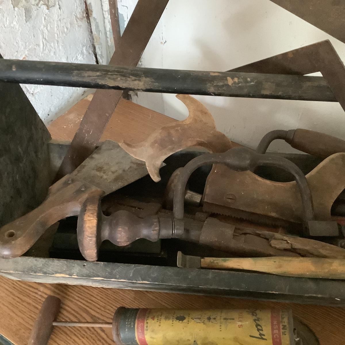 Vintage tools with wooden carry box