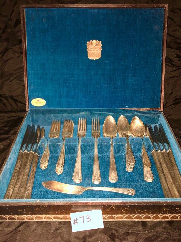 W.A Rogers and community plated silverware set in wooden blue velvet case this is a mixed set Contains 53pcs- 8 large spoons 8 small spoons 8 large forks and 8 small forks and 8 butter knifes plus 4 extra forks and a butter knife