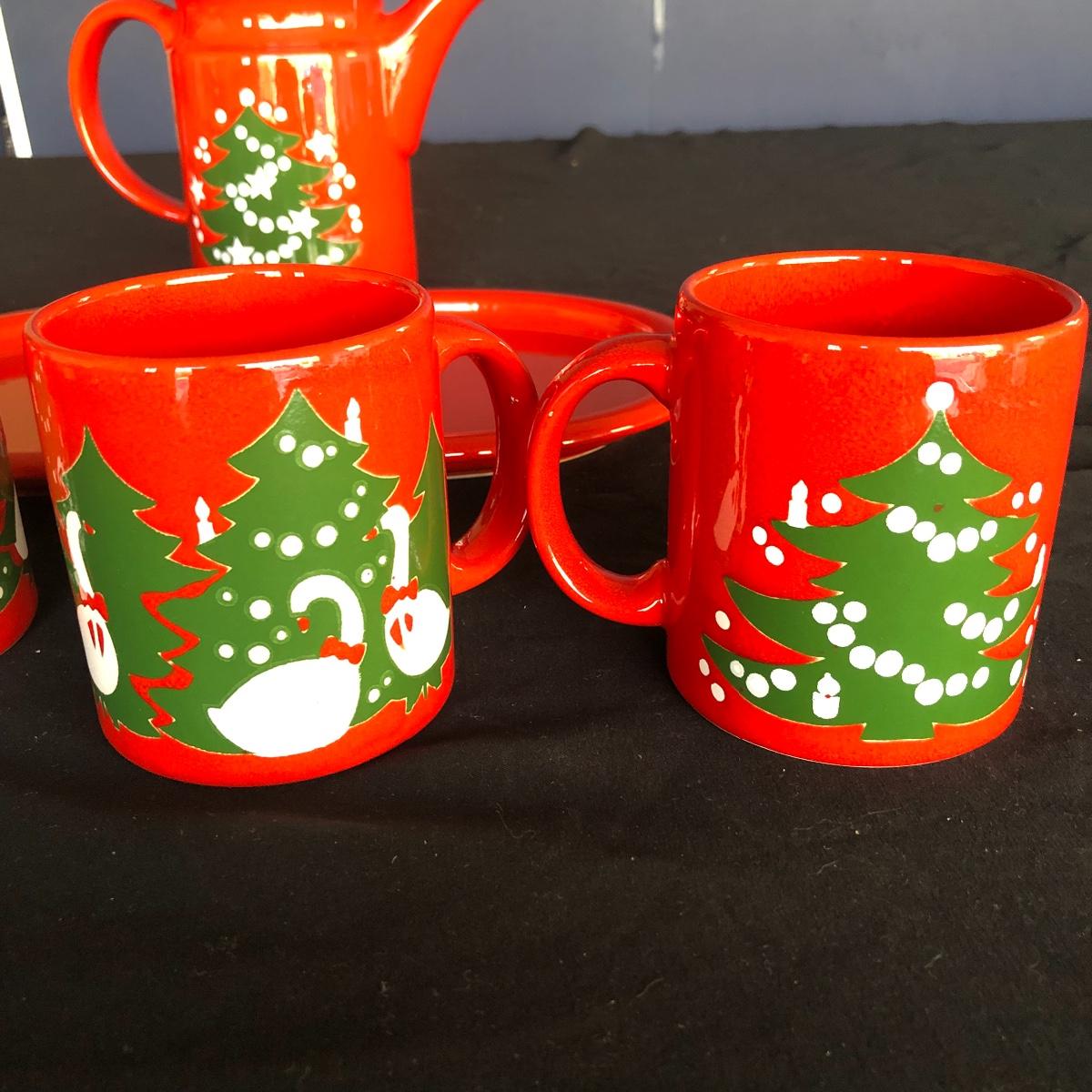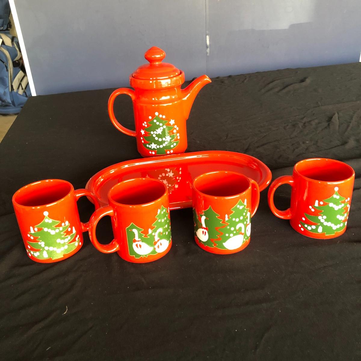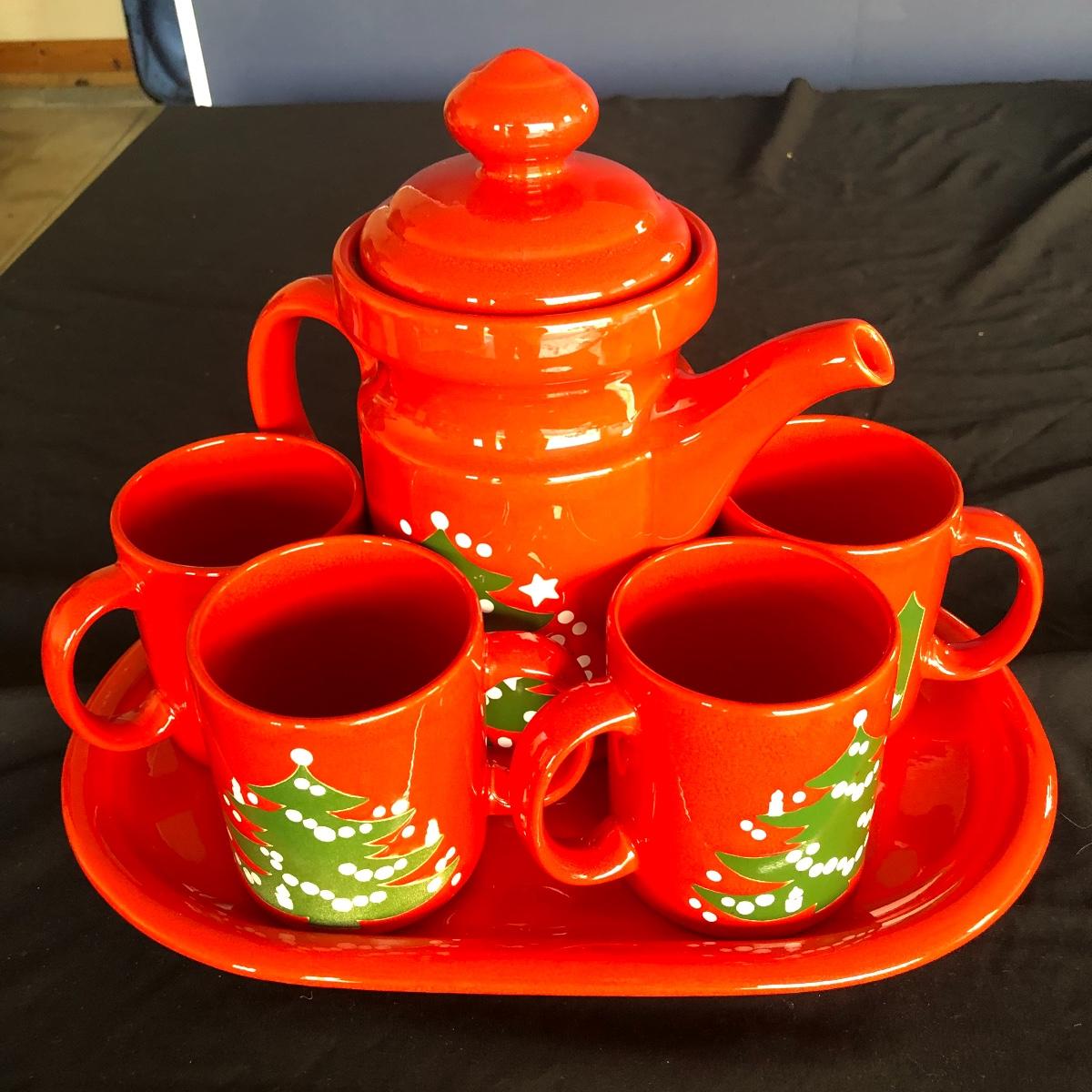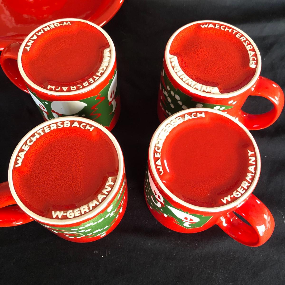 Waechtersbach W. Germany Christmas Coffee Set. This set includes four coffee mugs, a coffee pot (4.5” in diameter and 9.5” tall) and serving tray (14” x 9”.) Shipping Available.