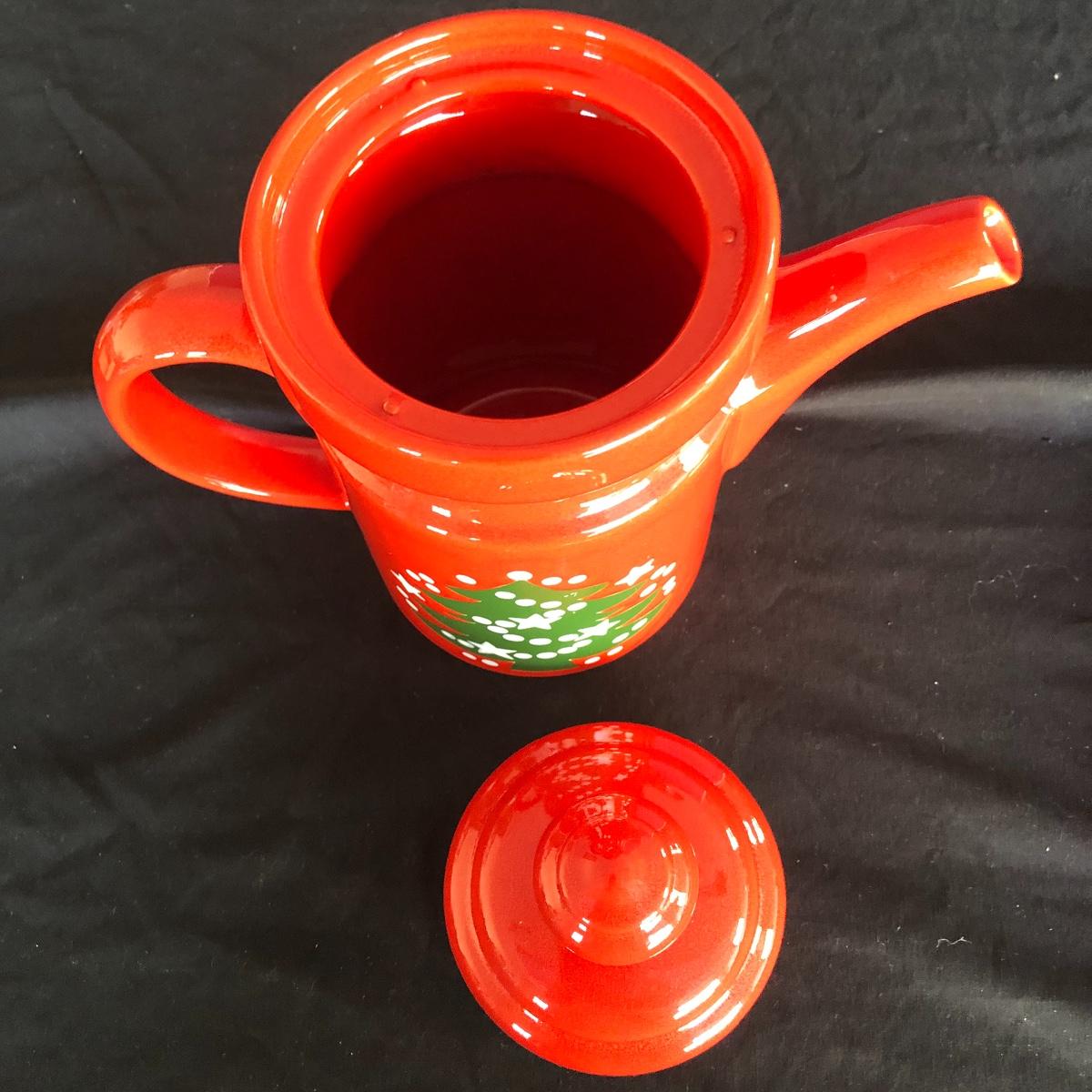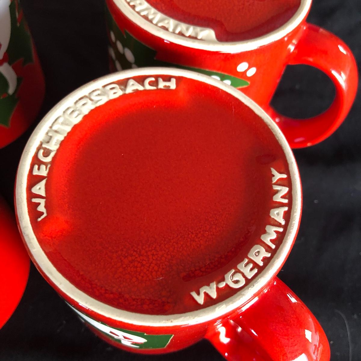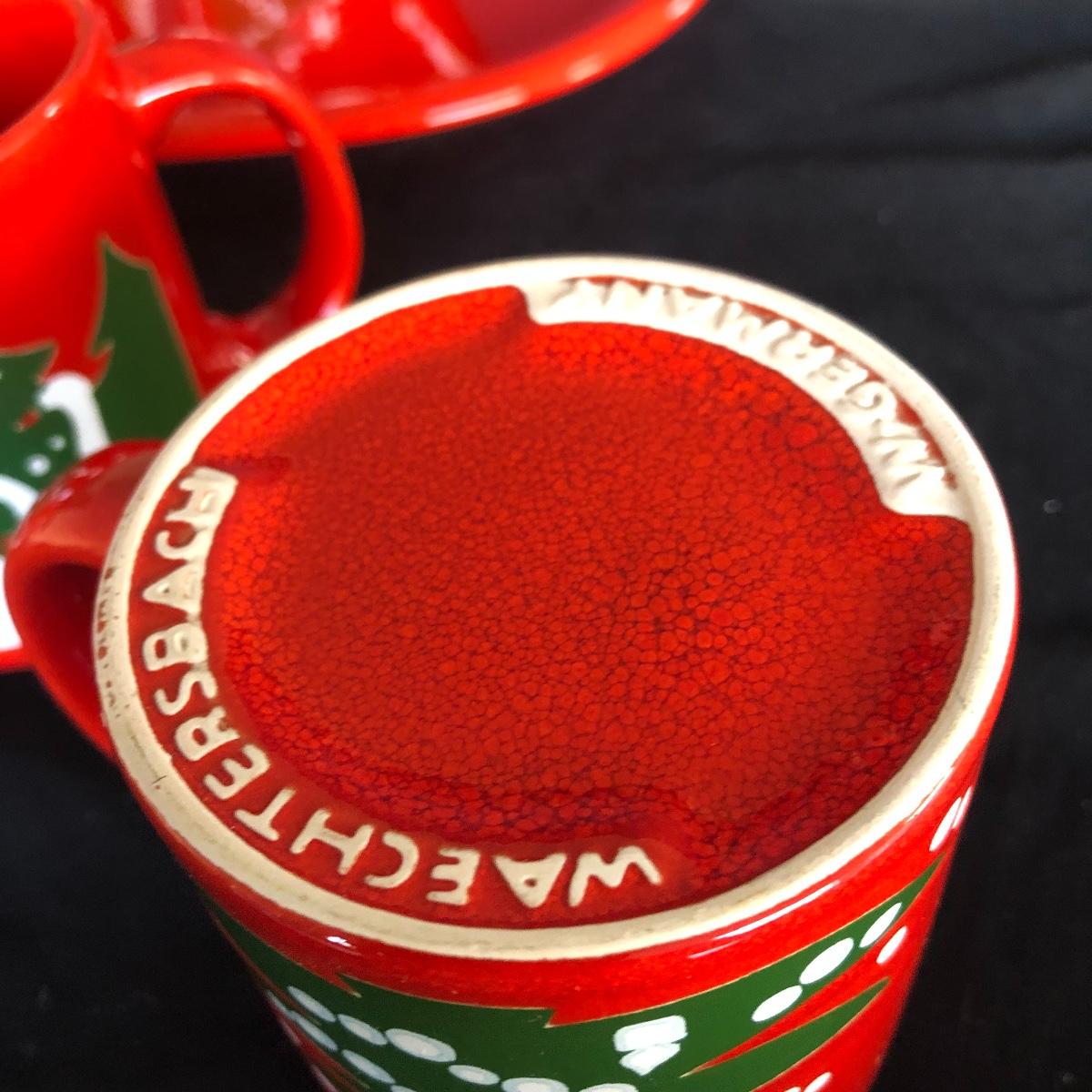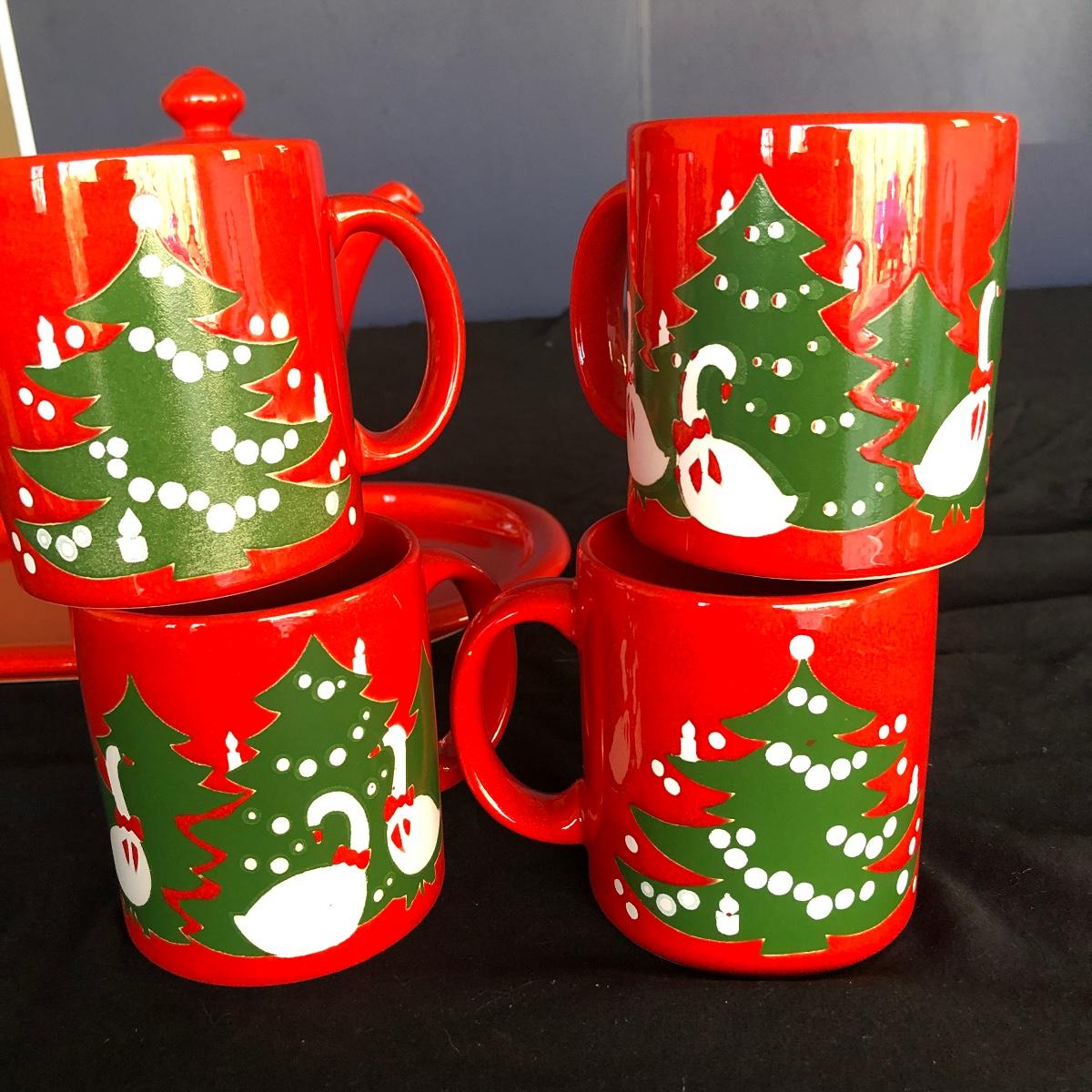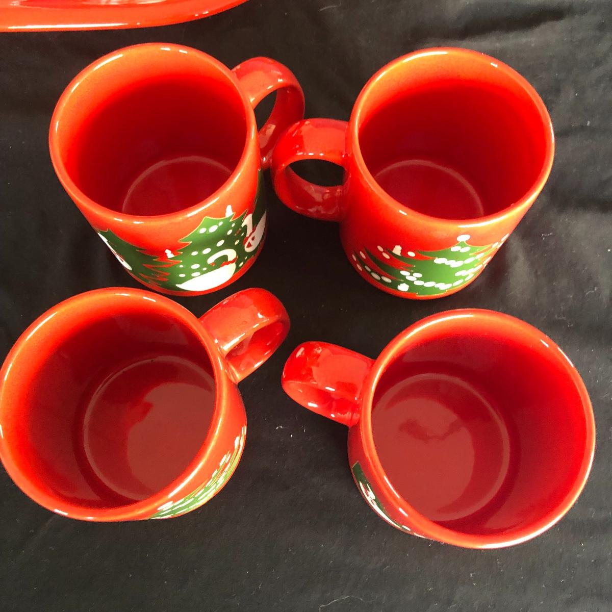 Waechtersbach W. Germany Christmas Coffee Set. This set includes four coffee mugs, a coffee pot (4.5” in diameter and 9.5” tall) and serving tray (14” x 9”.) Shipping Available.