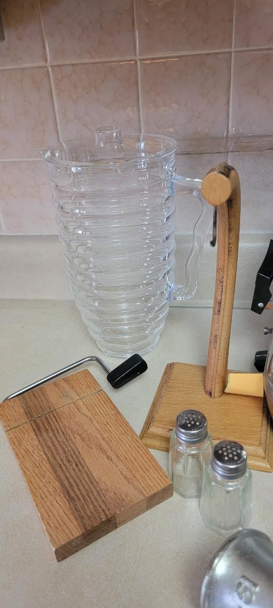 Two vintage waffle irons, Climax grinder, plastic pitcher, salt n pepper shaker