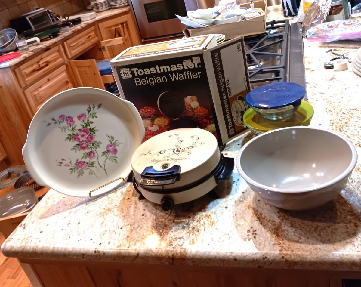 WAFFLE MAKER, 3 BOWLS AND A PLATTER
