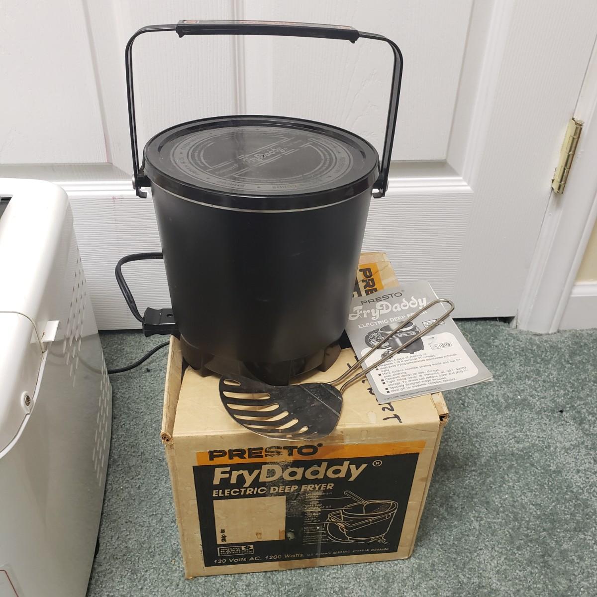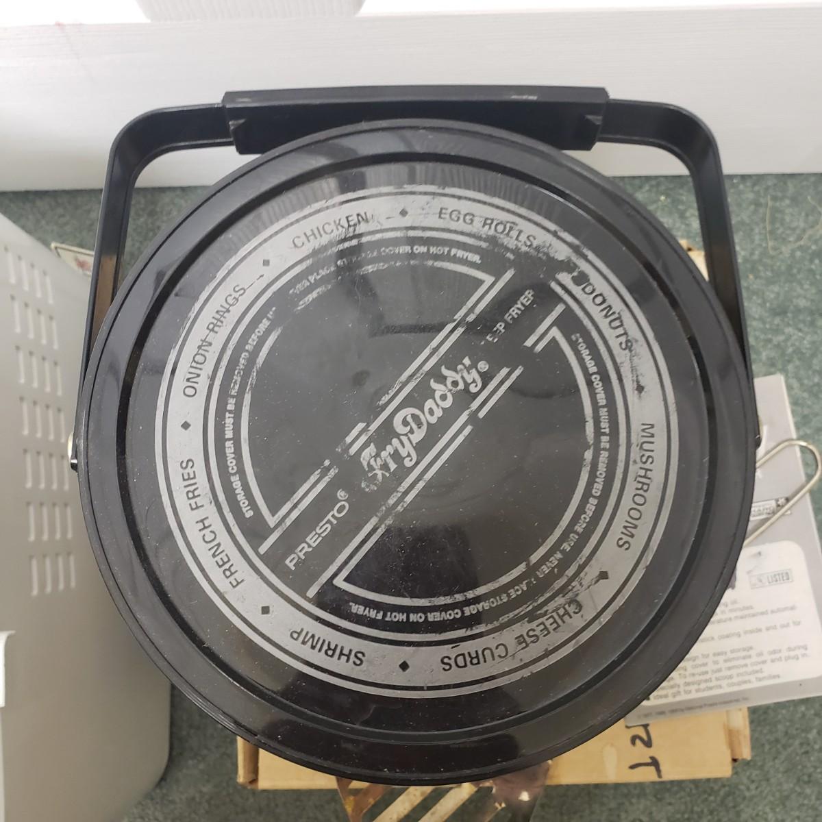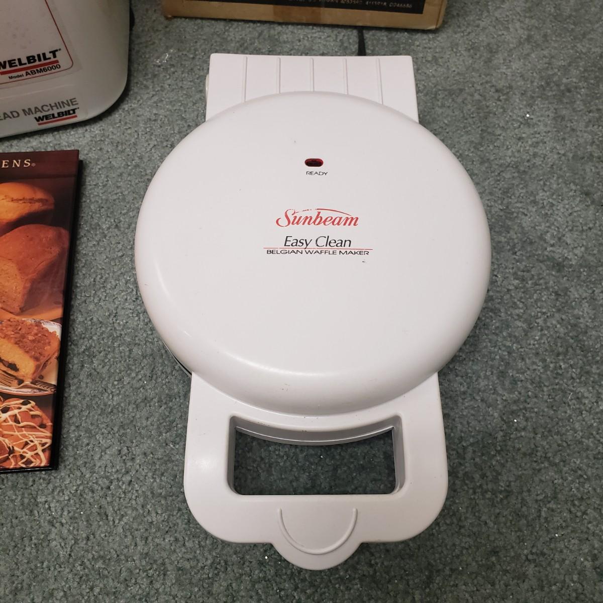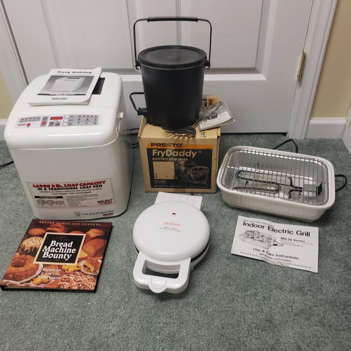 This kitchen device lot features a Sunbeam waffle maker with easy clean surface. A Welbilt 2lbs bread maker measuring 11" x 13" x 11"H. Also included is an indoor electric grill. The bottom is a white ceramic dish. Finally, find a Presto FryDaddy in its original box, directions and a metal scoop.