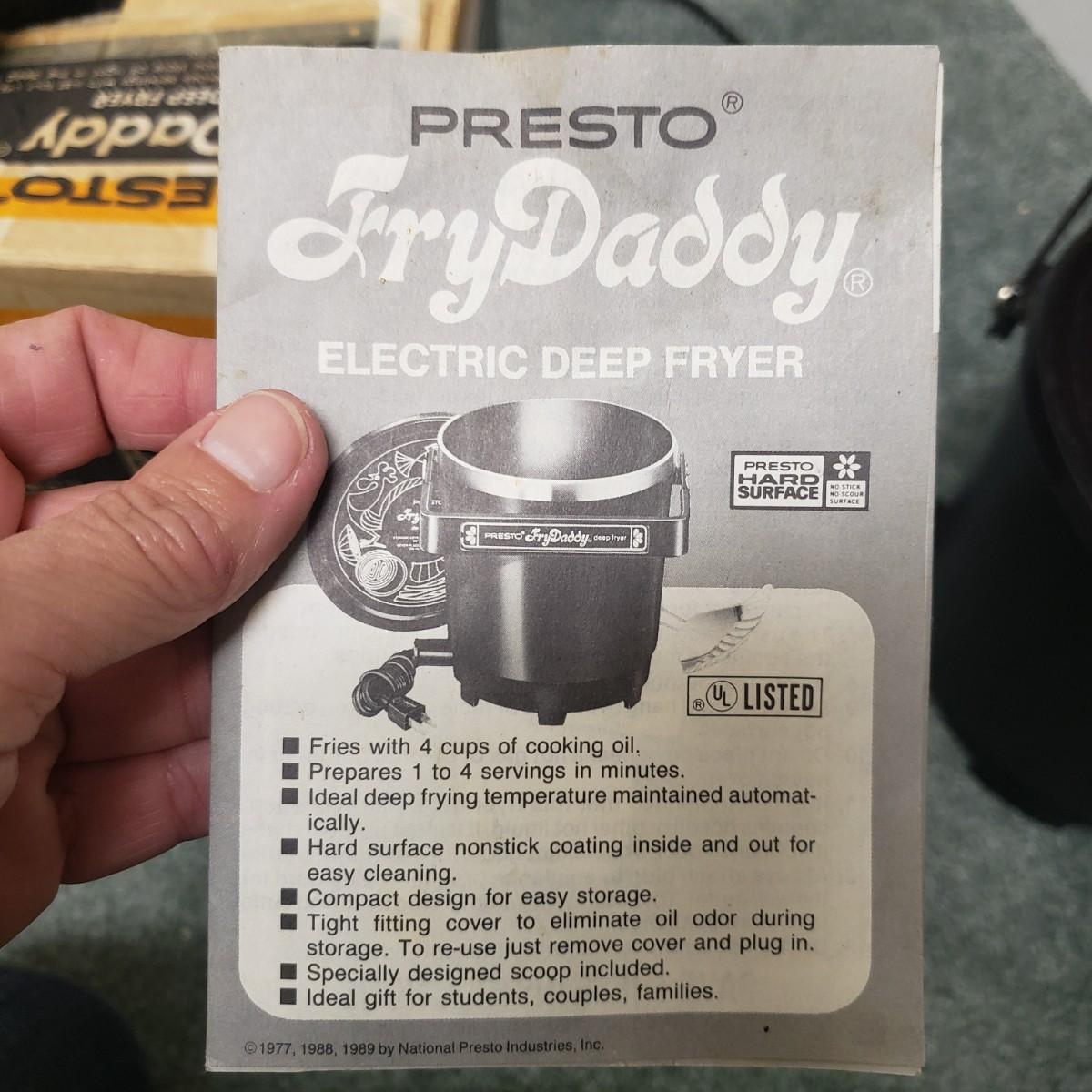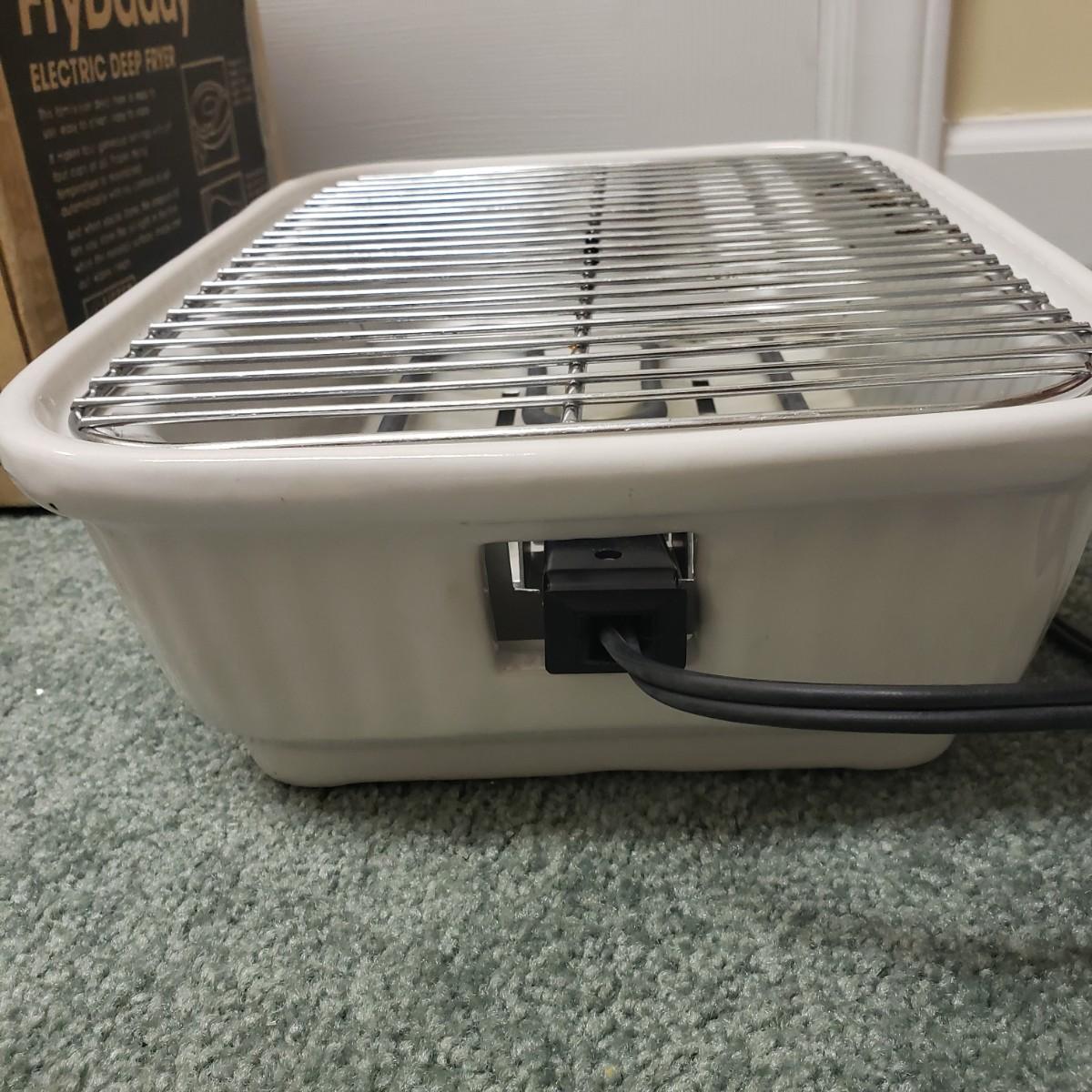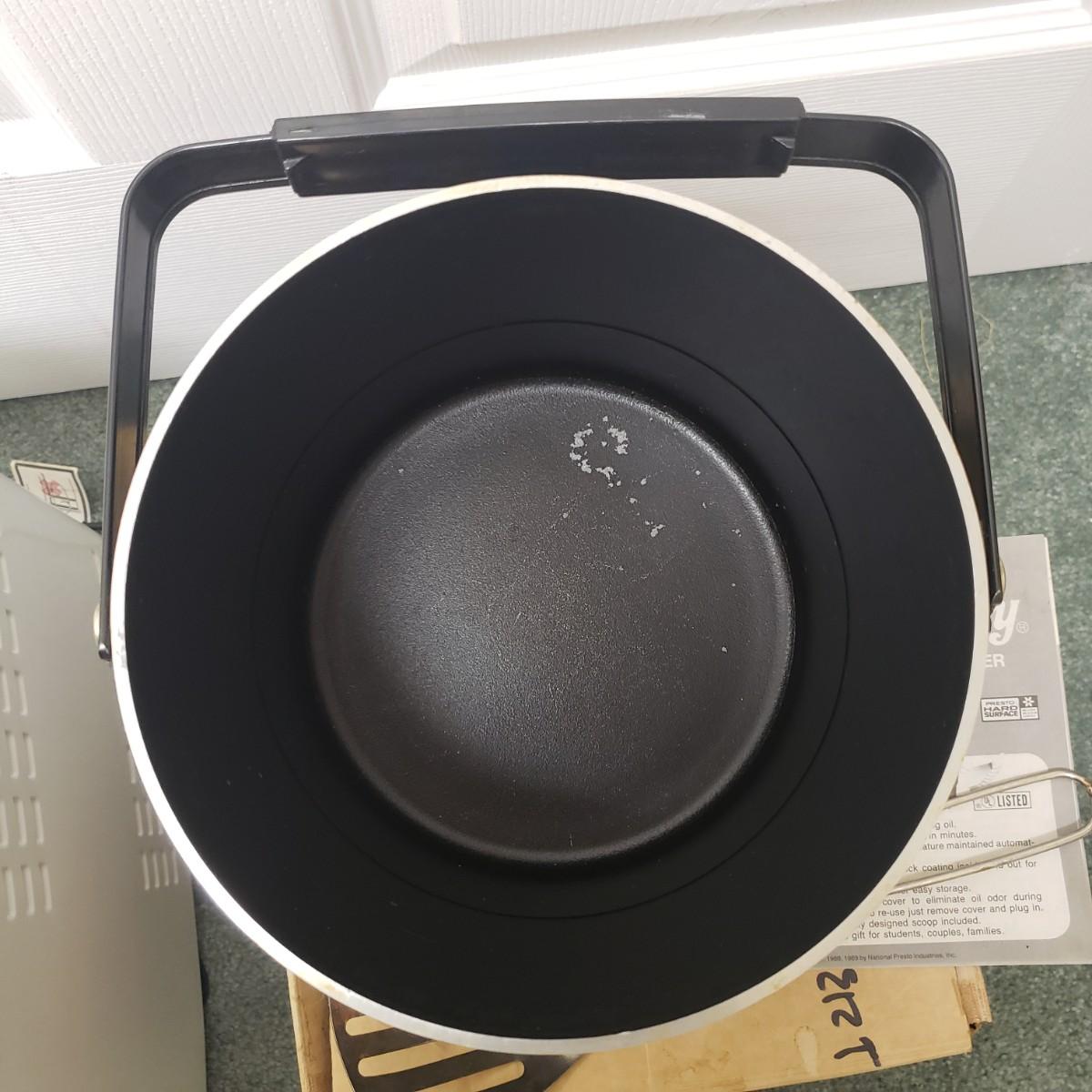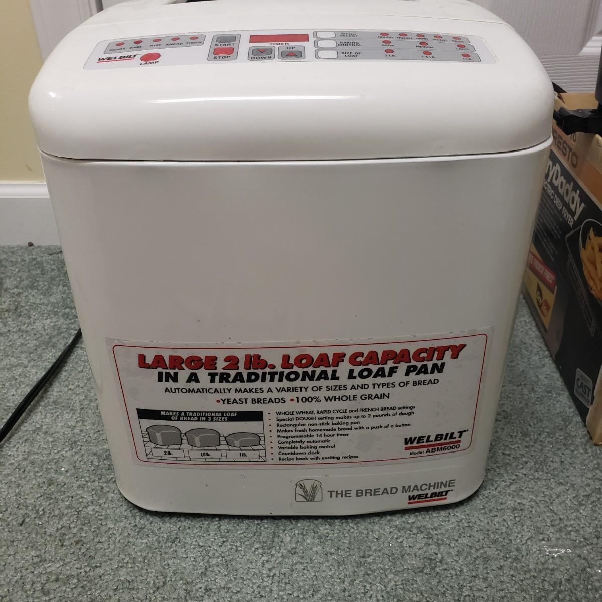 This kitchen device lot features a Sunbeam waffle maker with easy clean surface. A Welbilt 2lbs bread maker measuring 11" x 13" x 11"H. Also included is an indoor electric grill. The bottom is a white ceramic dish. Finally, find a Presto FryDaddy in its original box, directions and a metal scoop.