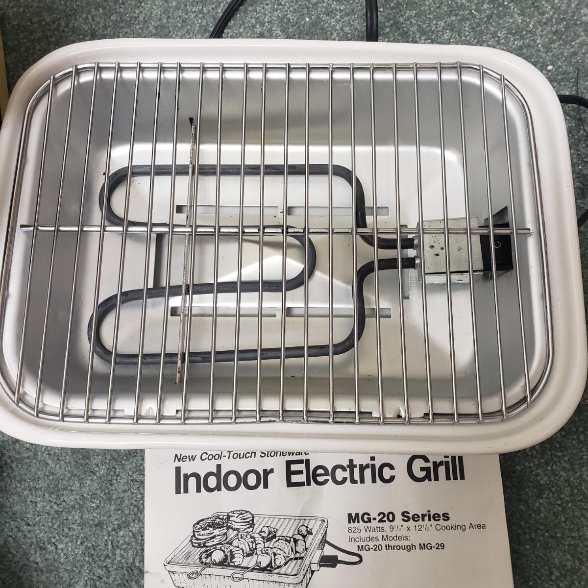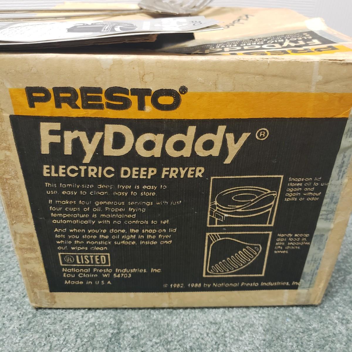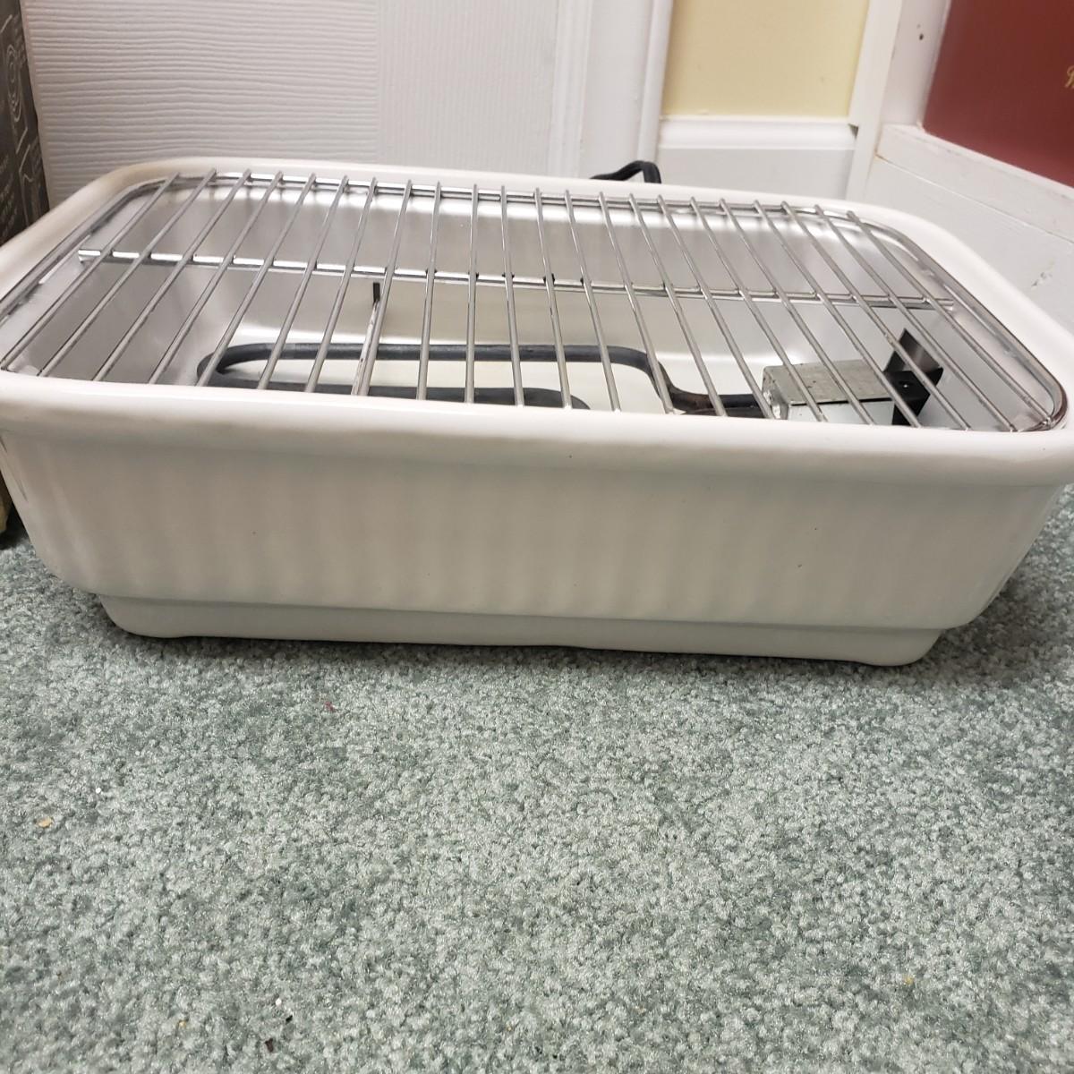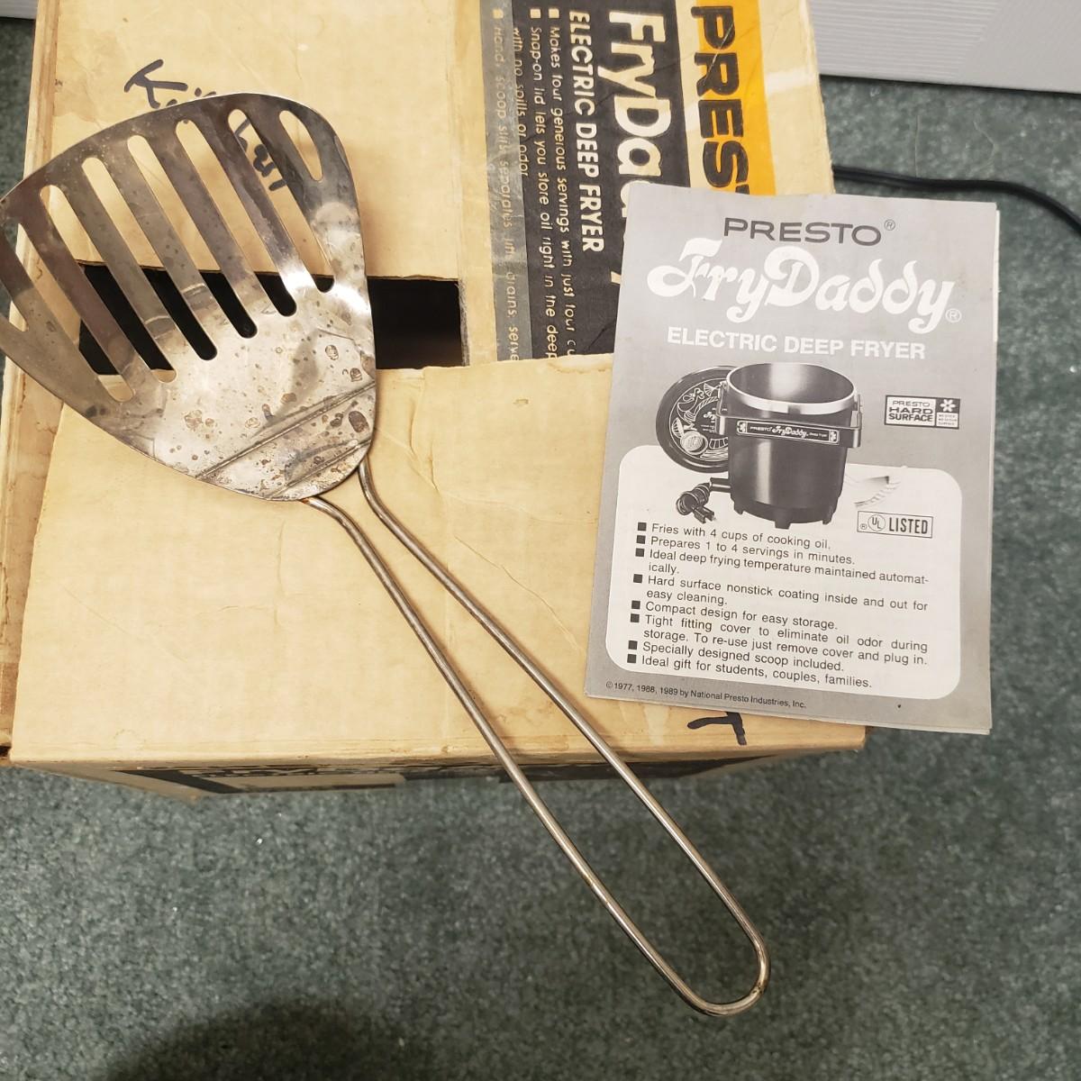 This kitchen device lot features a Sunbeam waffle maker with easy clean surface. A Welbilt 2lbs bread maker measuring 11" x 13" x 11"H. Also included is an indoor electric grill. The bottom is a white ceramic dish. Finally, find a Presto FryDaddy in its original box, directions and a metal scoop.