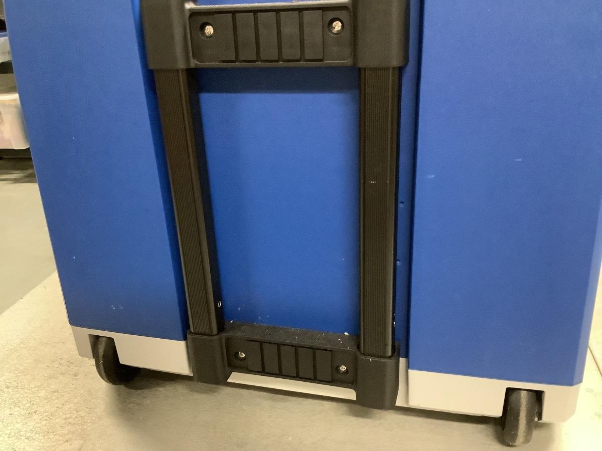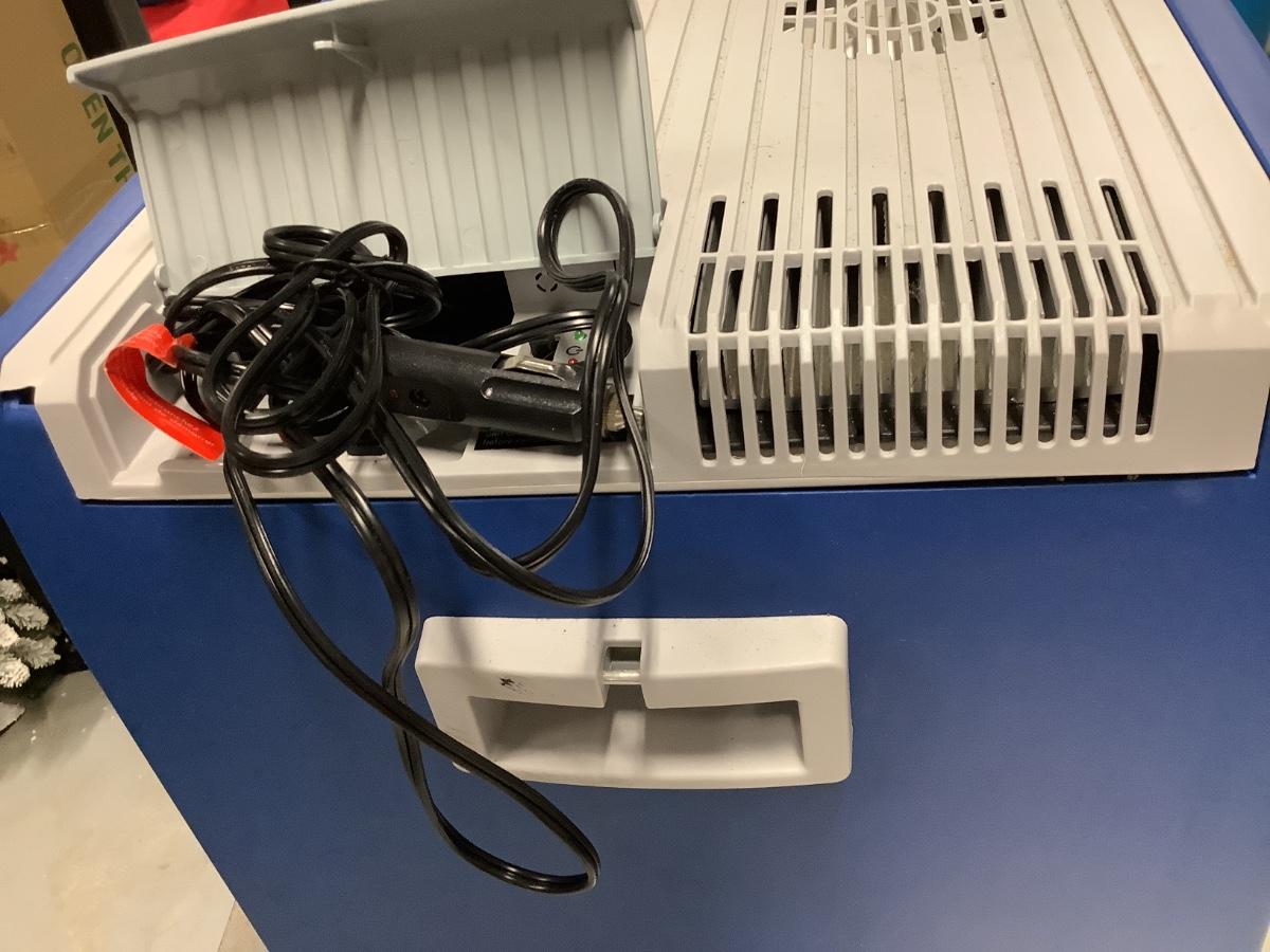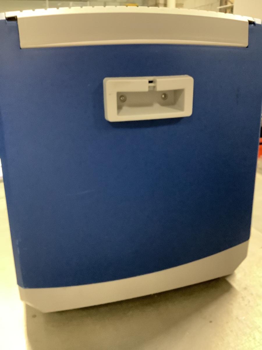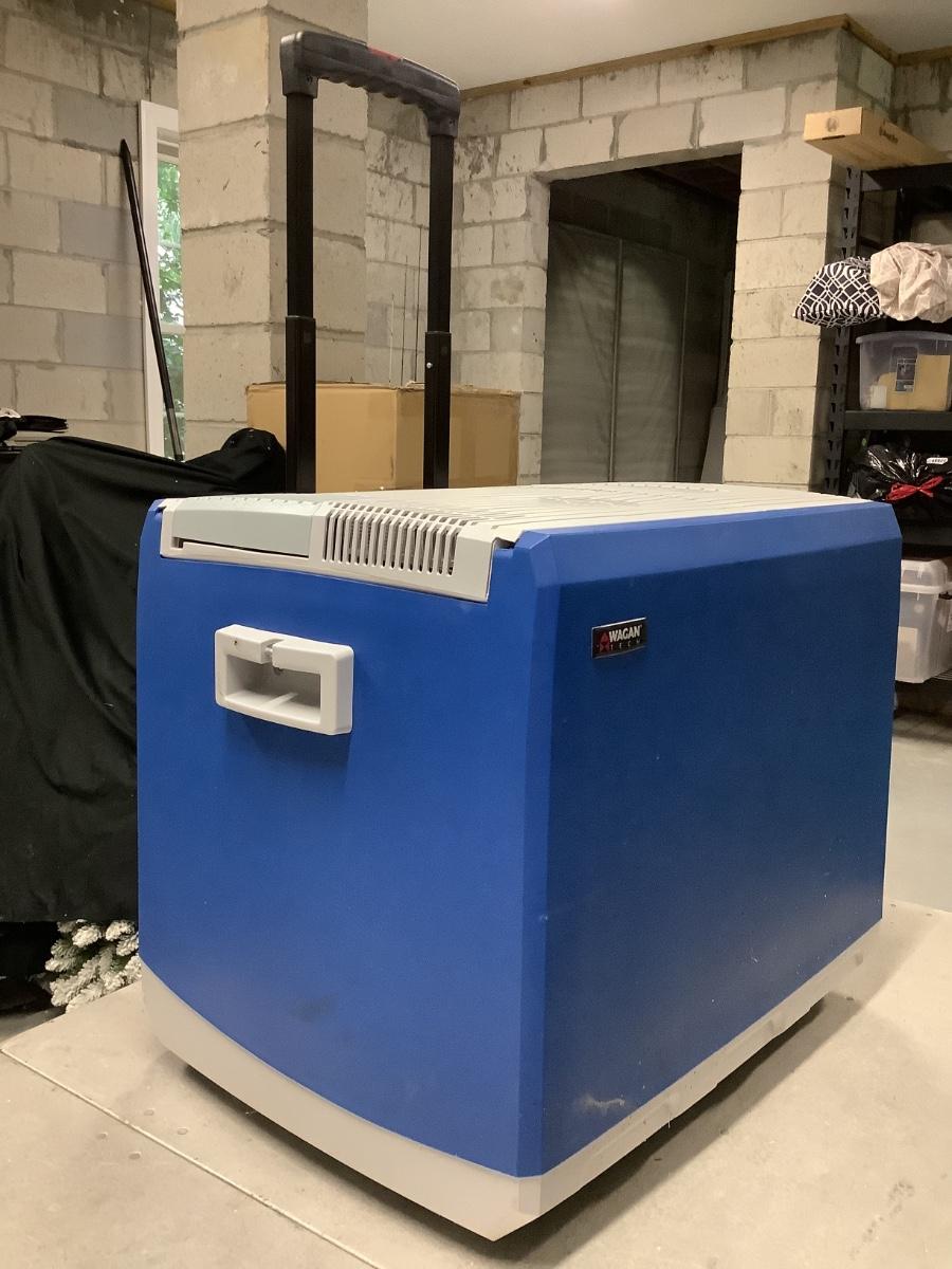 Wagan Tech car plug in cooler, pull handle on wheels, blue/grey-still smells new