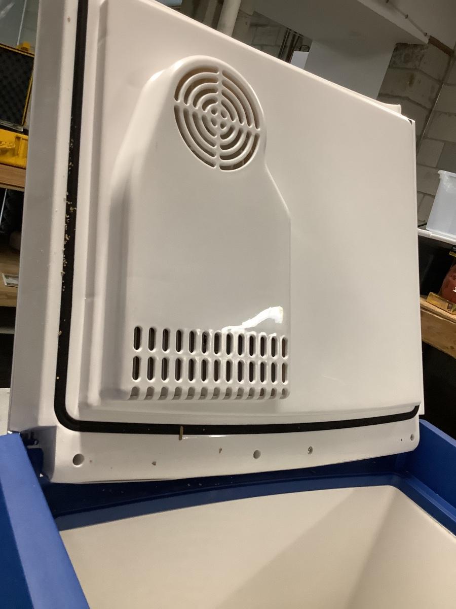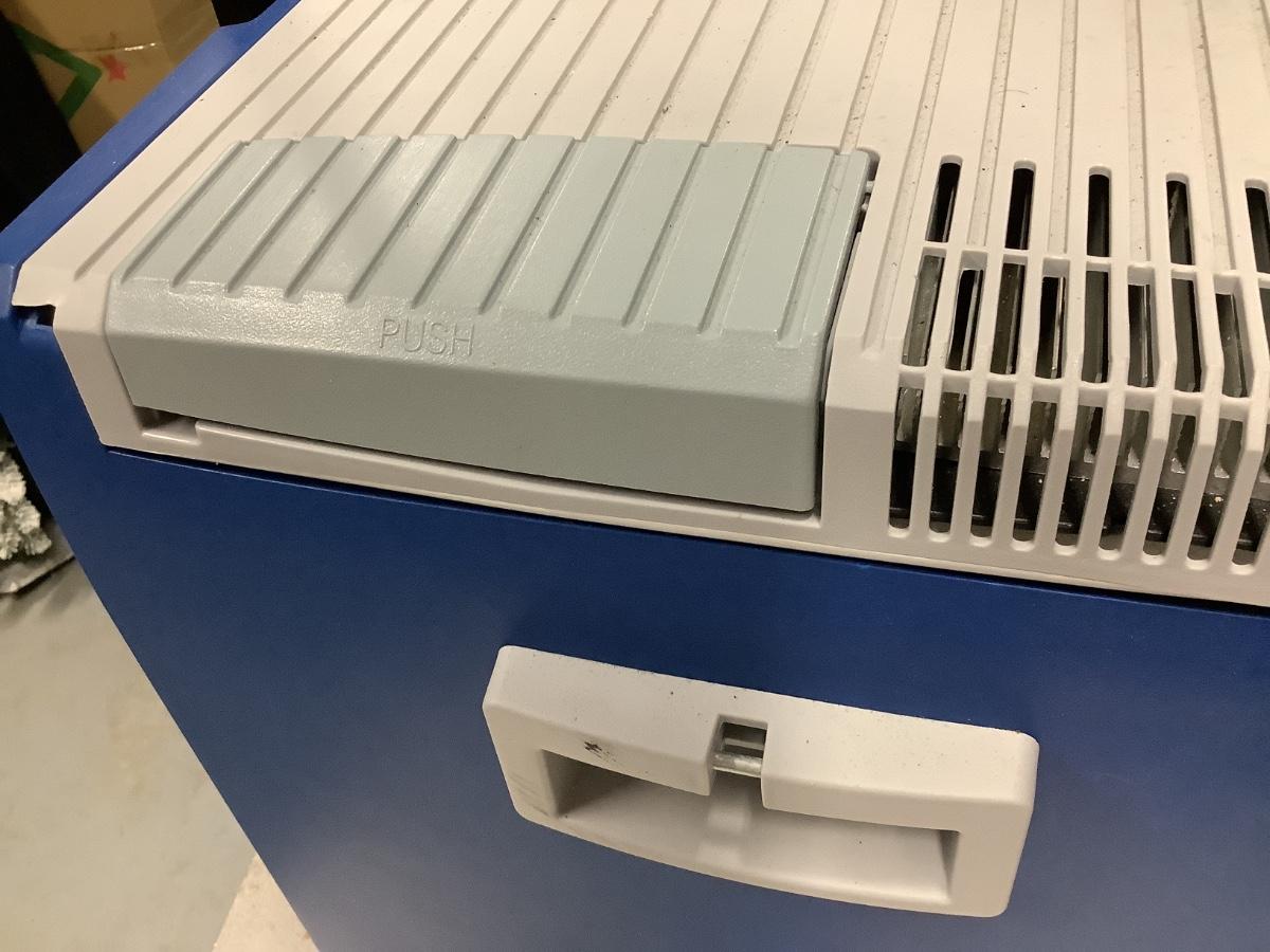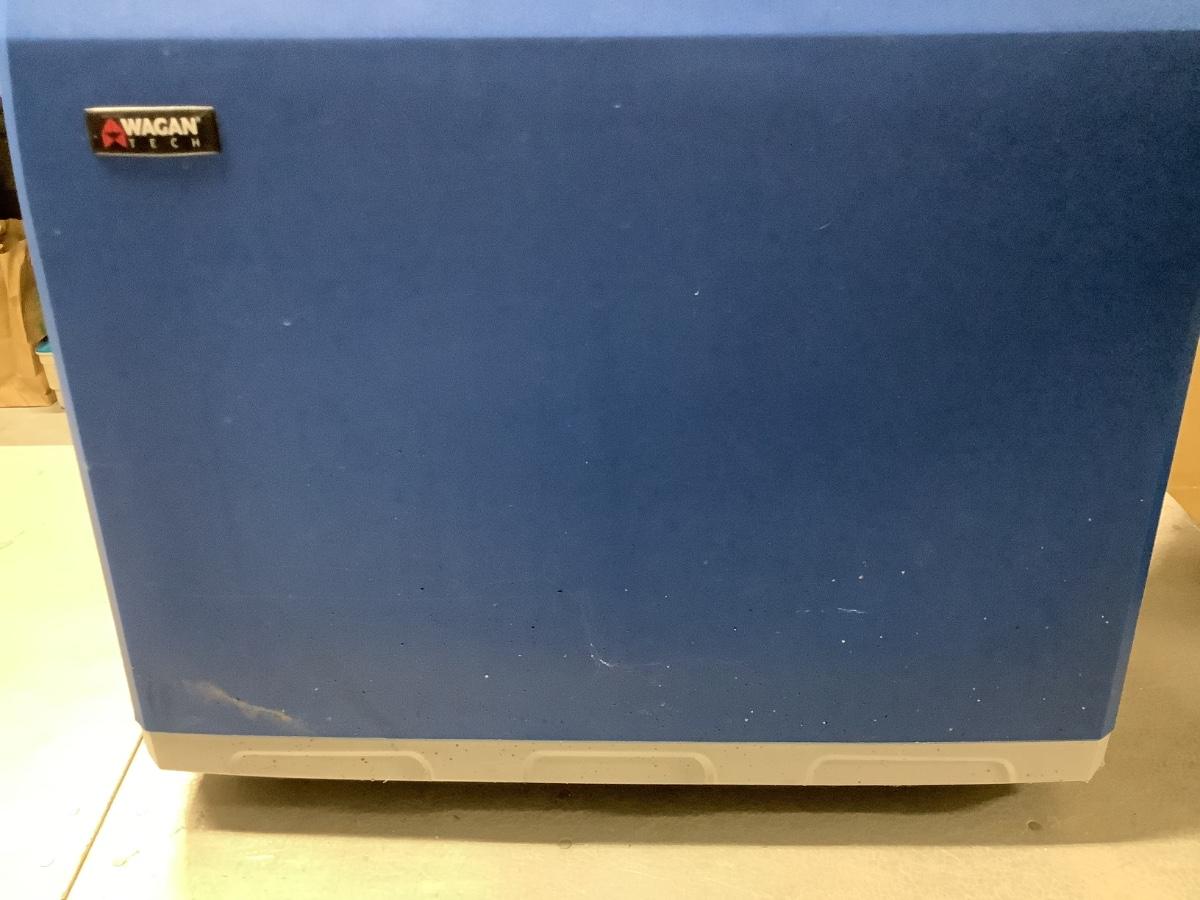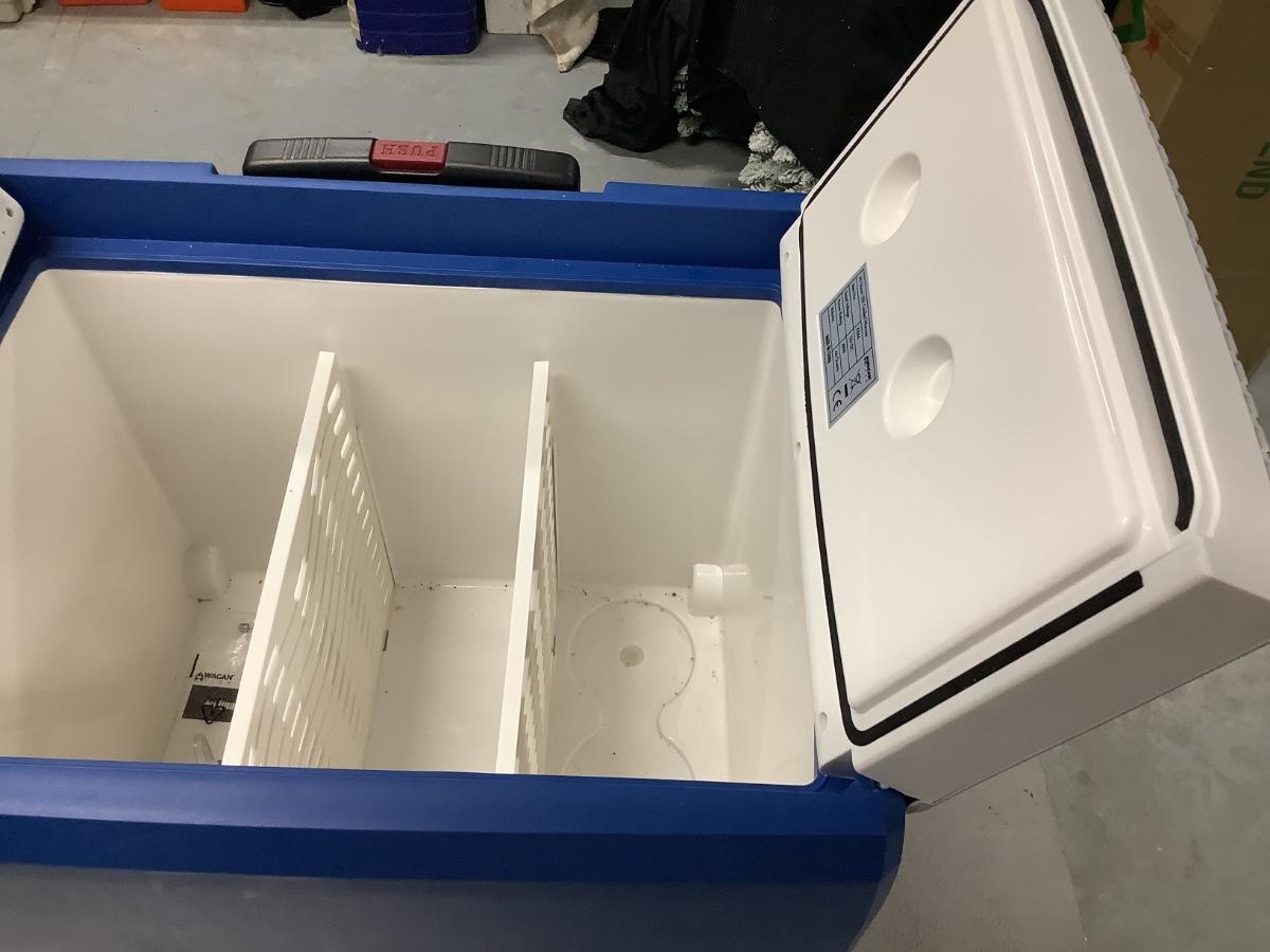 Wagan Tech car plug in cooler, pull handle on wheels, blue/grey-still smells new