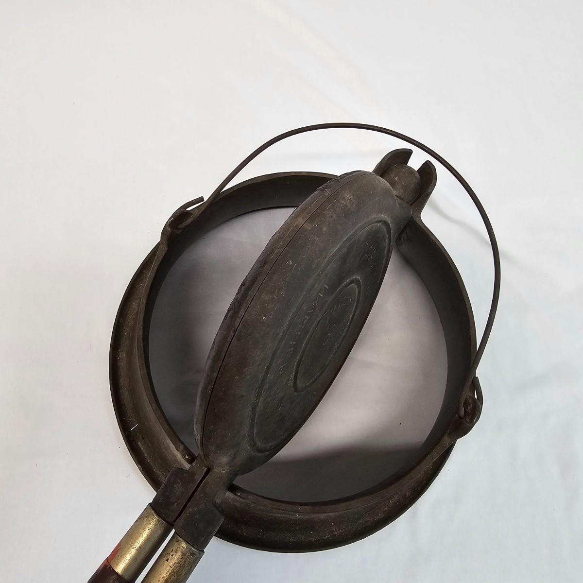 A vintage #8 Wagner waffle griddle with a stand. Both pieces cast iron, griddle is designed to turn and rotate while on stand for even cooking. Ends of griddle form a ball which rests on lip of support. Wooden handles on griddle and lifting bail on stand. Measures 10" x 24.5" x 5"H. See photos for details. Shipping available.
