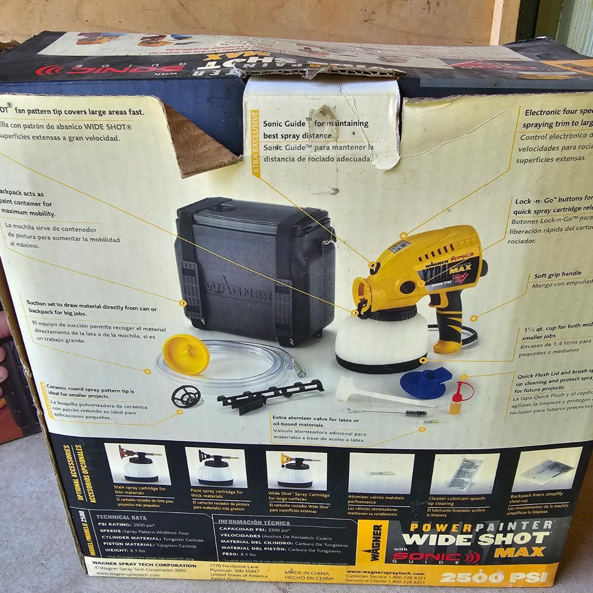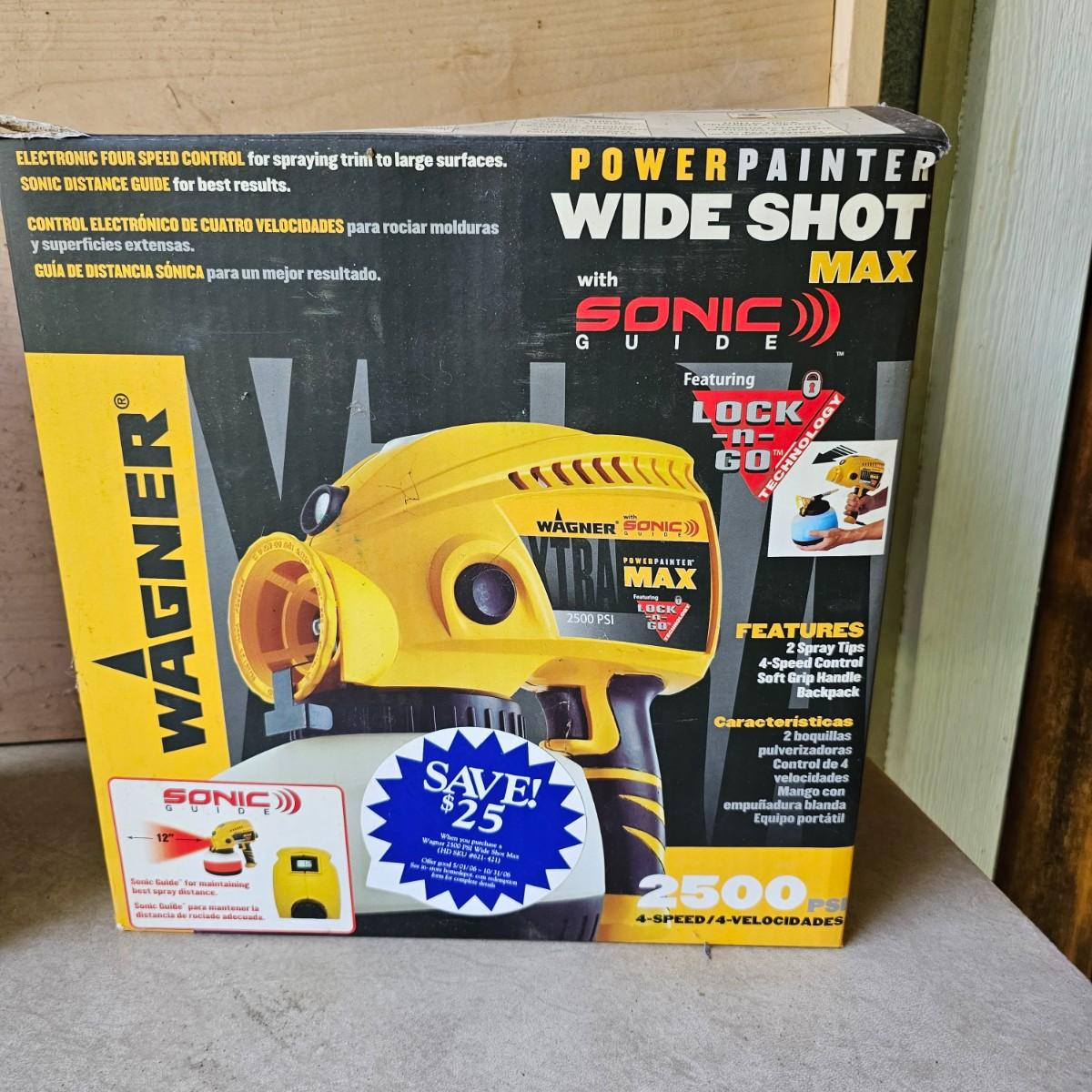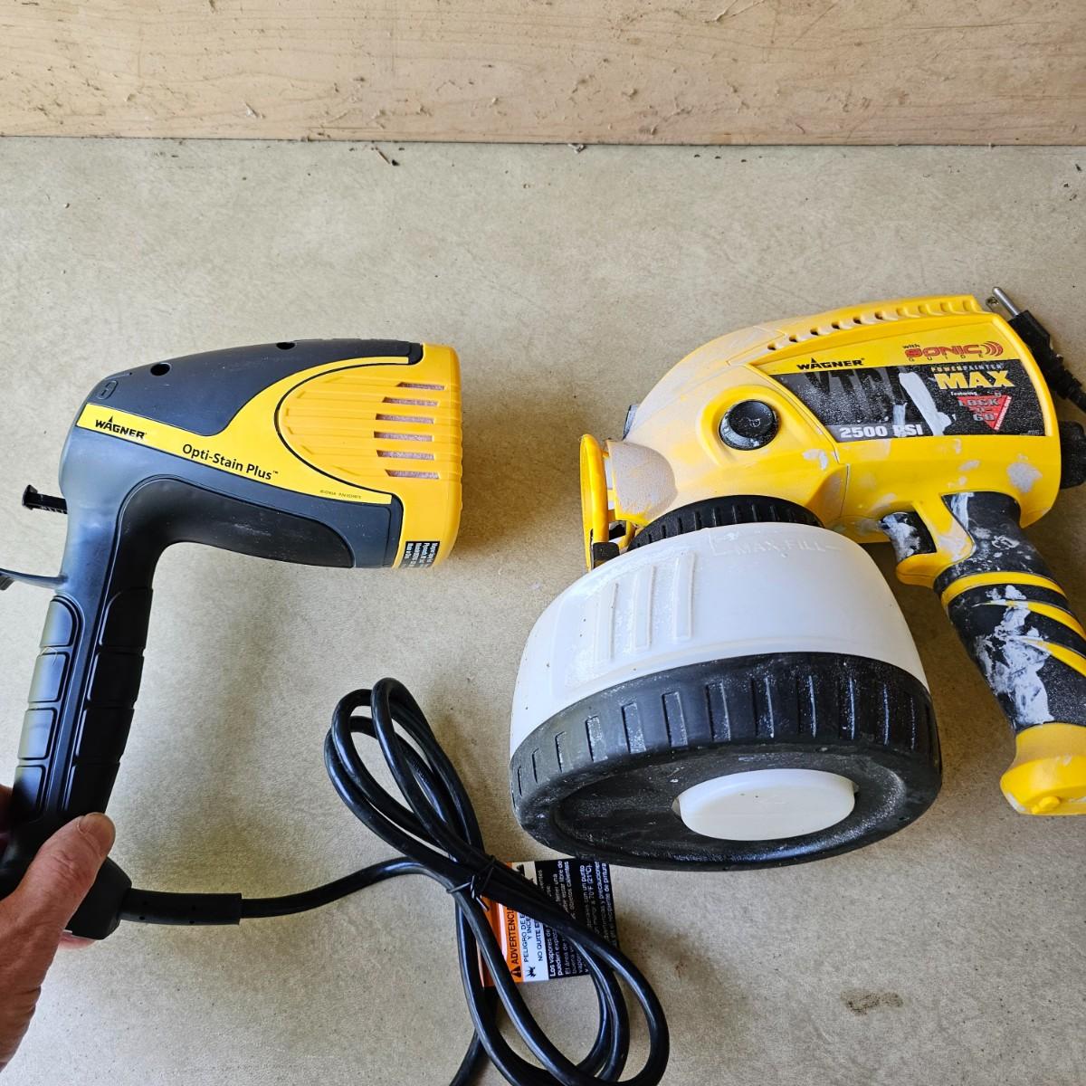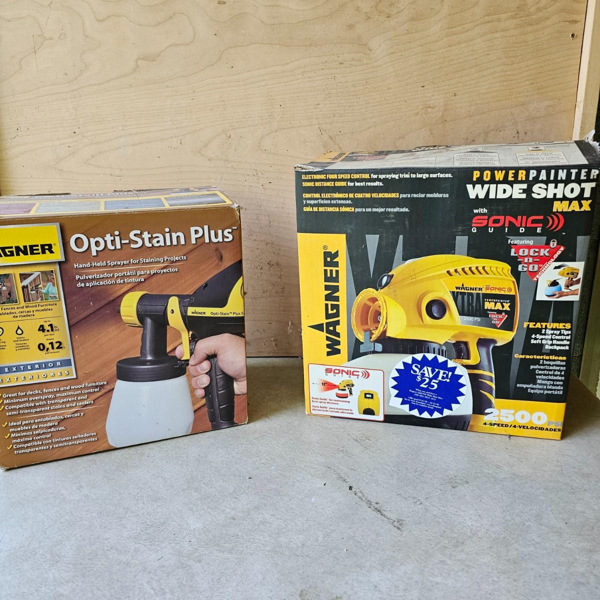 A duo of Wagner sprayers, one for paint and one for stain. The paint unit is the Wide Shot Max, has 2500 psi power, comes with paint reservoir and other accessories. Powered on when plugged in. The stain unit is an Opti-Stain Plus, has reservoir unit, appears to be new in box. Powered on when plugged in. See photos for details. Shipping available.