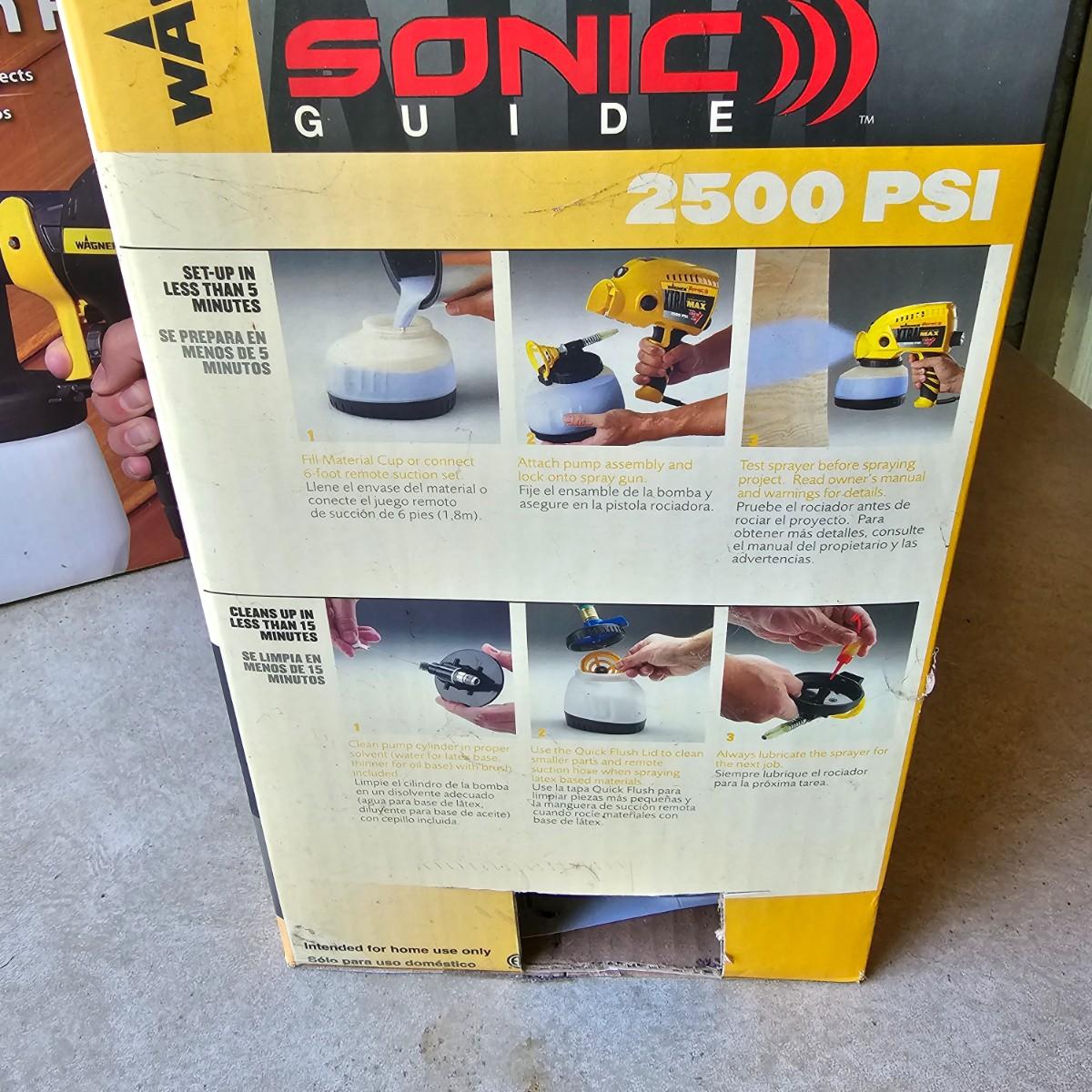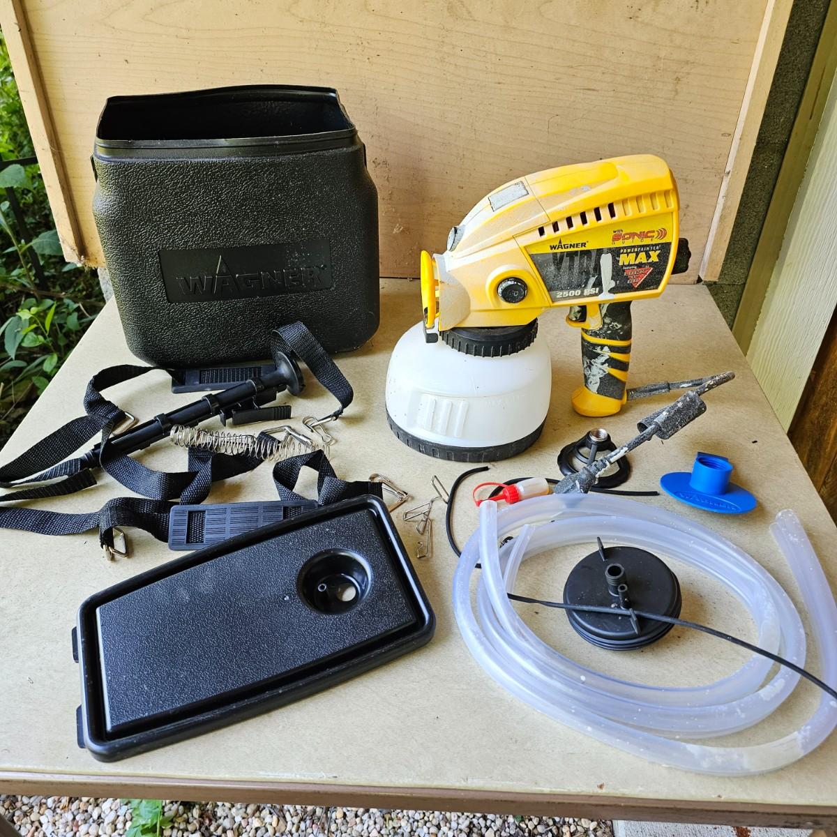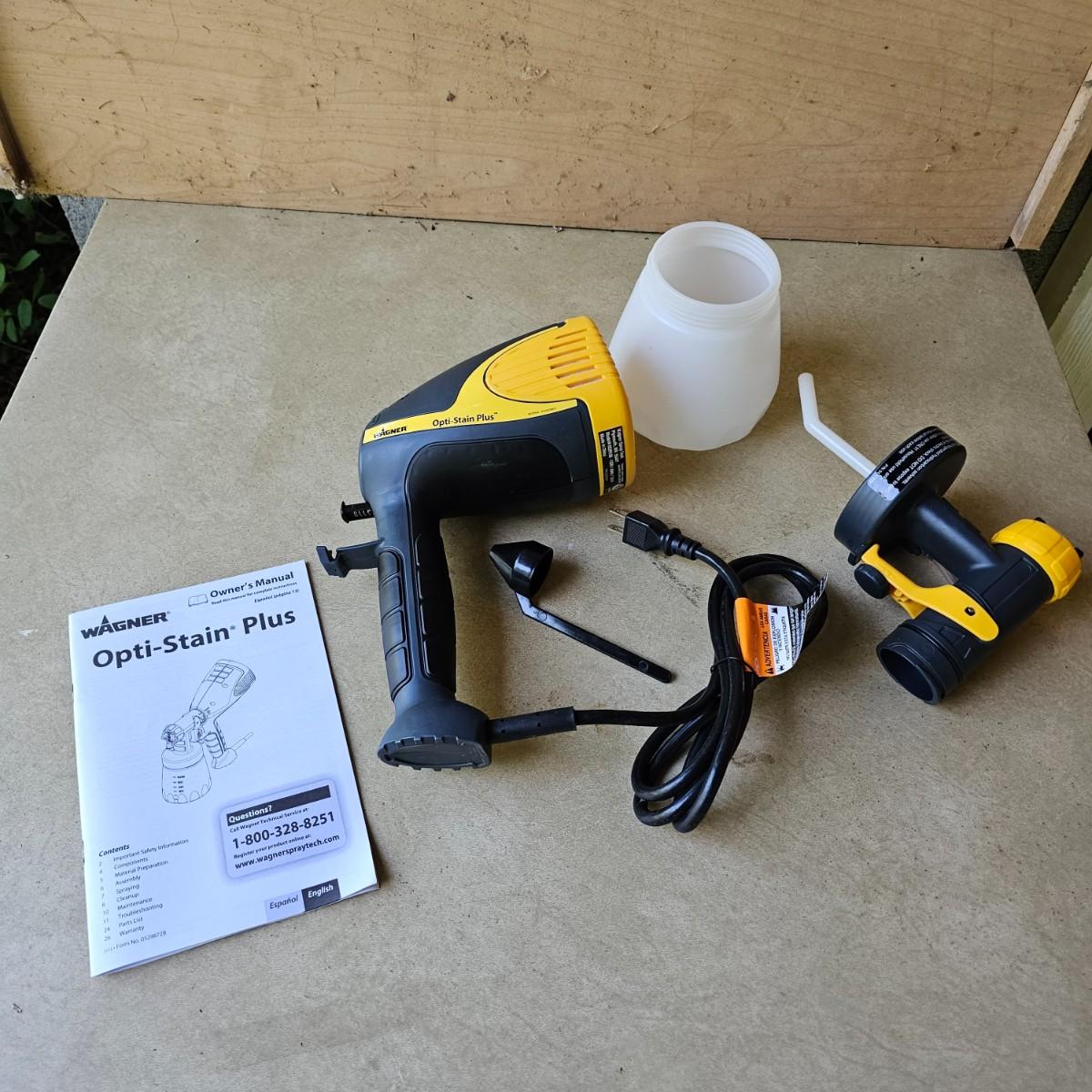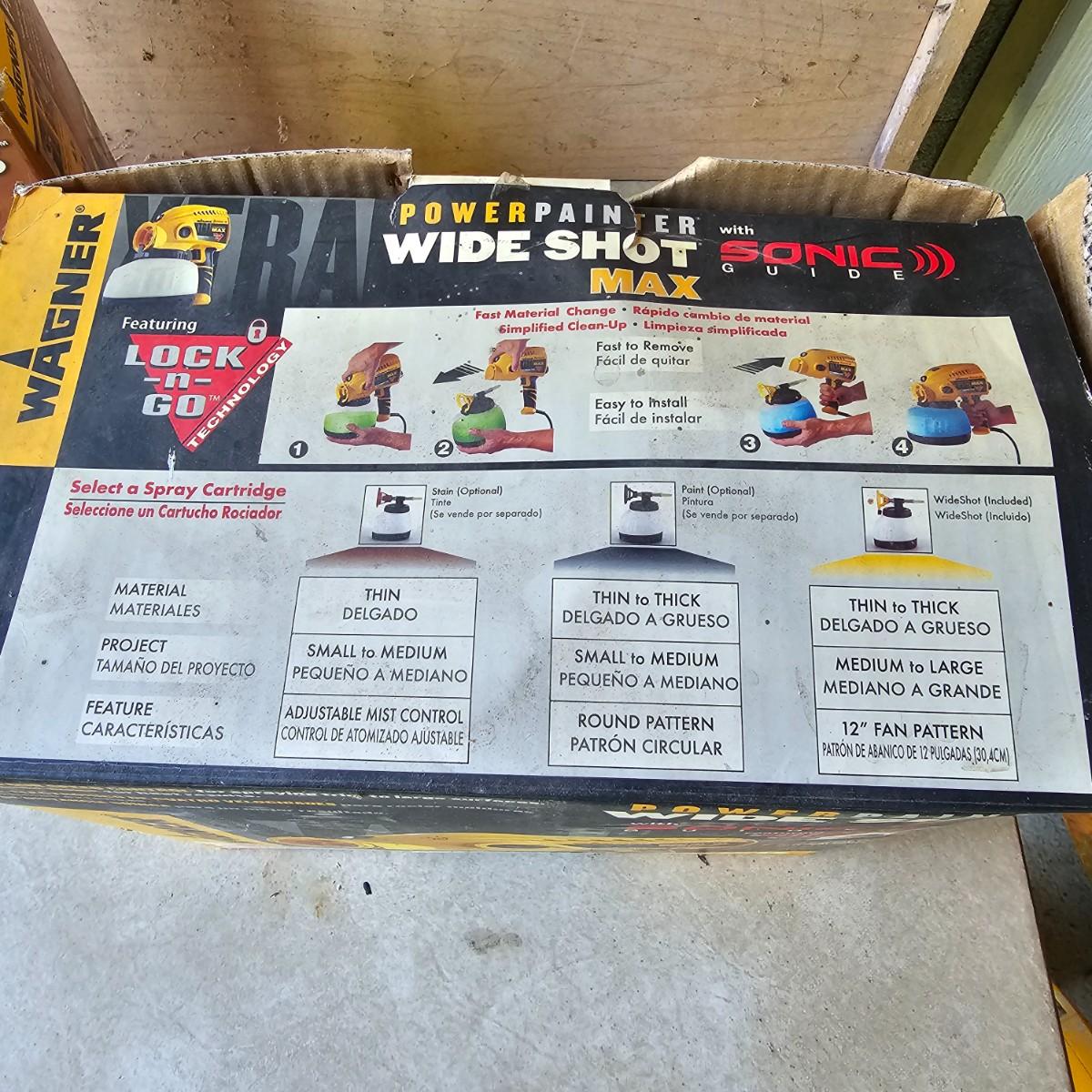 A duo of Wagner sprayers, one for paint and one for stain. The paint unit is the Wide Shot Max, has 2500 psi power, comes with paint reservoir and other accessories. Powered on when plugged in. The stain unit is an Opti-Stain Plus, has reservoir unit, appears to be new in box. Powered on when plugged in. See photos for details. Shipping available.
