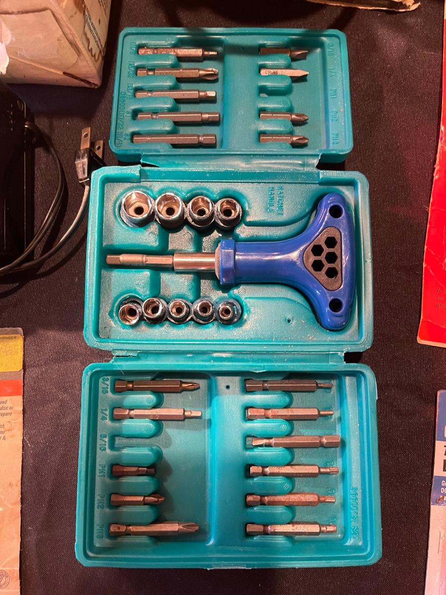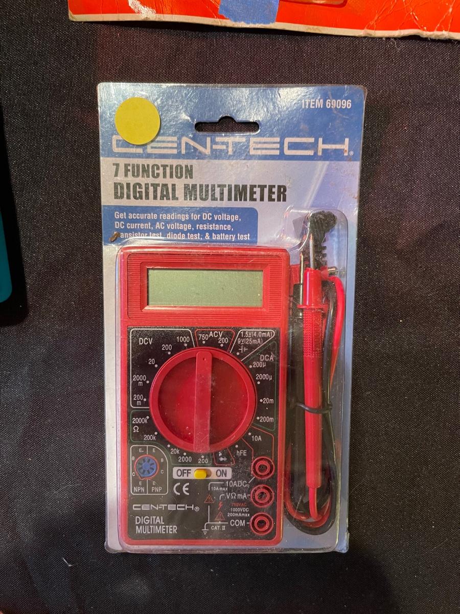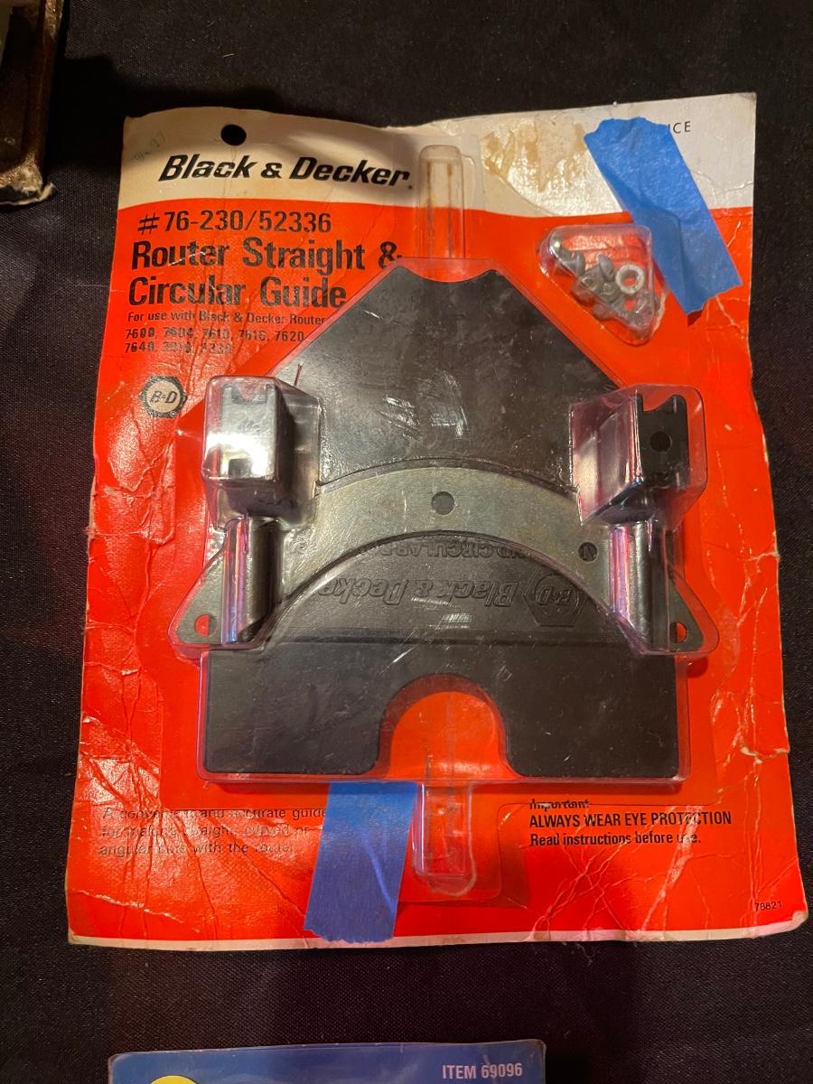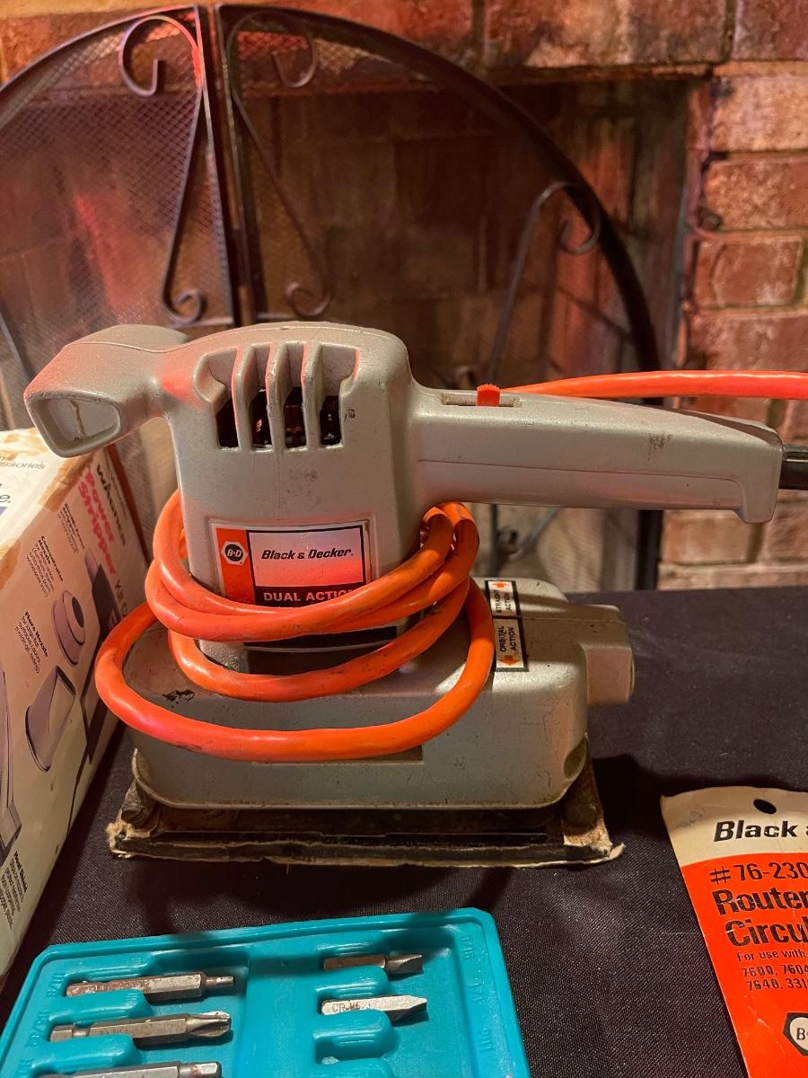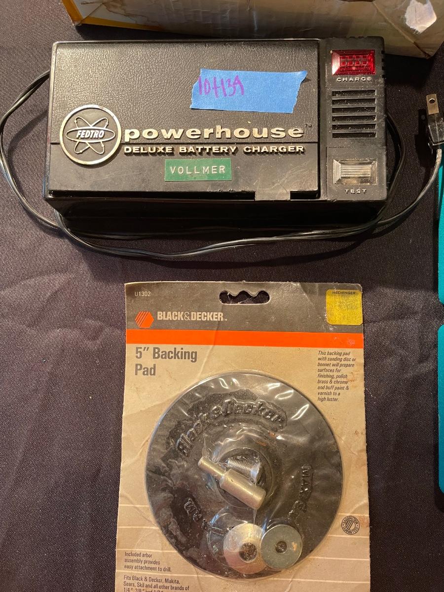 Wagner heat gun, Fedtro powerhouse deluxe battery charger, handrill bit kit, B+D router straight & circular guide, B+D deluxe dual action sander, 7 function digital car multimeter, B+D 5" backing pad