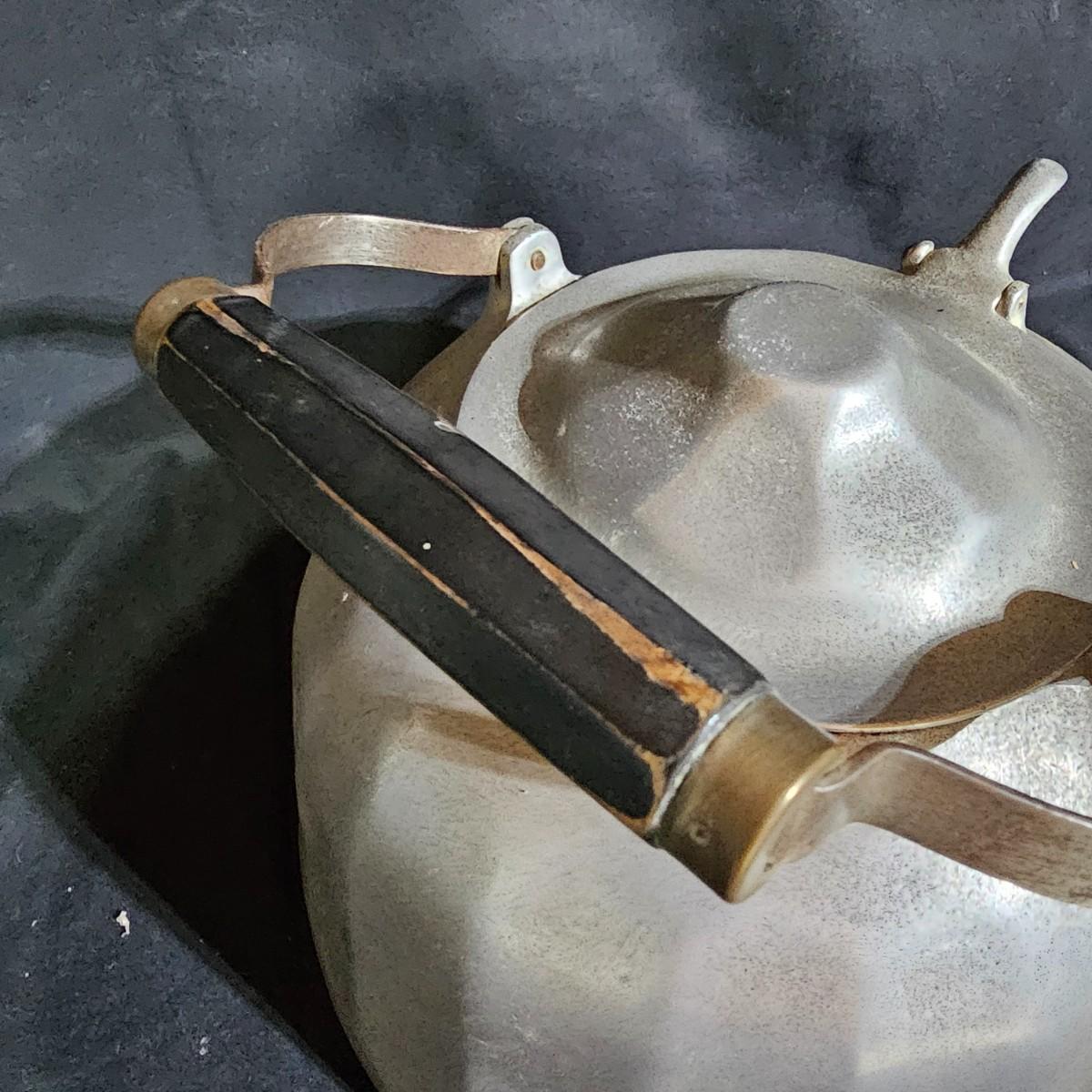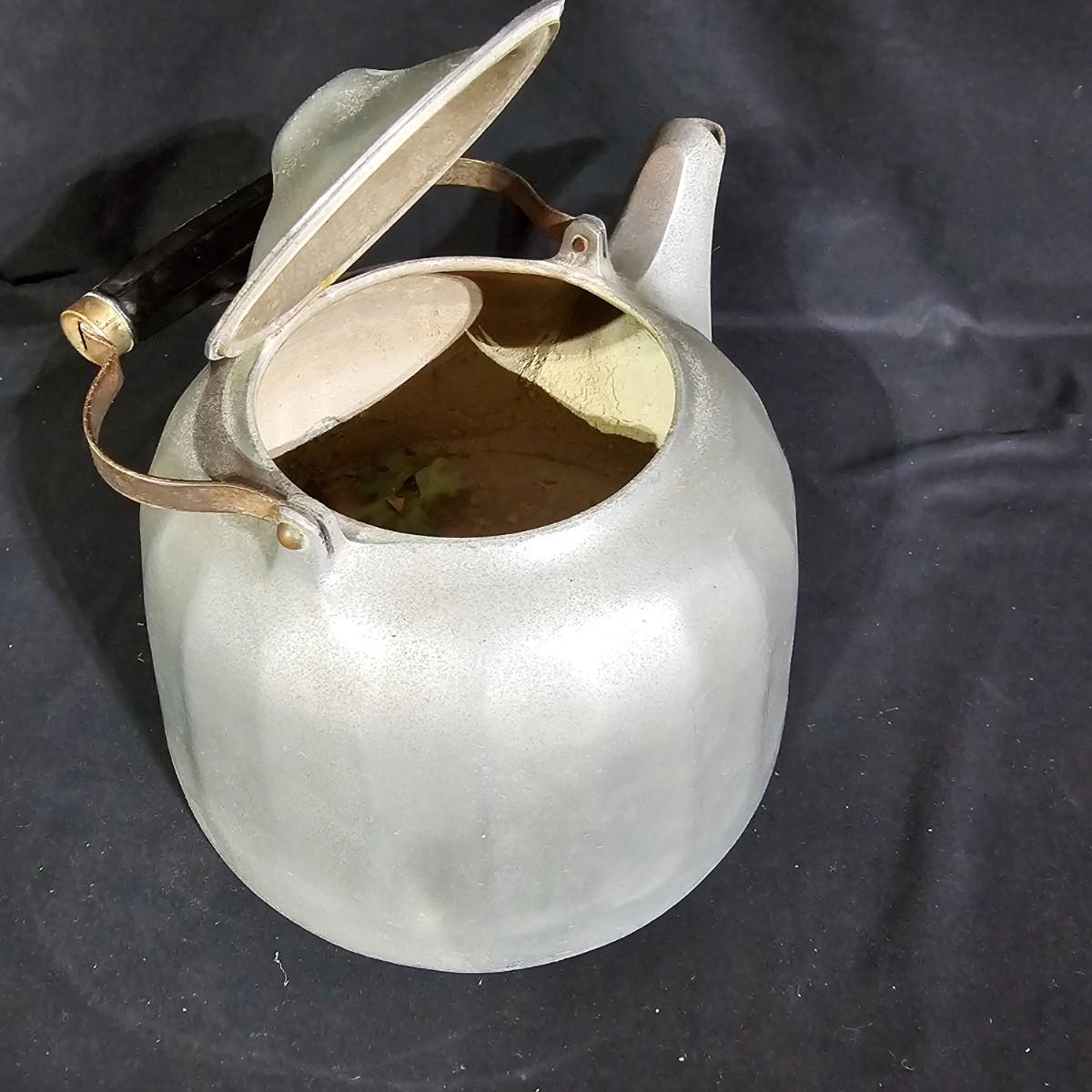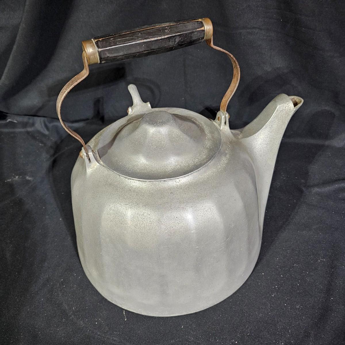 Large aluminum tea kettle by Wagner Ware. This 8qt capacity kettle has a wooden handle and a lift lid opening. Kettle measures 13.5" x 10" x 11"H. Some minor wear on surface. See photos for details. Shipping available.