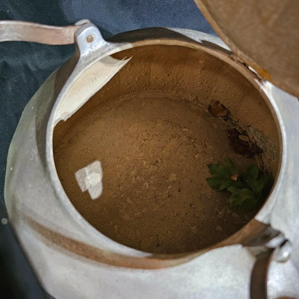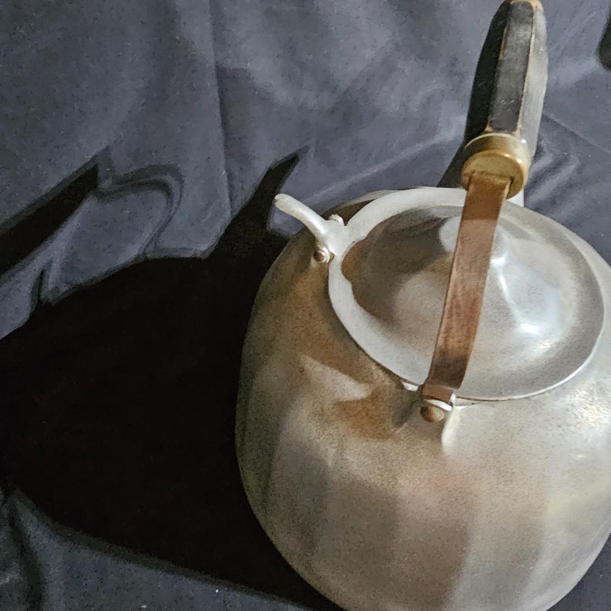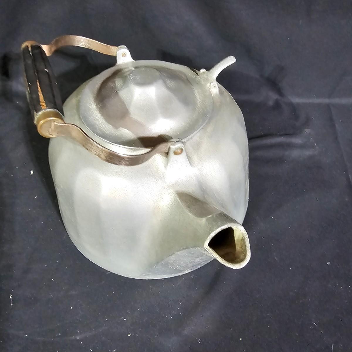 Large aluminum tea kettle by Wagner Ware. This 8qt capacity kettle has a wooden handle and a lift lid opening. Kettle measures 13.5" x 10" x 11"H. Some minor wear on surface. See photos for details. Shipping available.
