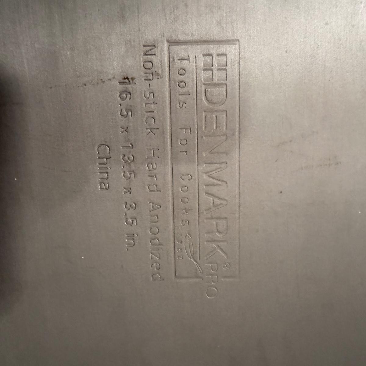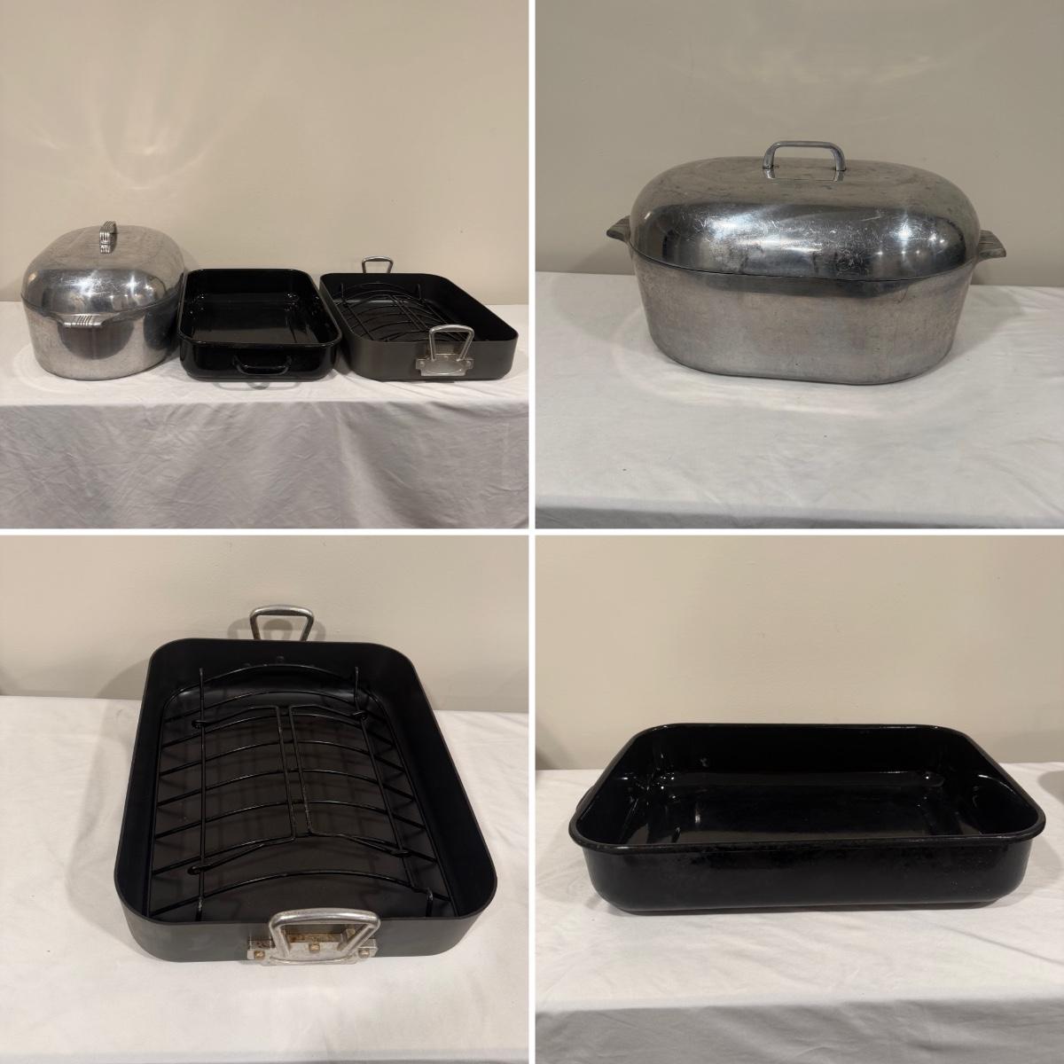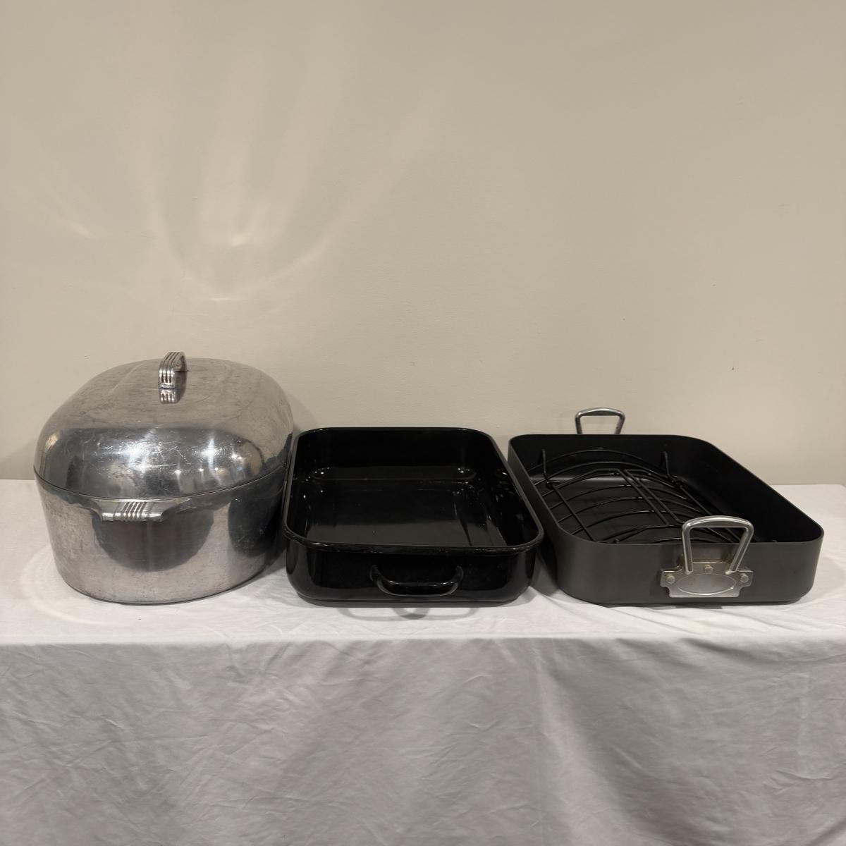 Lot includes a Wagner Ware cast aluminum roasting pan, Denmark Pro roasting pan and an unmarked roasting pan. Wagner Ware pan measures 20” x 12” x 10.5”H.