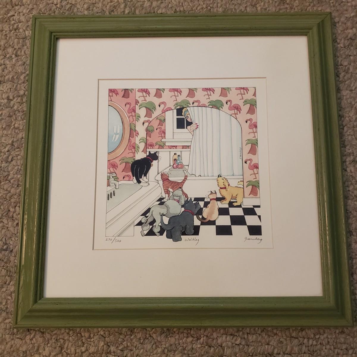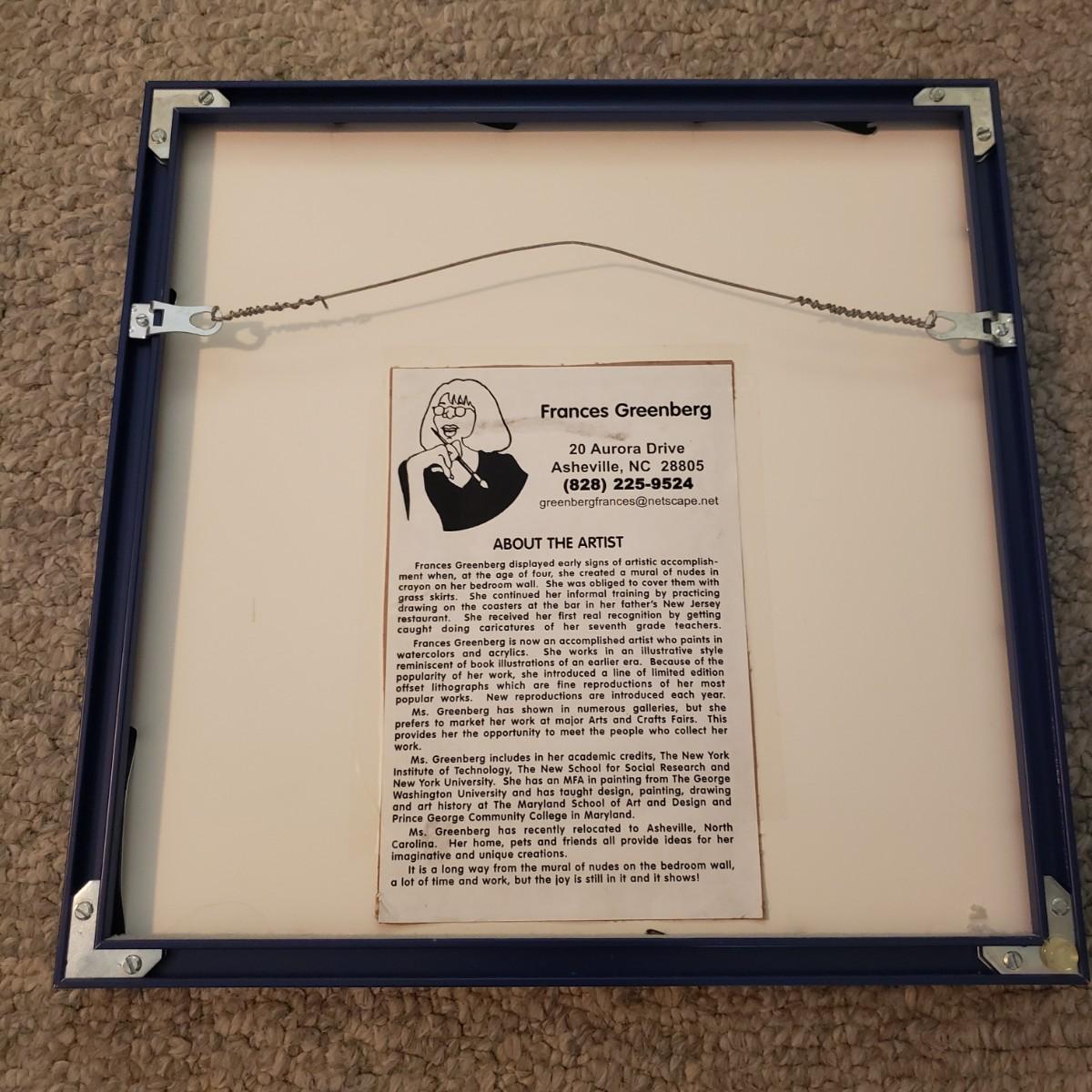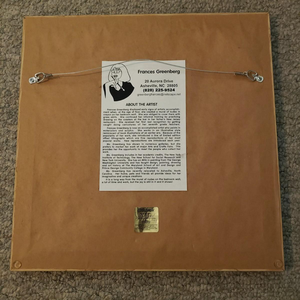 This artwork is by a local Asheville artist Frances Greenberg. The print "Waiting" is is a green wooden frame behind glass. The frame measures 16.5" x 16.5" is is matted. The metal blue frame is titled "Sleeping Arrangement With Cats". This print is numbered 393/500.