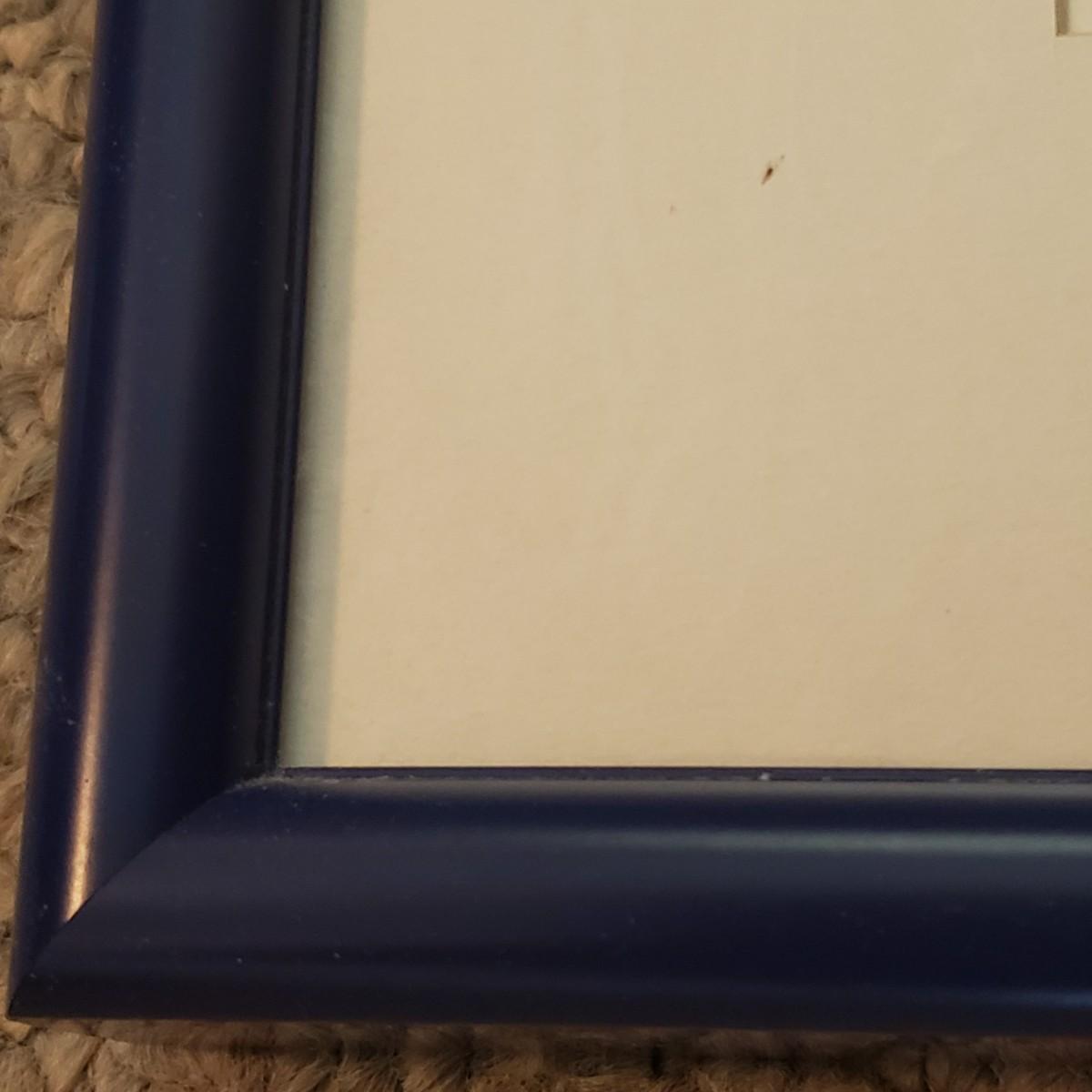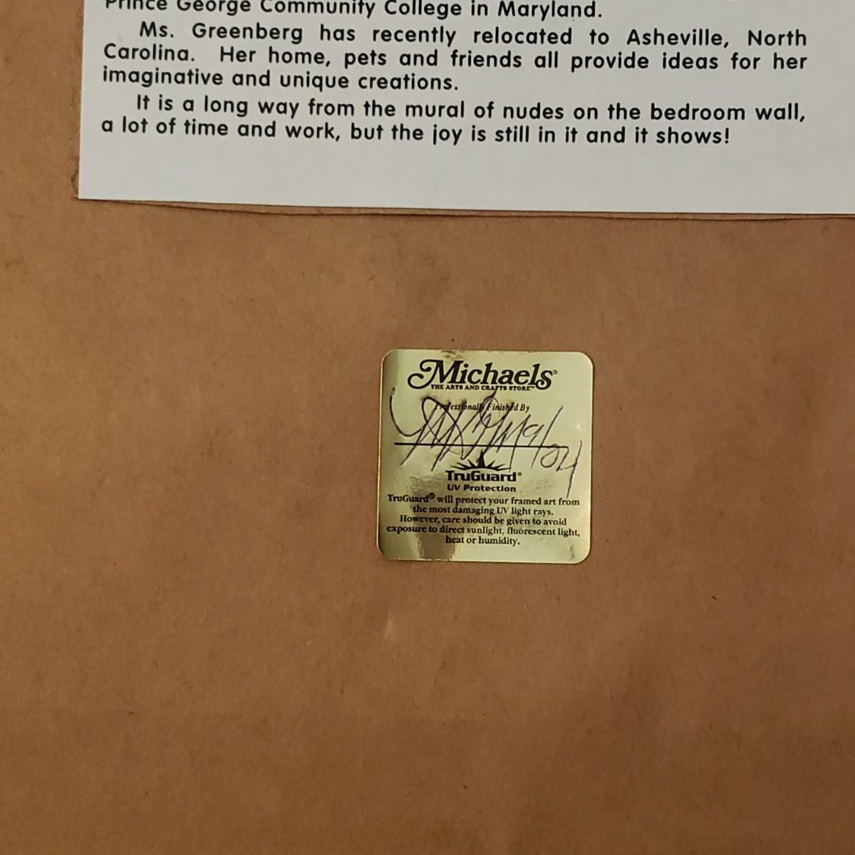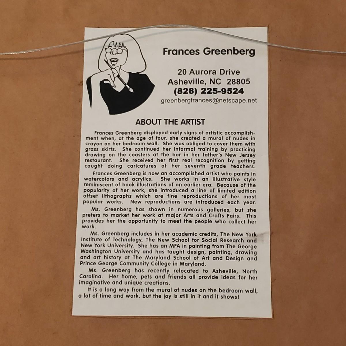 This artwork is by a local Asheville artist Frances Greenberg. The print "Waiting" is is a green wooden frame behind glass. The frame measures 16.5" x 16.5" is is matted. The metal blue frame is titled "Sleeping Arrangement With Cats". This print is numbered 393/500.