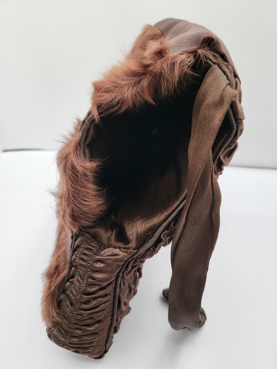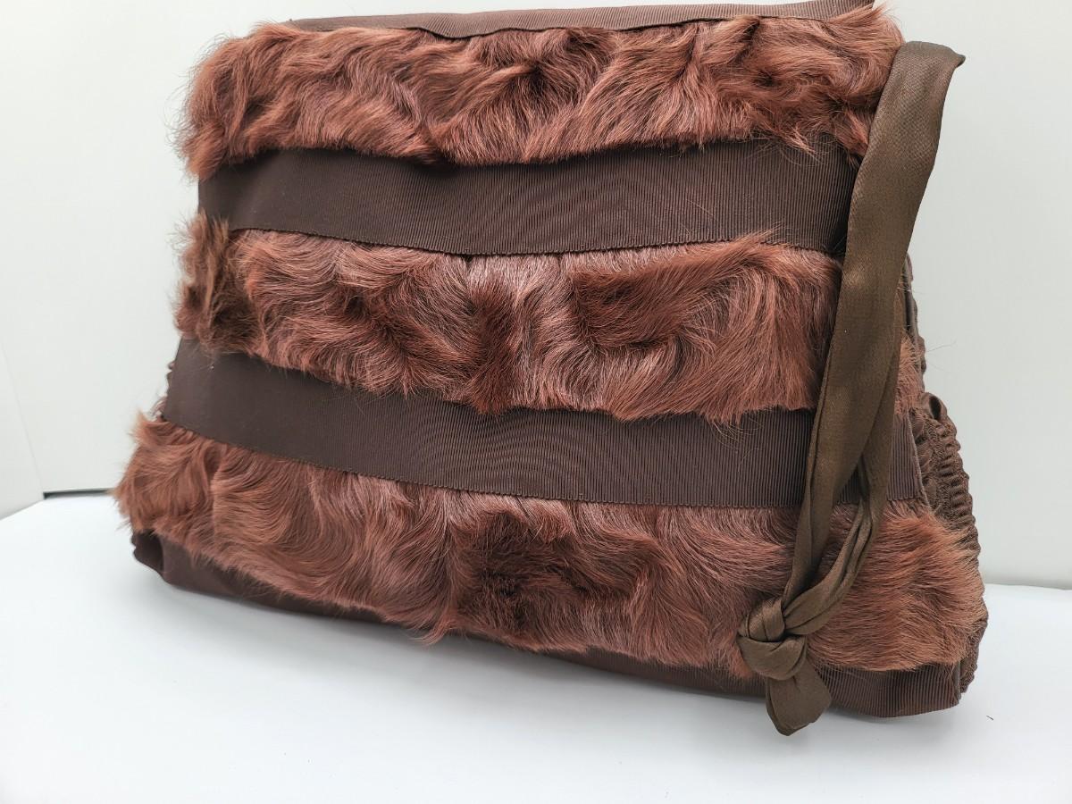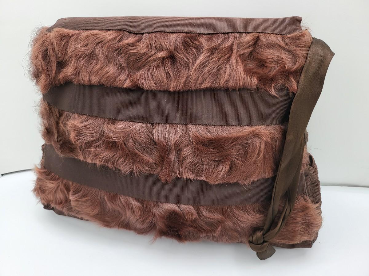 Vintage Waldes USA, chocolate brown fur & satin hand-warmer muff with back zipper storage compartment. Measures 12.5" x 9.5".