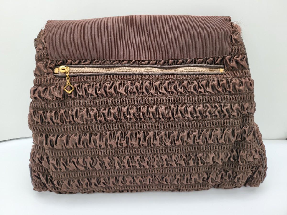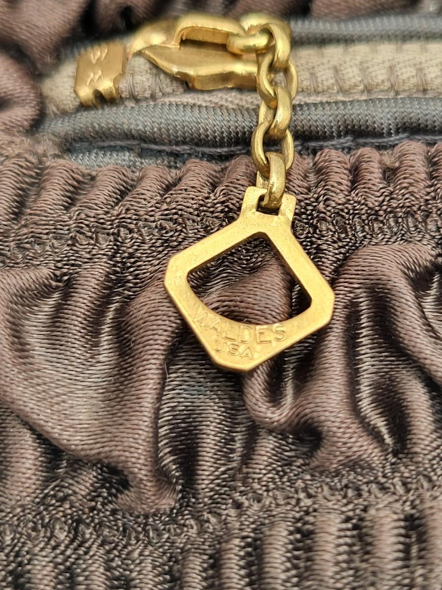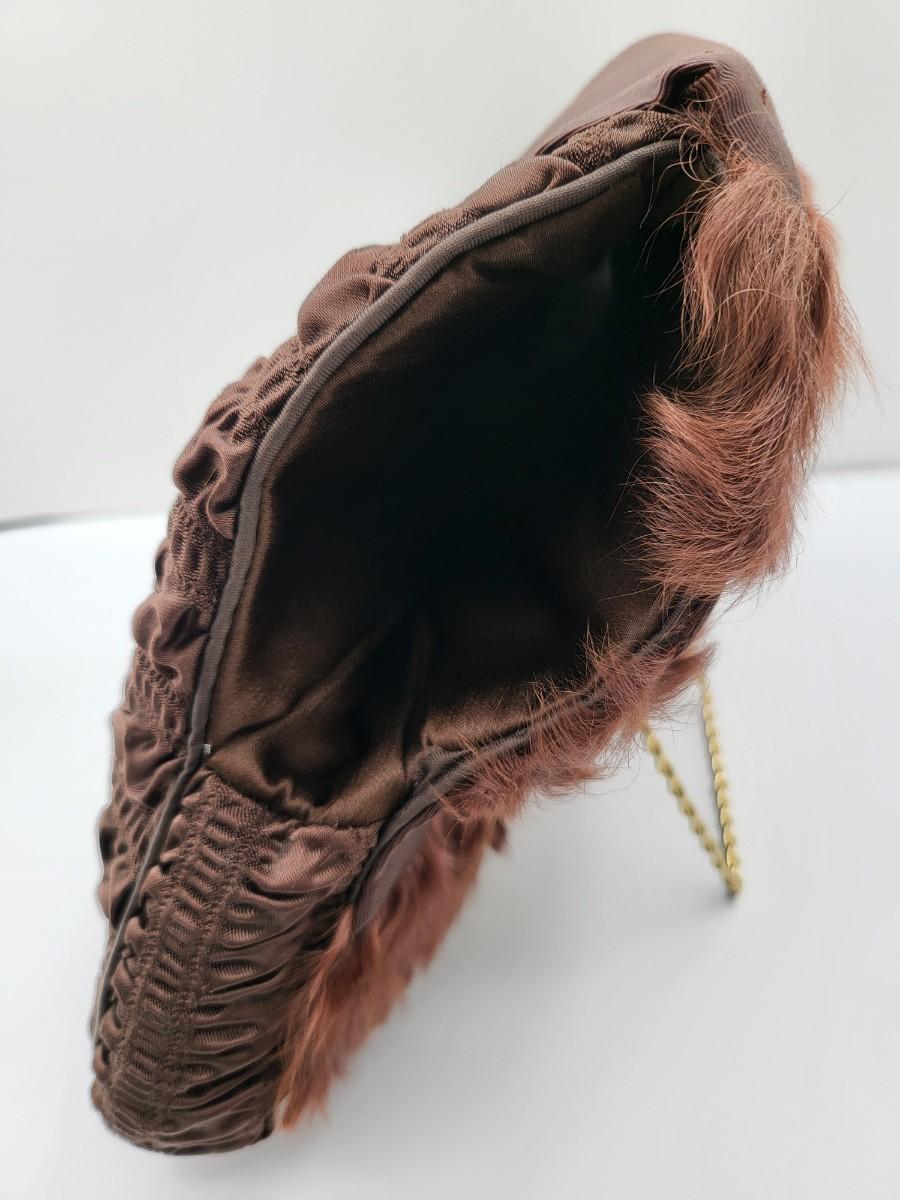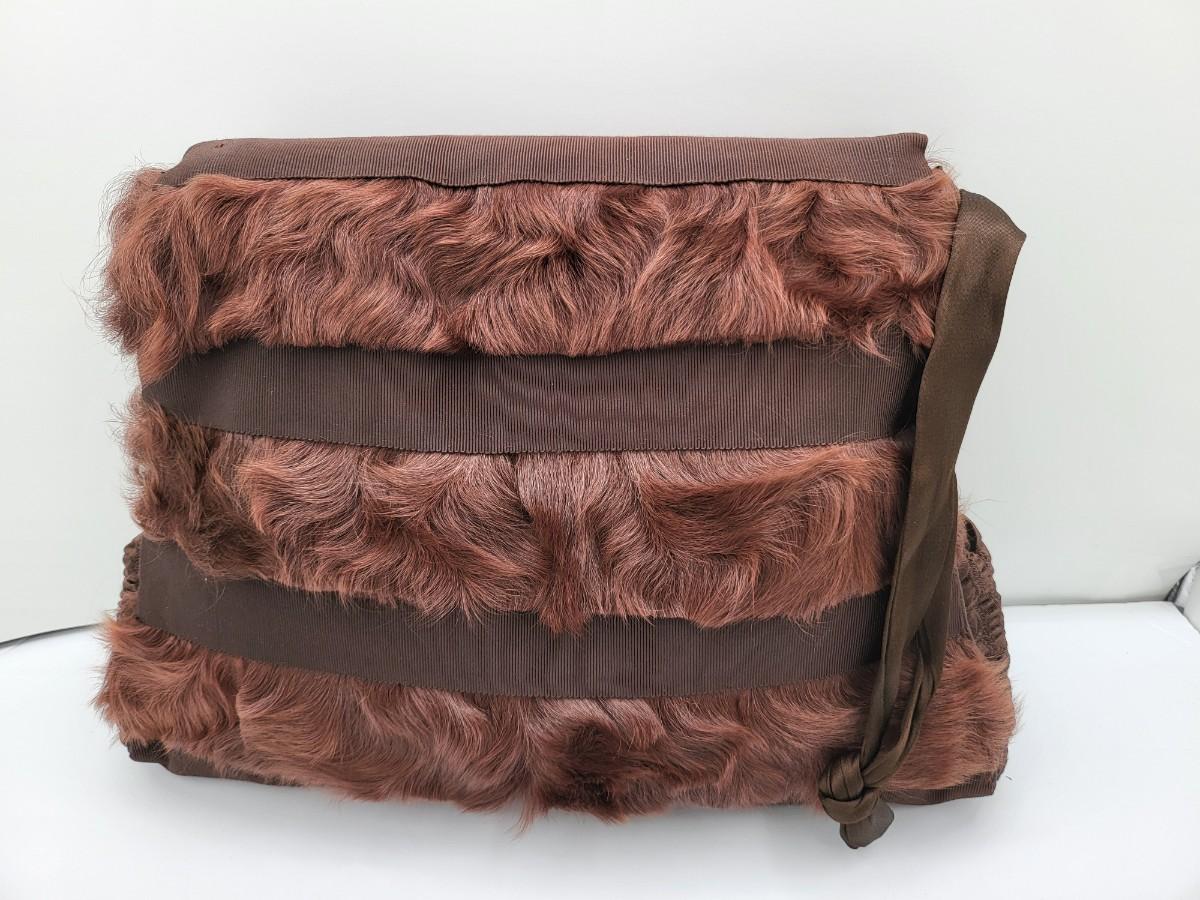 Vintage Waldes USA, chocolate brown fur & satin hand-warmer muff with back zipper storage compartment. Measures 12.5" x 9.5".