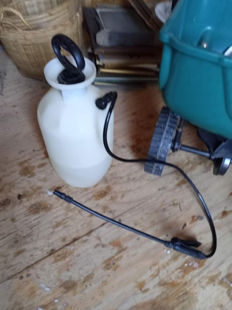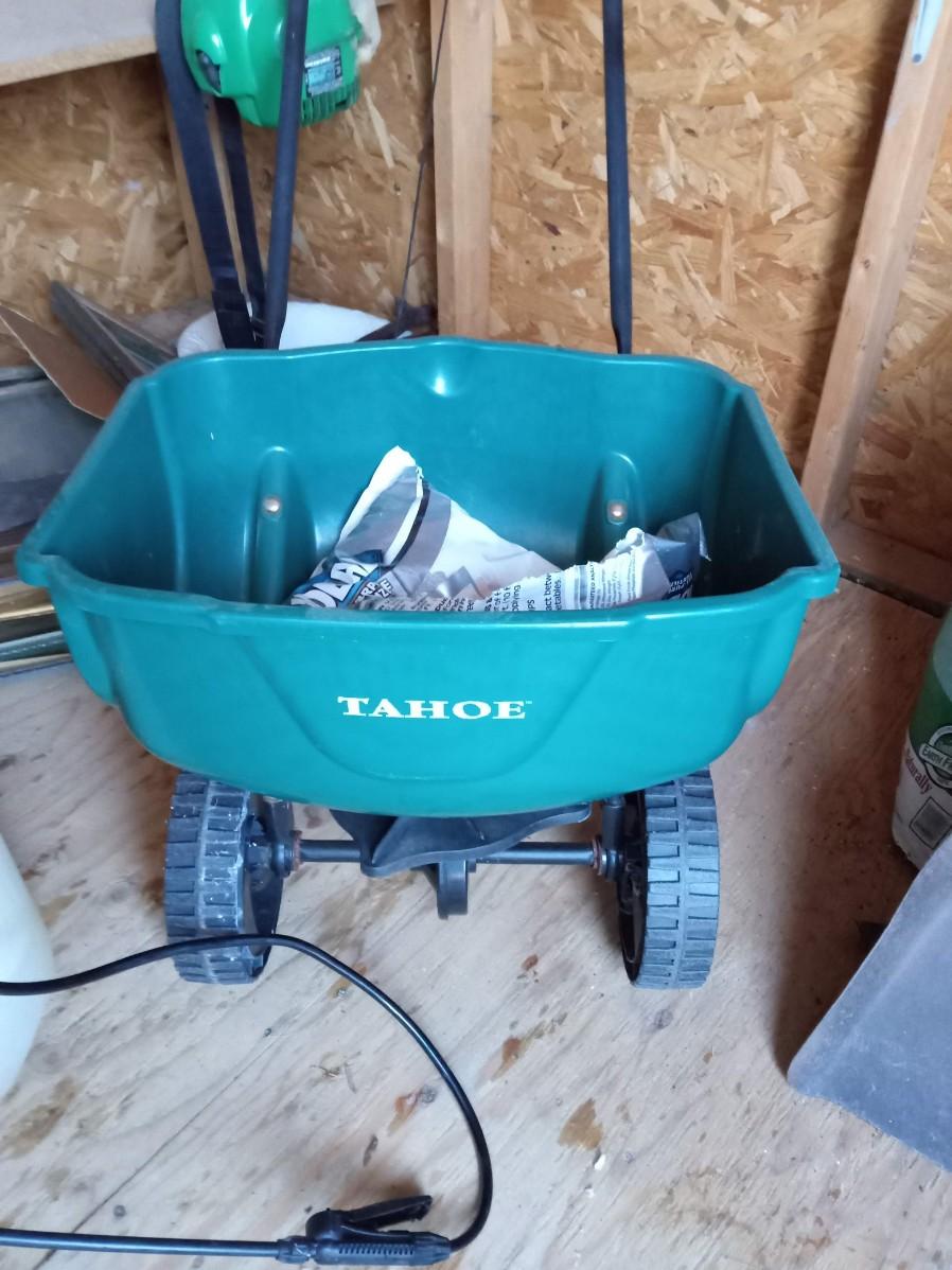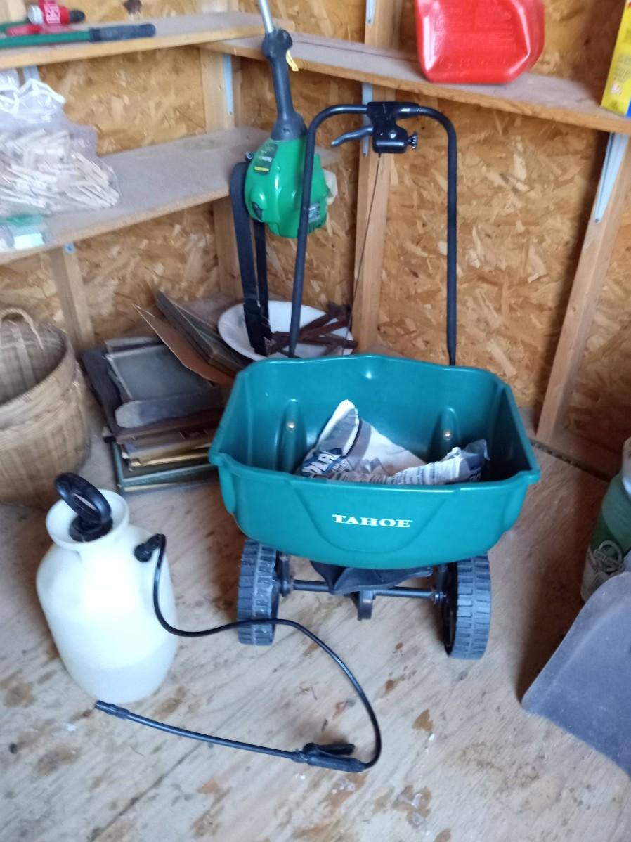 WALK BEHIND SPREADER, WEED SPRAYER AND PARTIAL BAG OF FERTILIZER