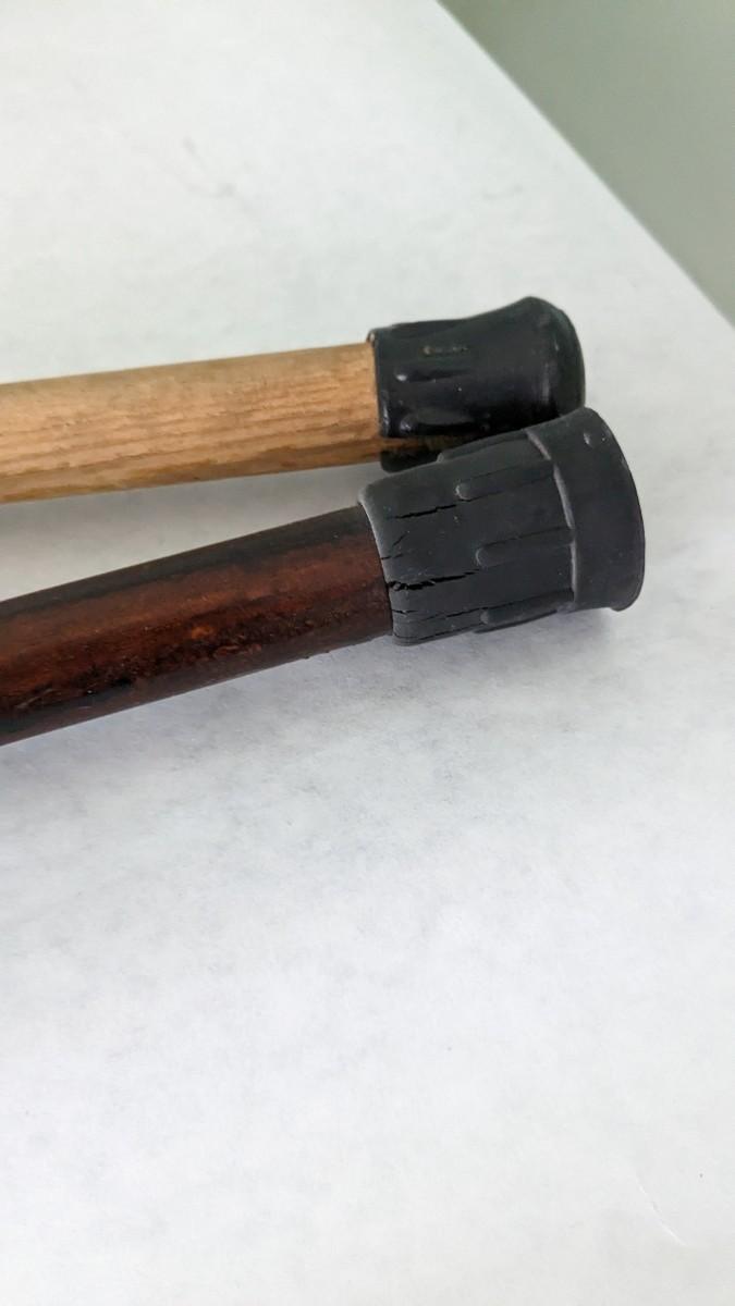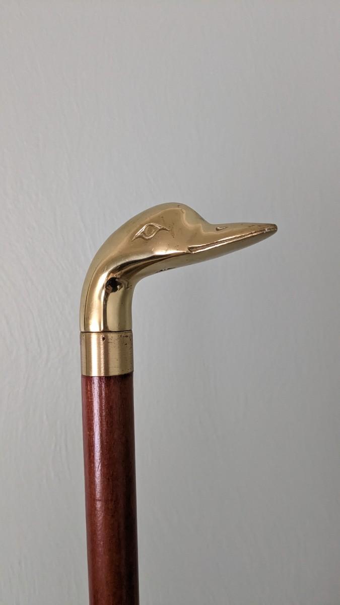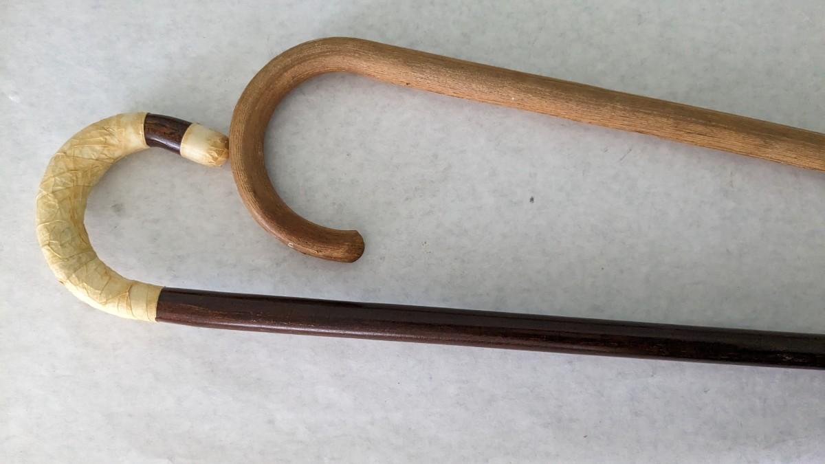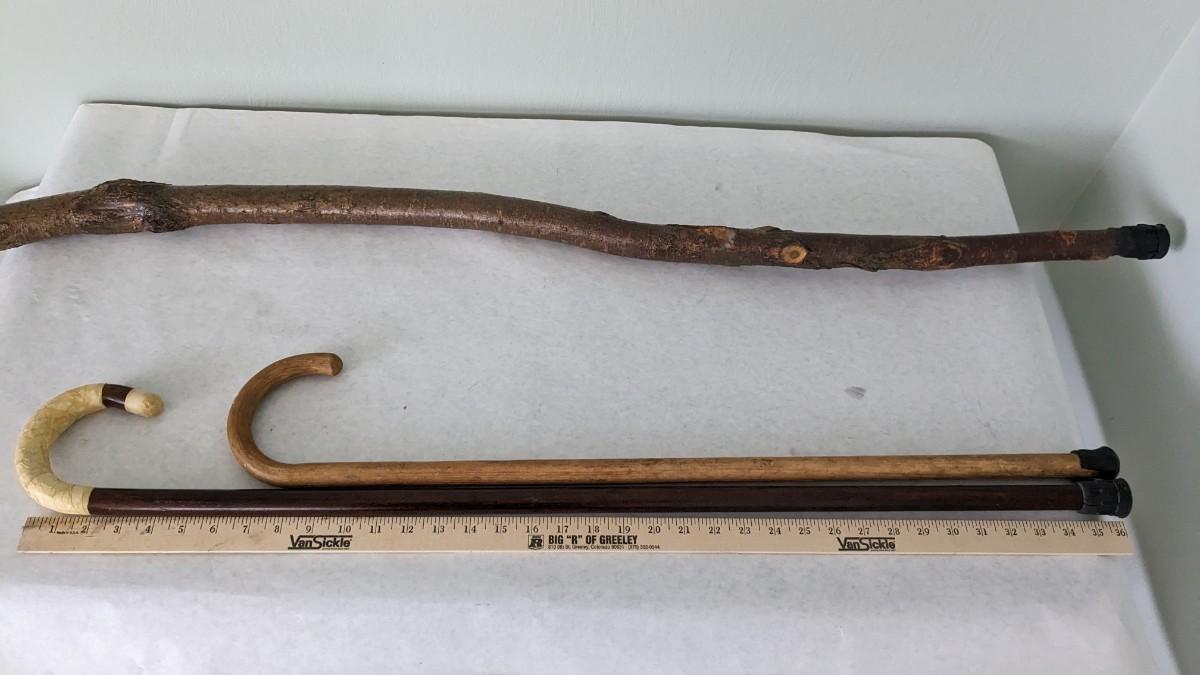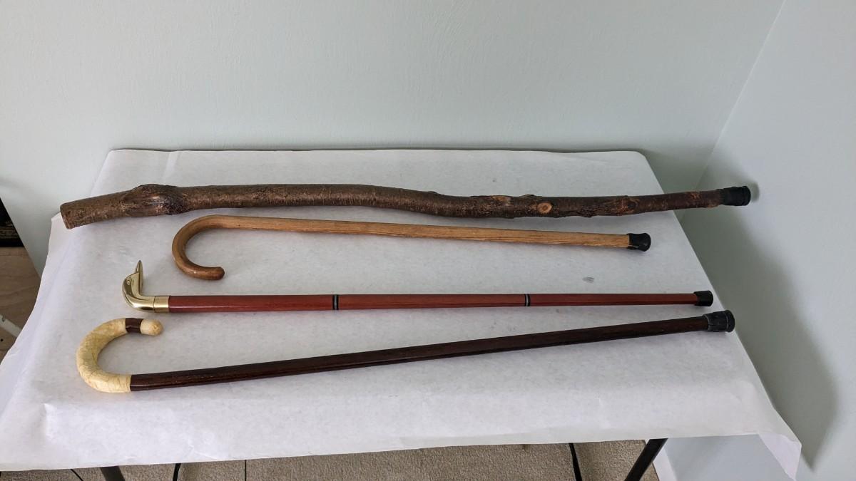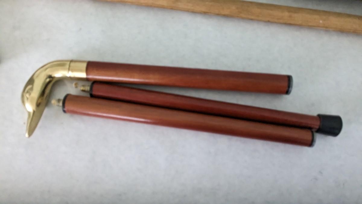 includes a BEAUTIFUL 46" petrified sap walking stick, 35" breakdown brass goose cane, and 2 well used wood canes. livingroom