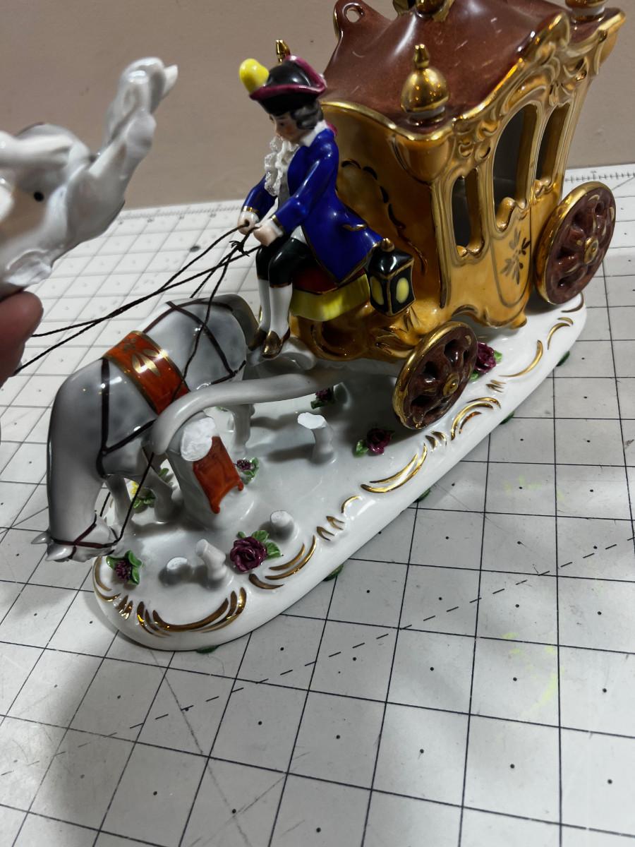 Dresden Horse and Carriage Figurine. As shown with horse on one side need to be re-attached.