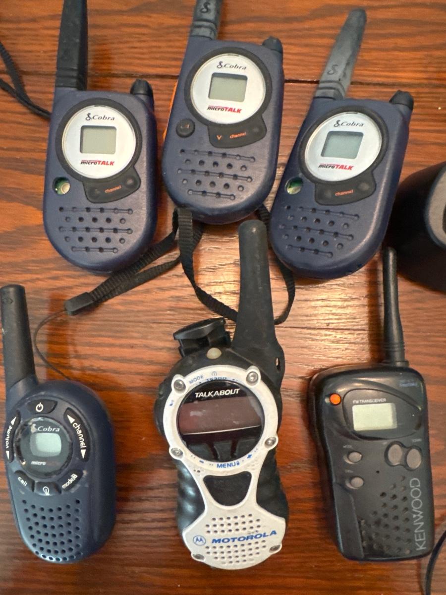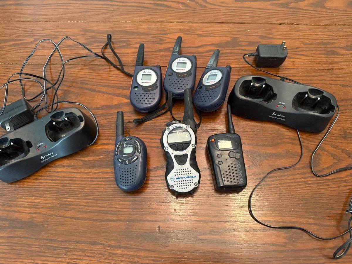 Walkie-talkies include six of them. Includes four cobra brand, one Motorola brand and one Kenwood brand. Did not test
