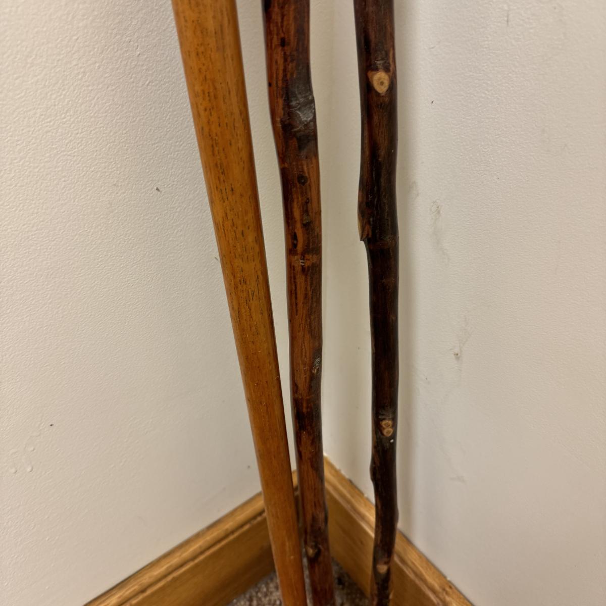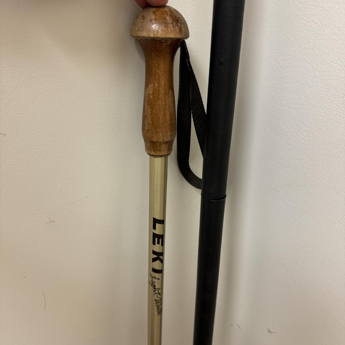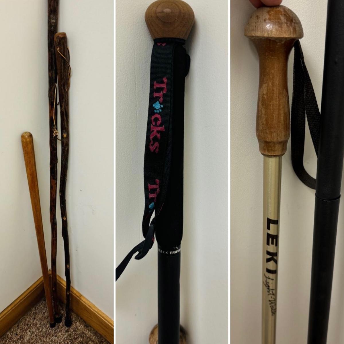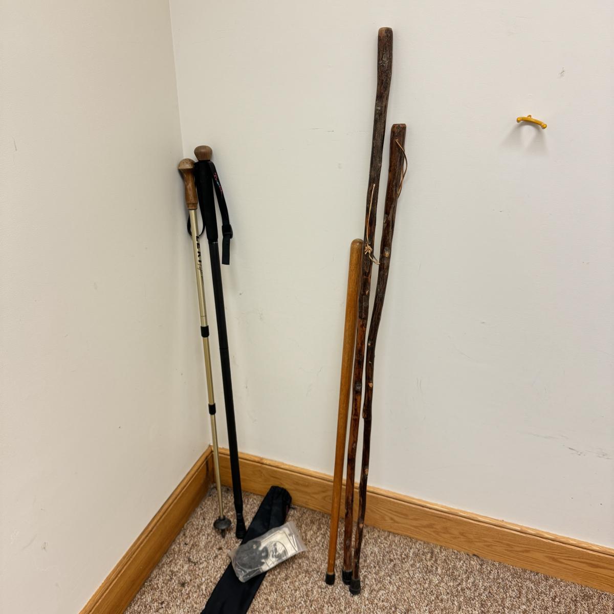Three wooden walking sticks and two metal walking poles. Largest wooden stick measures 55” and smallest measures 37”. Largest metal pole is by Tracks called Sherlock Travel staff and comes with a carrying case. It has a black padding on the length of the pole. Measures 44.5” and can be taken apart to fit in carrying case. Smaller pole is by Leki and is a Light-Walk pole. It measures 43” at tallest and is adjustable to be smaller. It comes with two pairs of Snowflake Basket bases to use for alpine skiing.