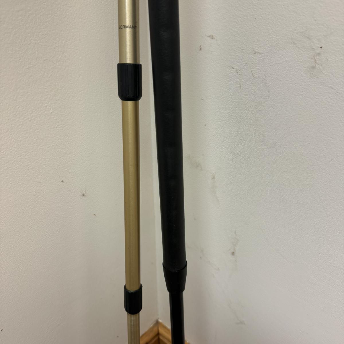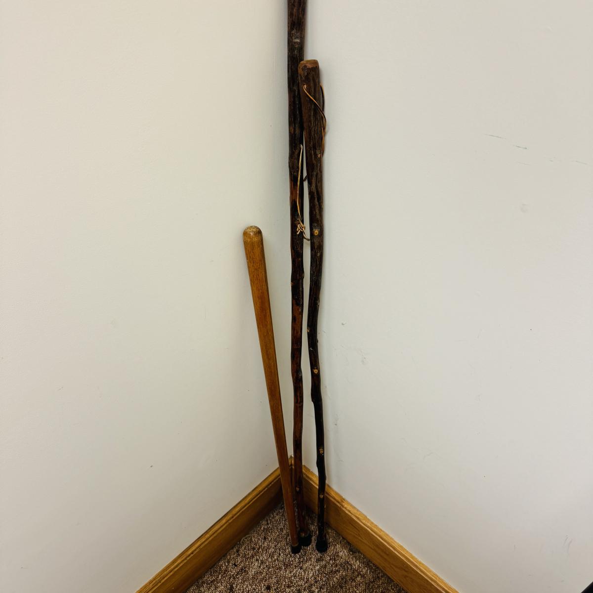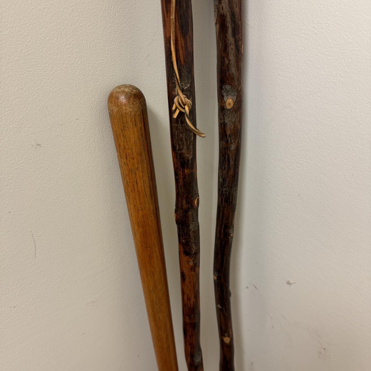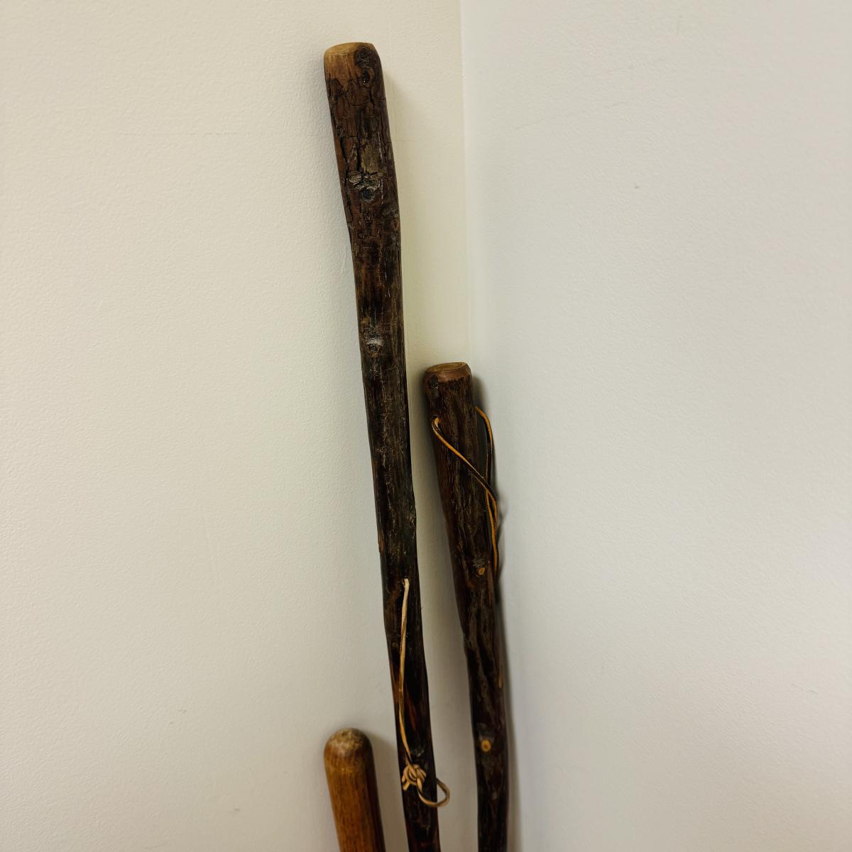 Three wooden walking sticks and two metal walking poles. Largest wooden stick measures 55” and smallest measures 37”. Largest metal pole is by Tracks called Sherlock Travel staff and comes with a carrying case. It has a black padding on the length of the pole. Measures 44.5” and can be taken apart to fit in carrying case. Smaller pole is by Leki and is a Light-Walk pole. It measures 43” at tallest and is adjustable to be smaller. It comes with two pairs of Snowflake Basket bases to use for alpine skiing.