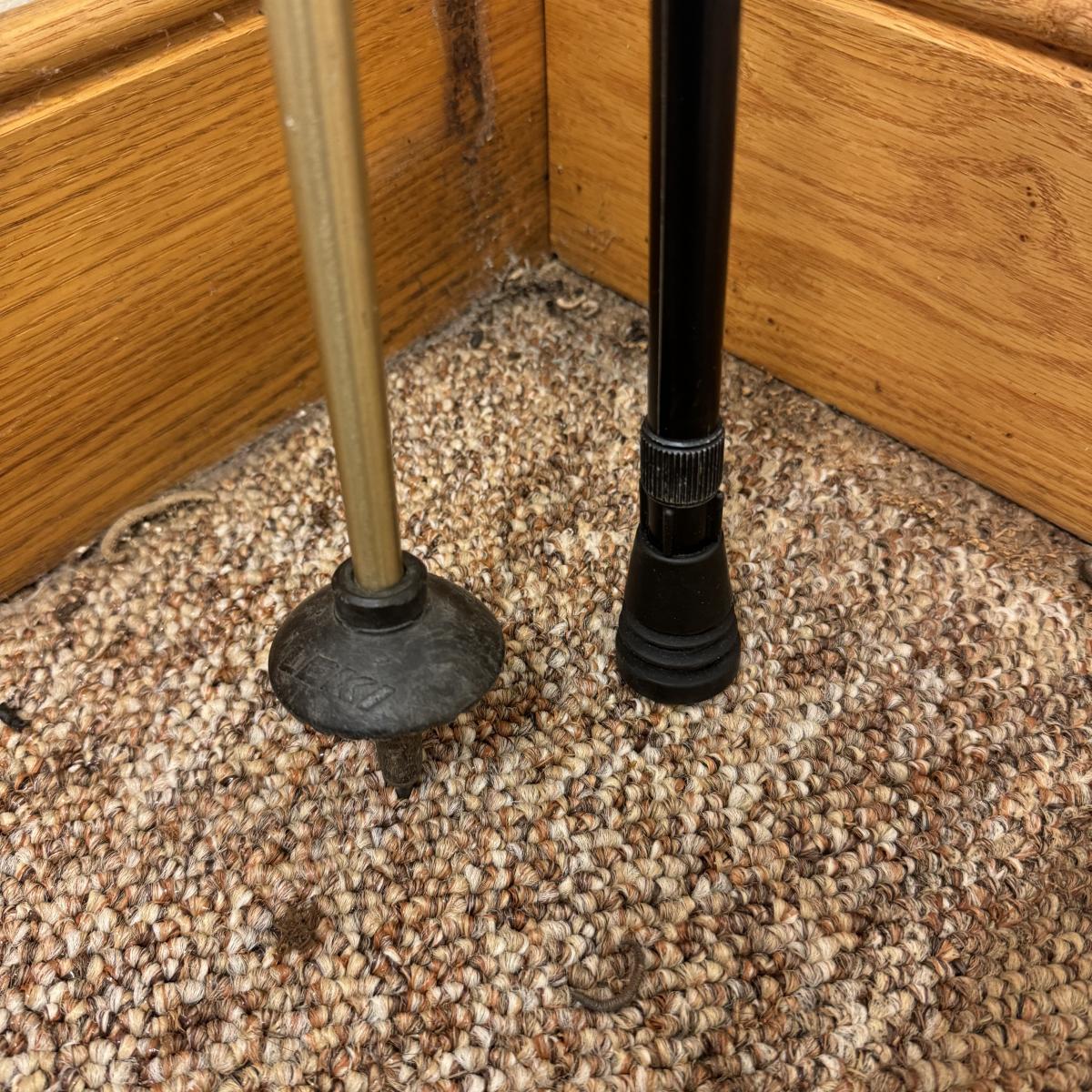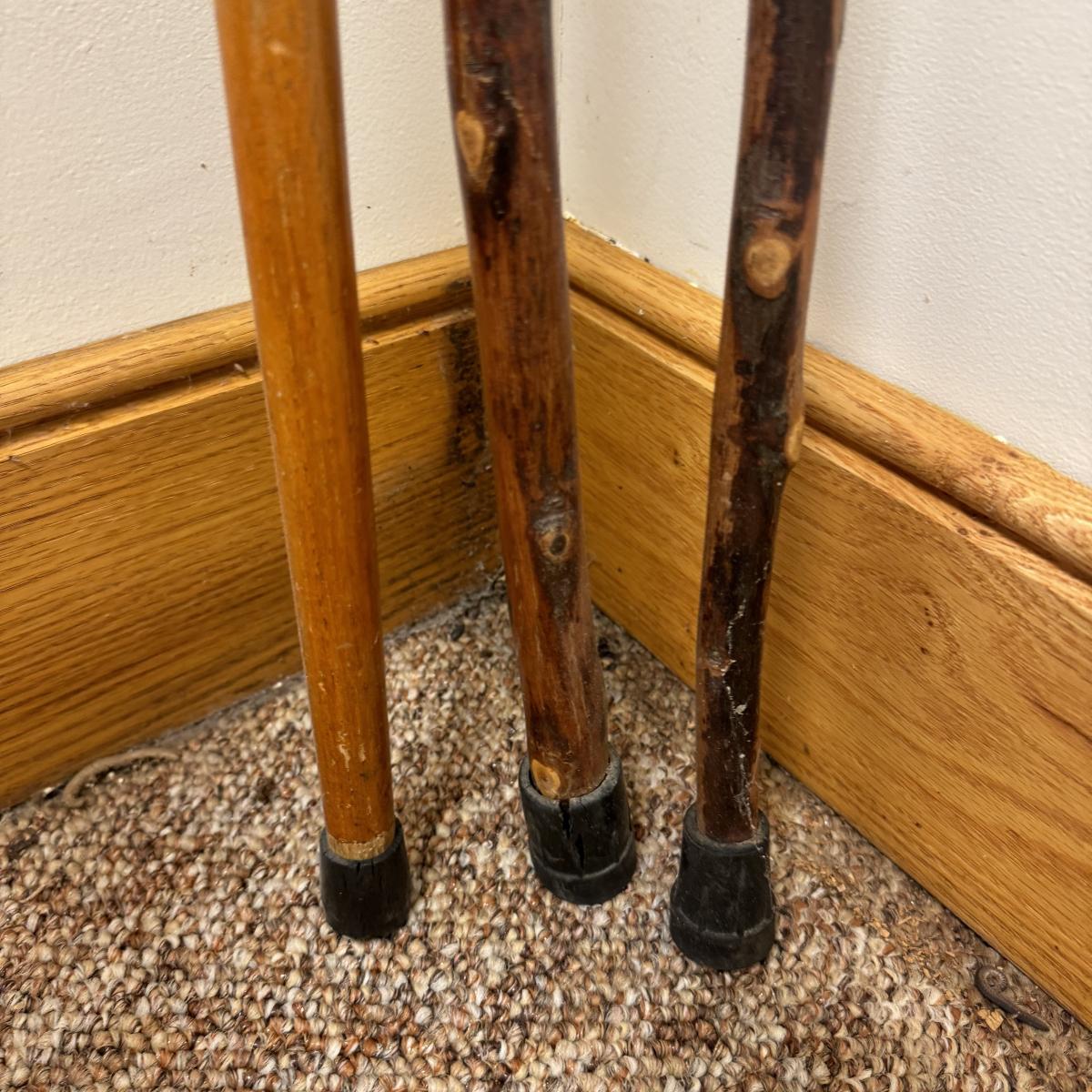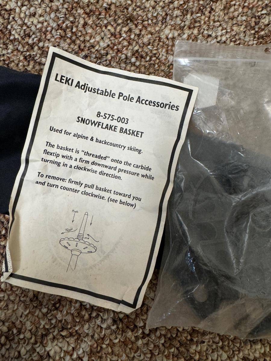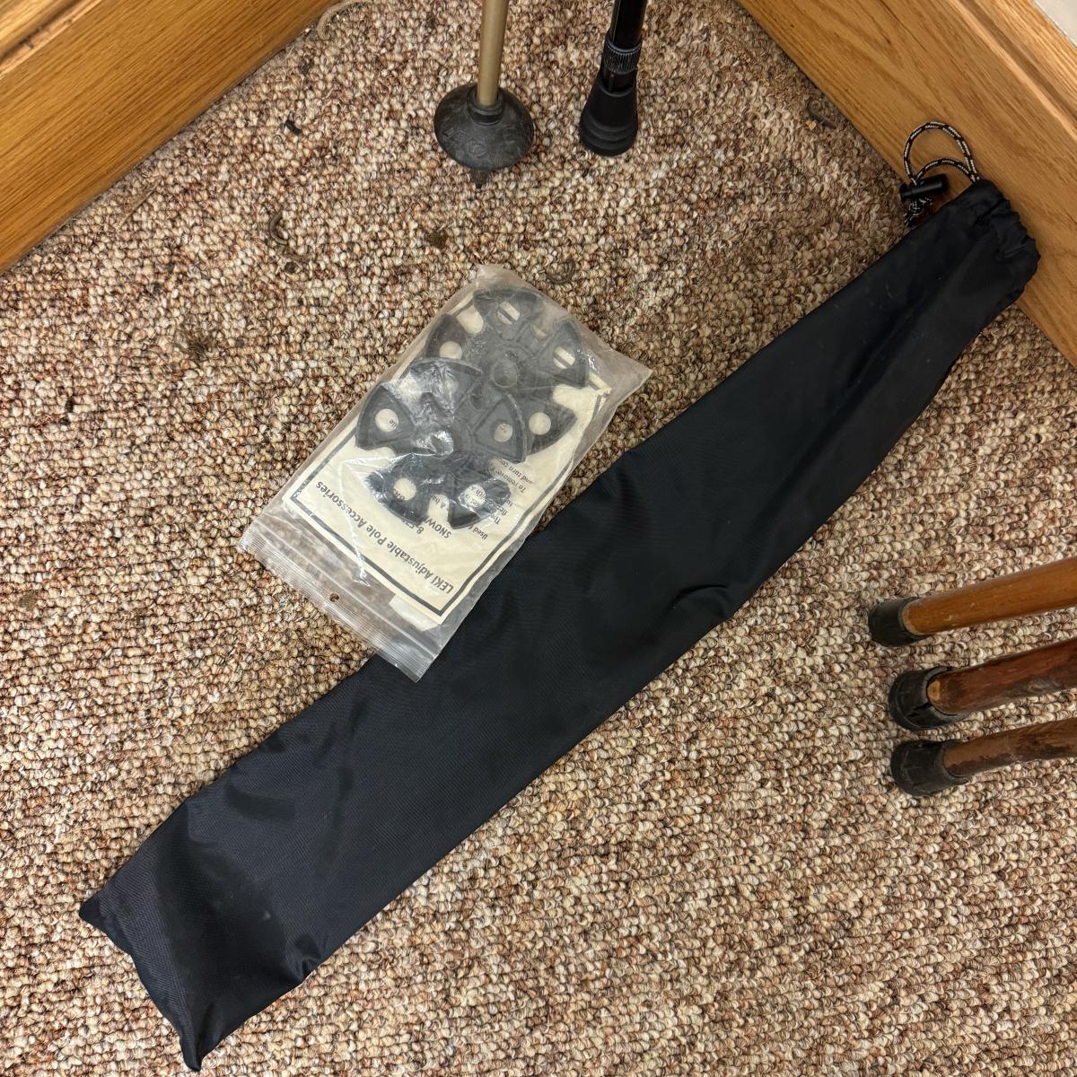 Three wooden walking sticks and two metal walking poles. Largest wooden stick measures 55” and smallest measures 37”. Largest metal pole is by Tracks called Sherlock Travel staff and comes with a carrying case. It has a black padding on the length of the pole. Measures 44.5” and can be taken apart to fit in carrying case. Smaller pole is by Leki and is a Light-Walk pole. It measures 43” at tallest and is adjustable to be smaller. It comes with two pairs of Snowflake Basket bases to use for alpine skiing.