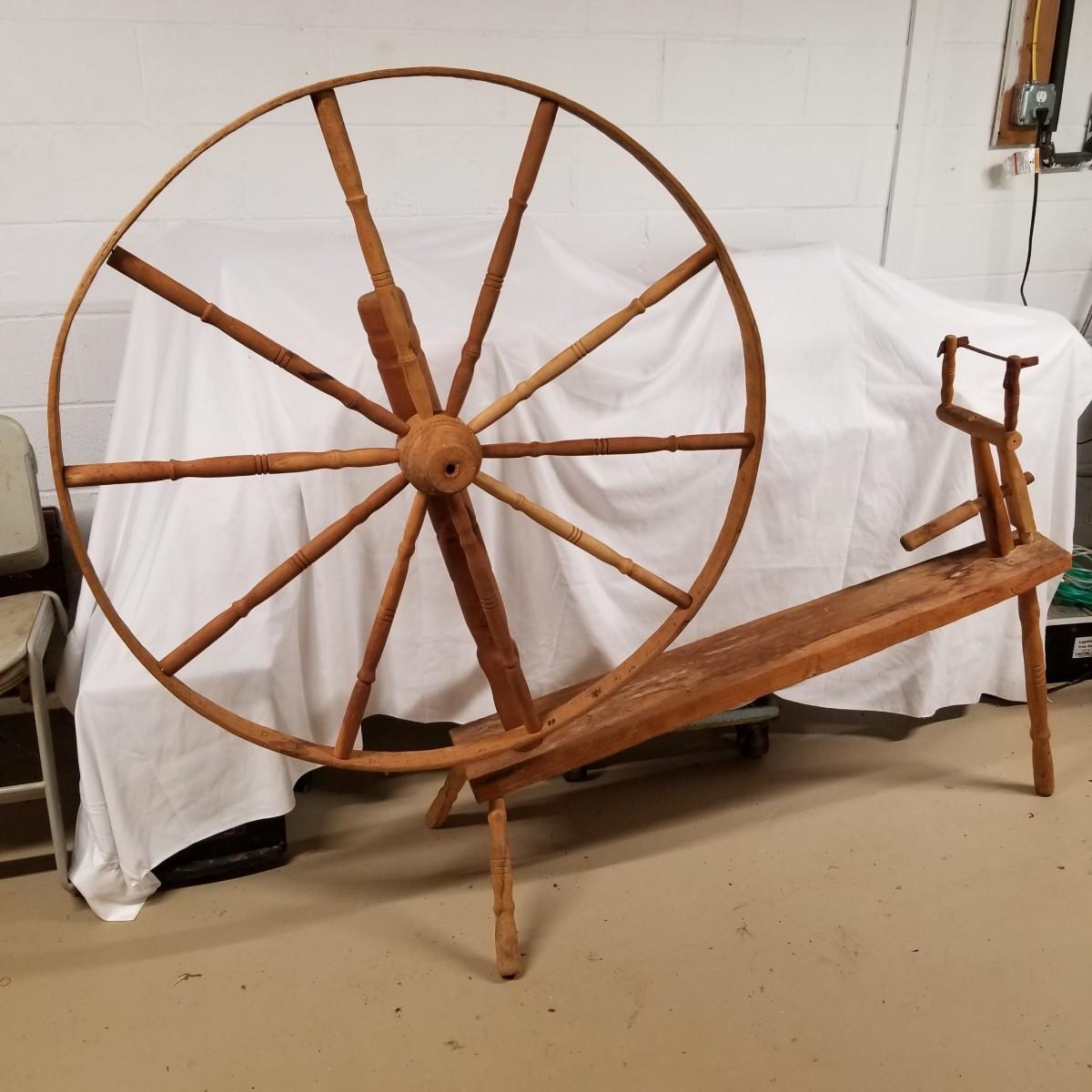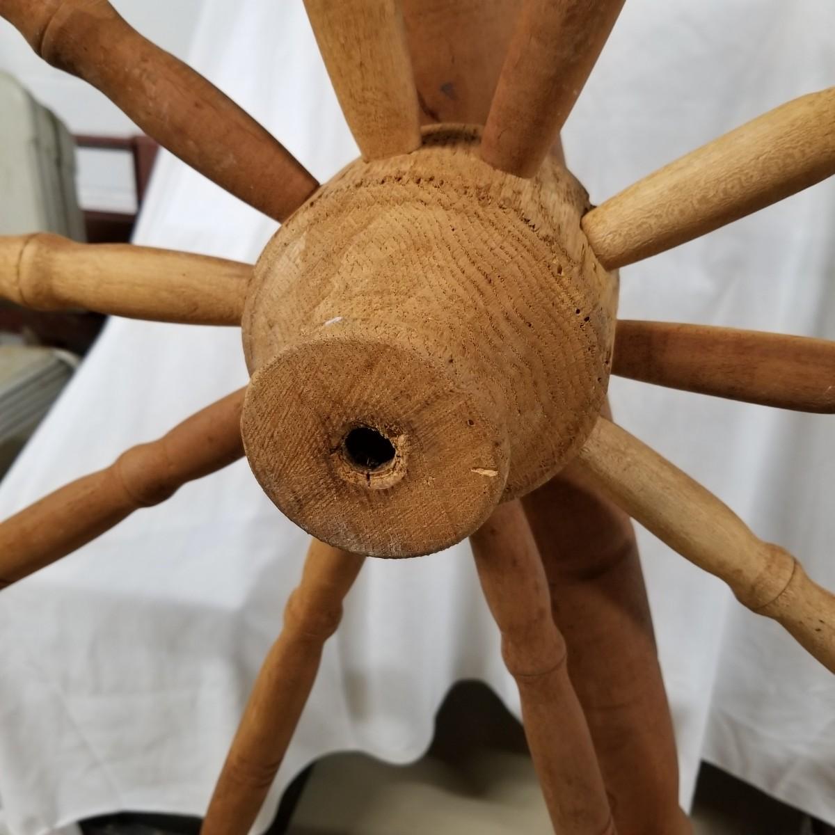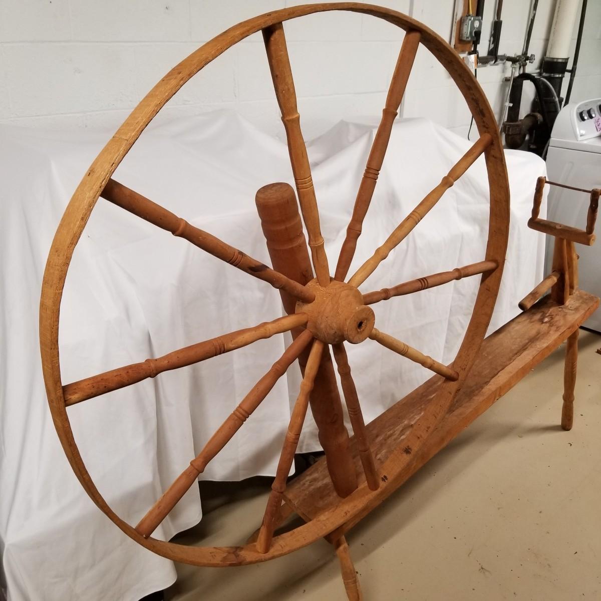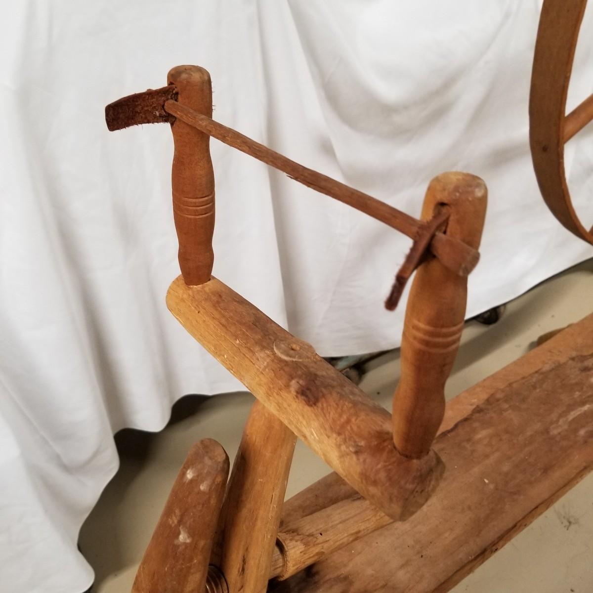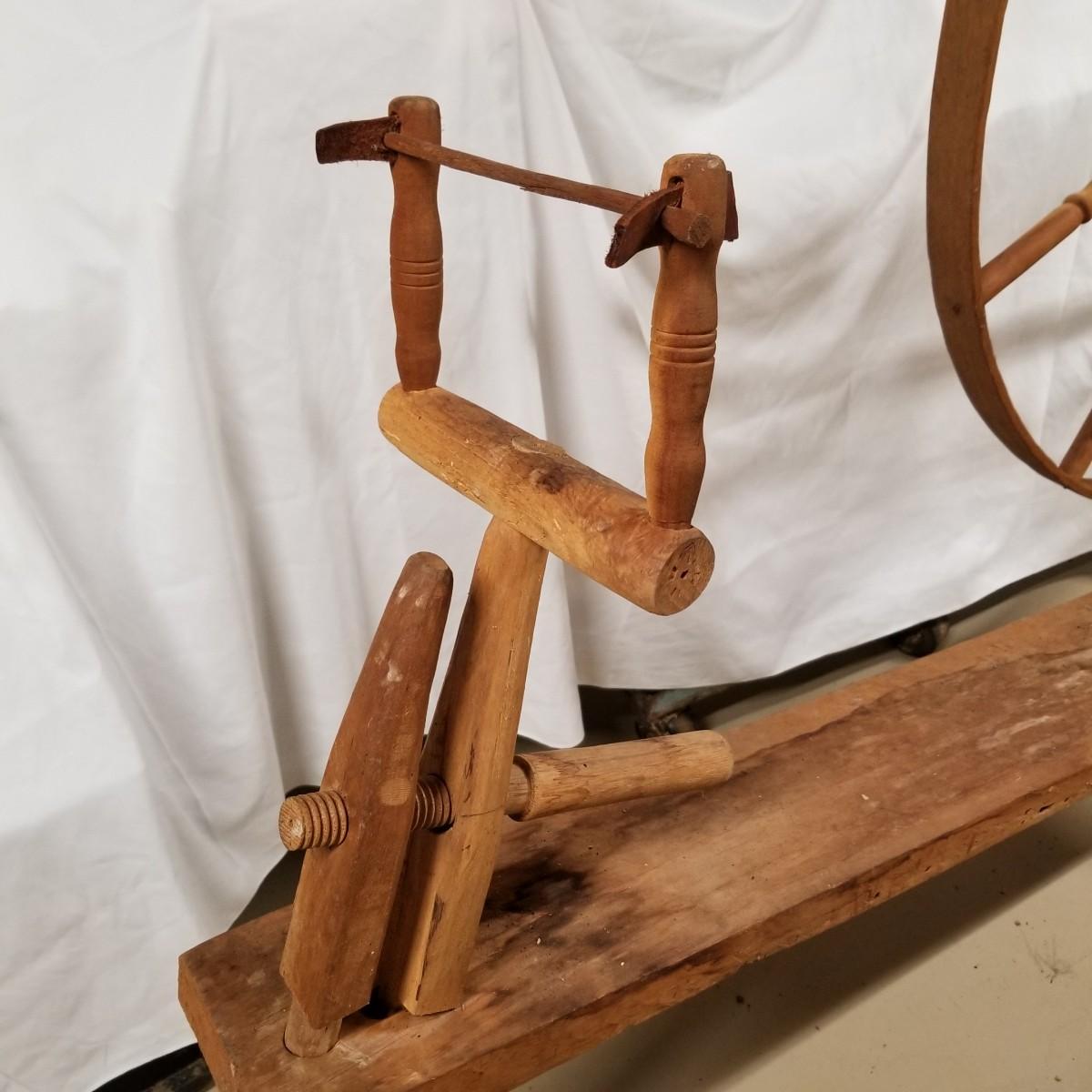 Walking style spinning wheel. Item is 72" x 20" x 41". Wood screw tension adjustment. Appears to be handmade, possible oak wood. No spinning head or drive band. This piece is quite large but may come apart for transport. Local pickup only.