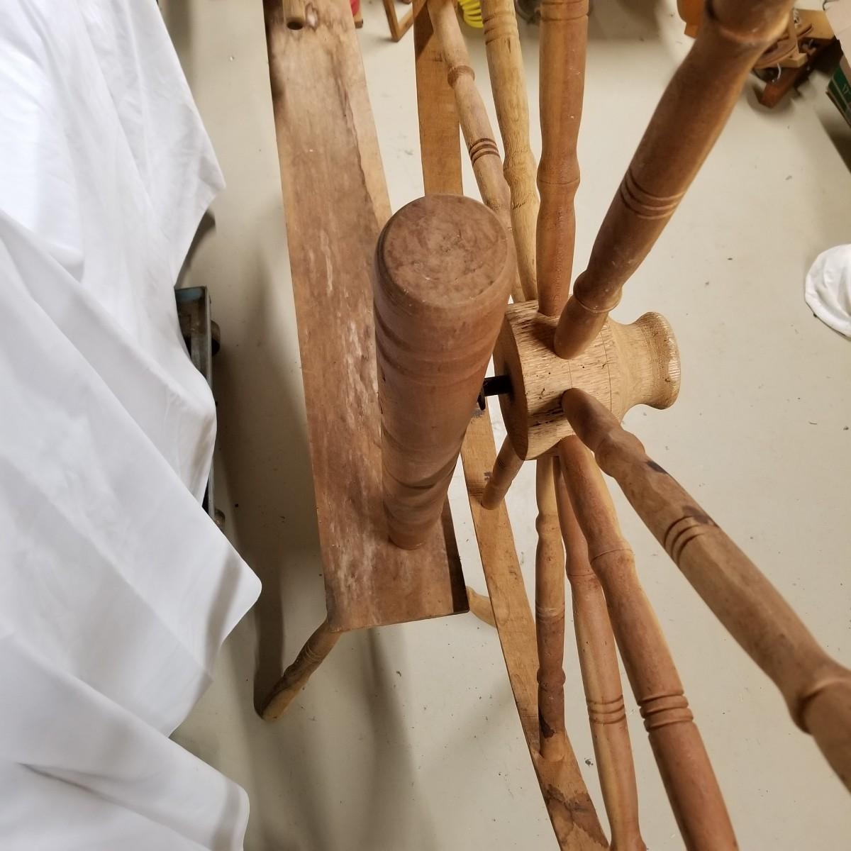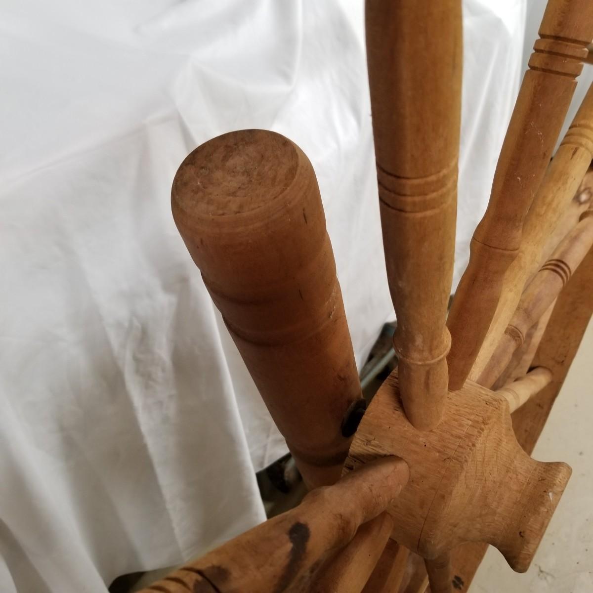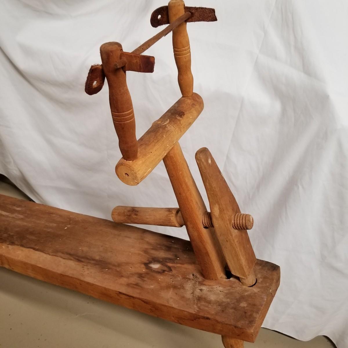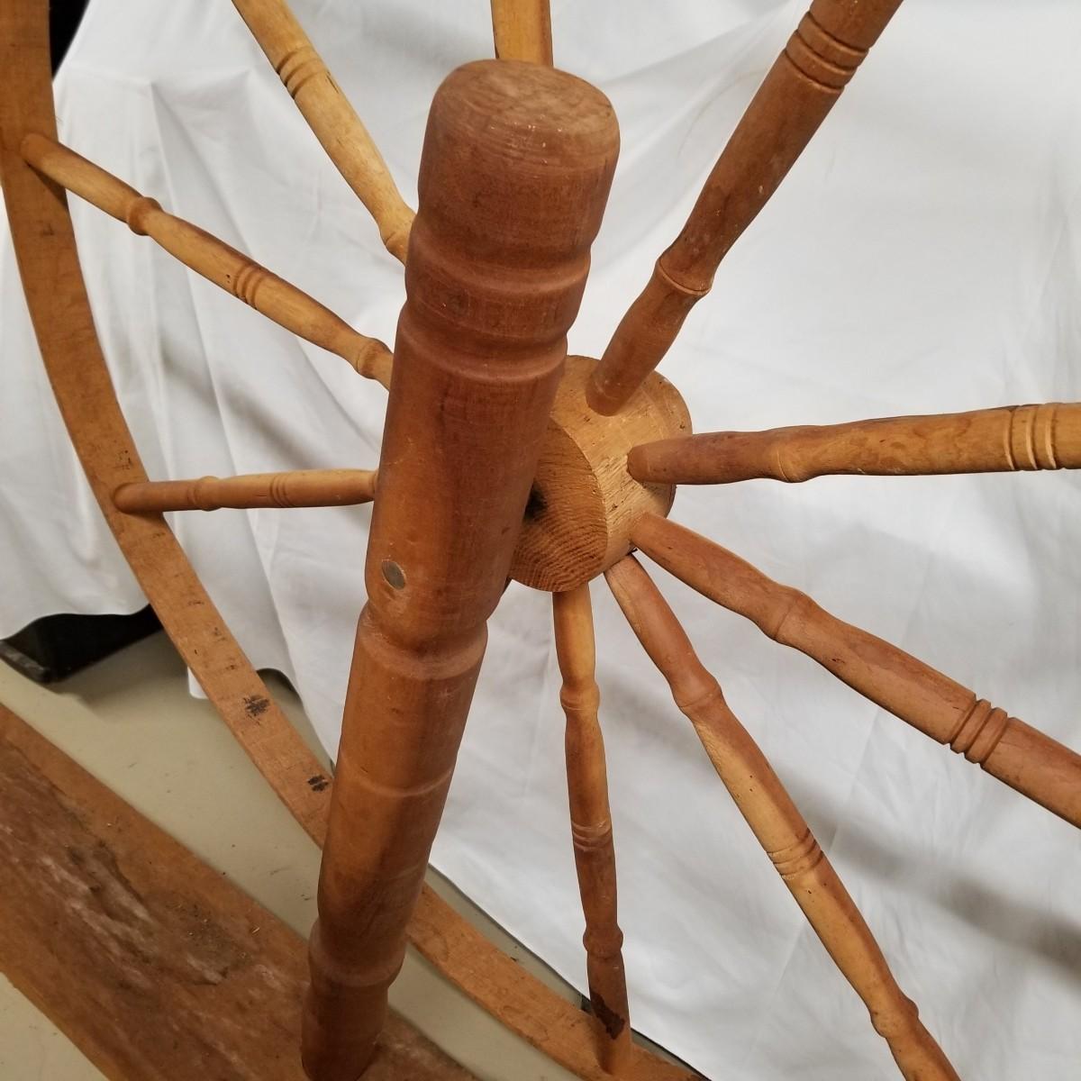 Walking style spinning wheel. Item is 72" x 20" x 41". Wood screw tension adjustment. Appears to be handmade, possible oak wood. No spinning head or drive band. This piece is quite large but may come apart for transport. Local pickup only.