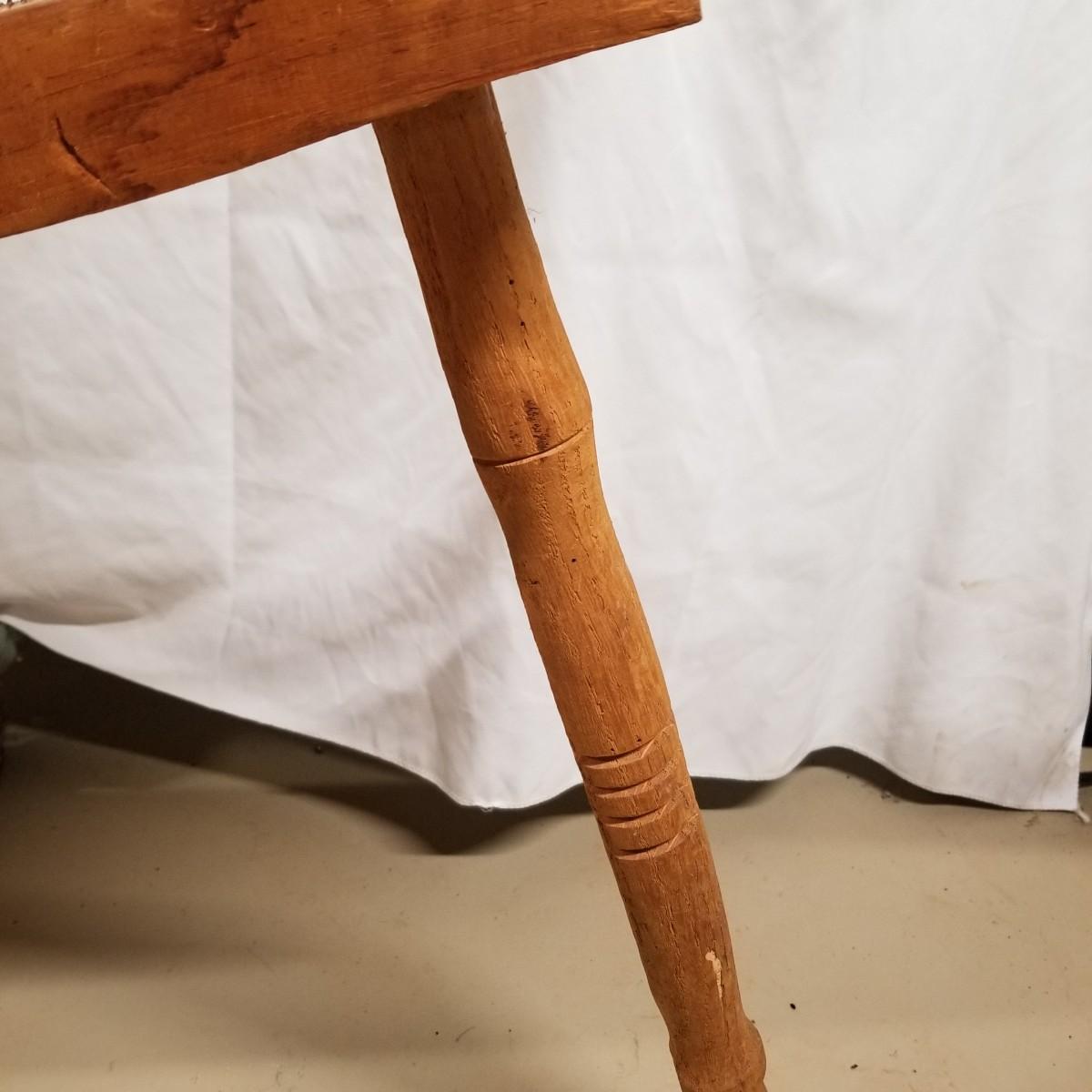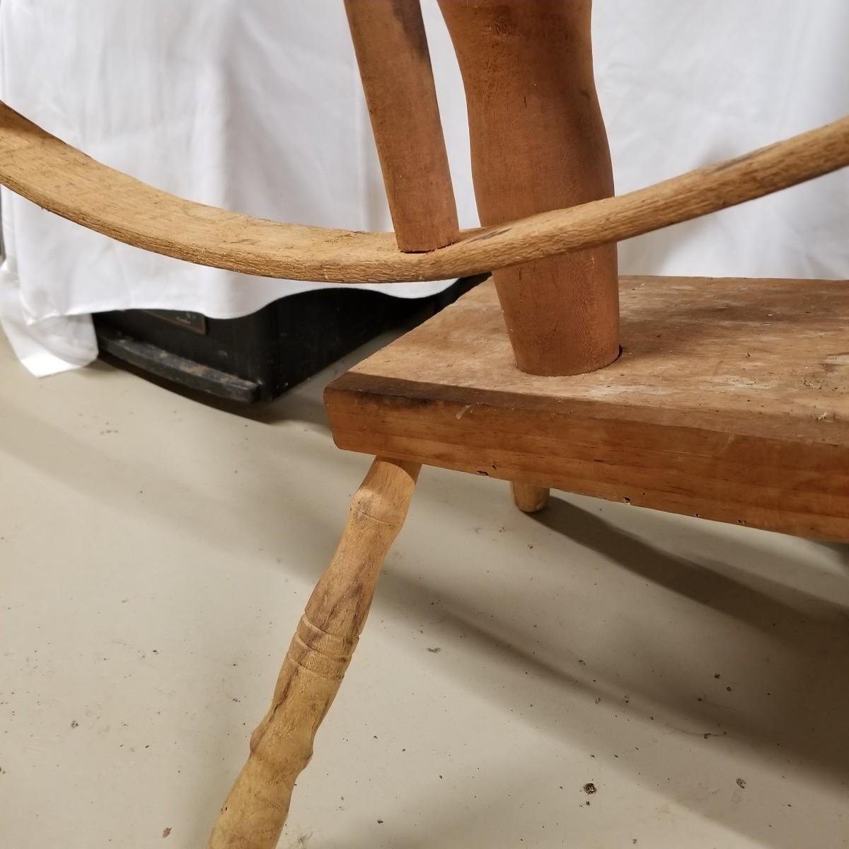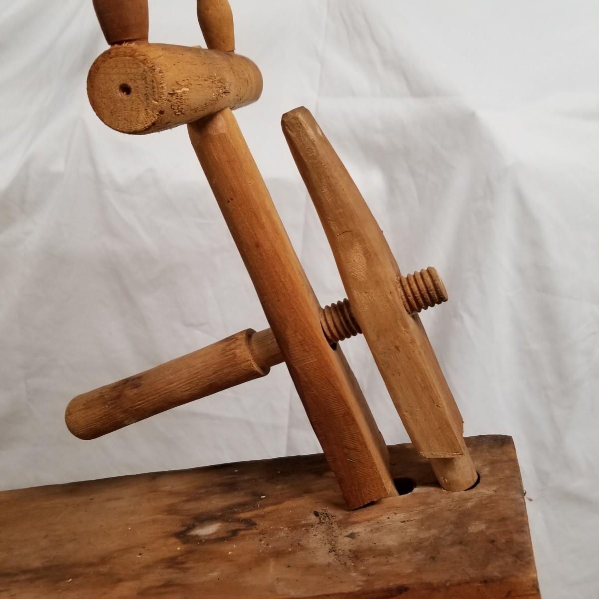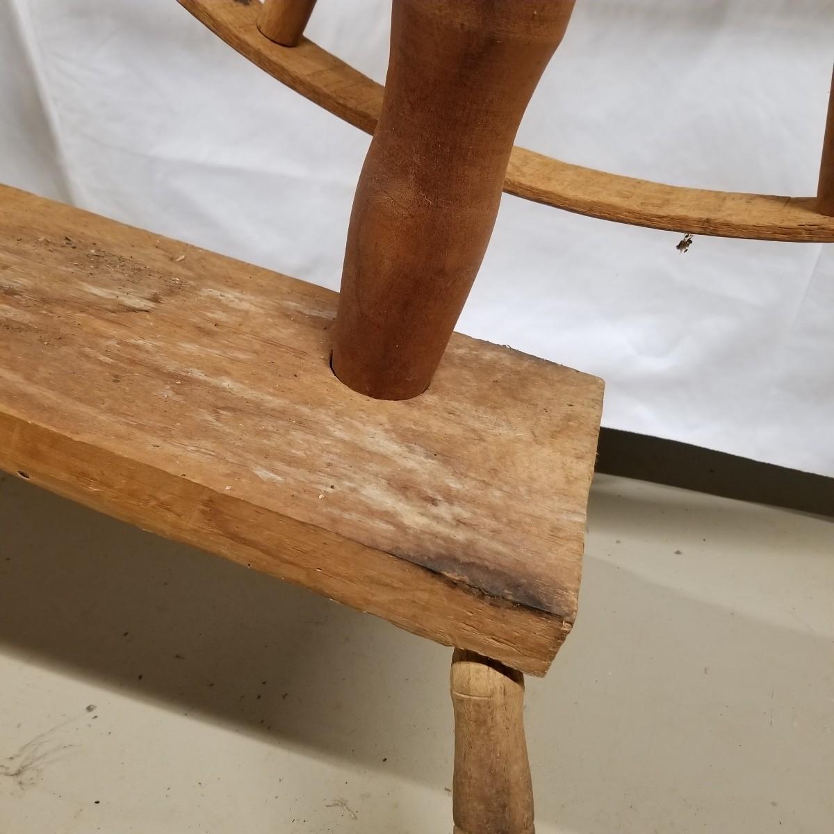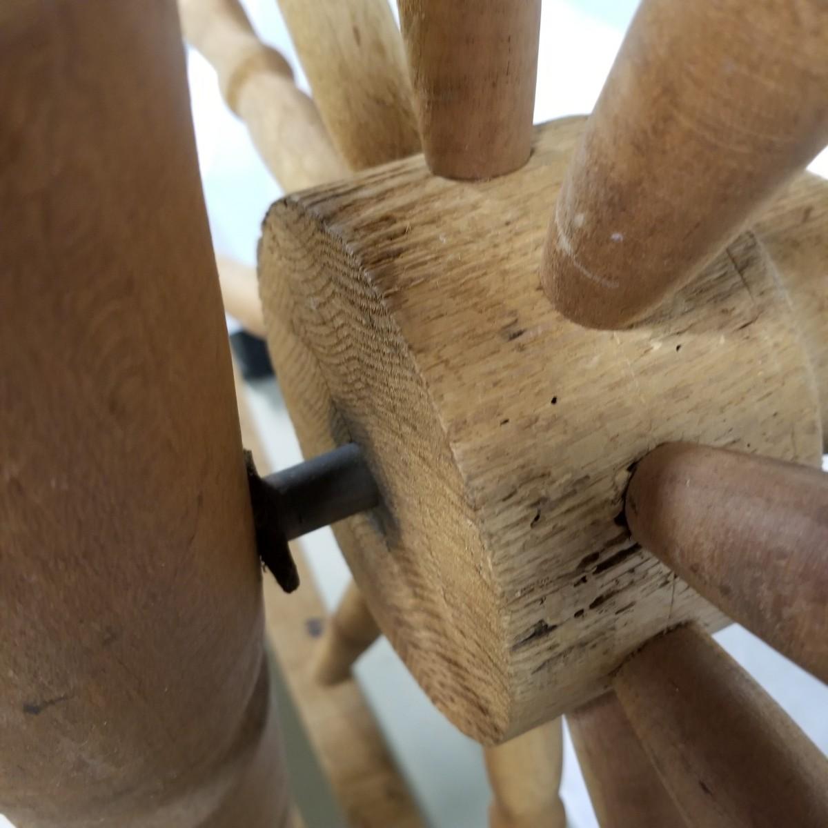 Walking style spinning wheel. Item is 72" x 20" x 41". Wood screw tension adjustment. Appears to be handmade, possible oak wood. No spinning head or drive band. This piece is quite large but may come apart for transport. Local pickup only.