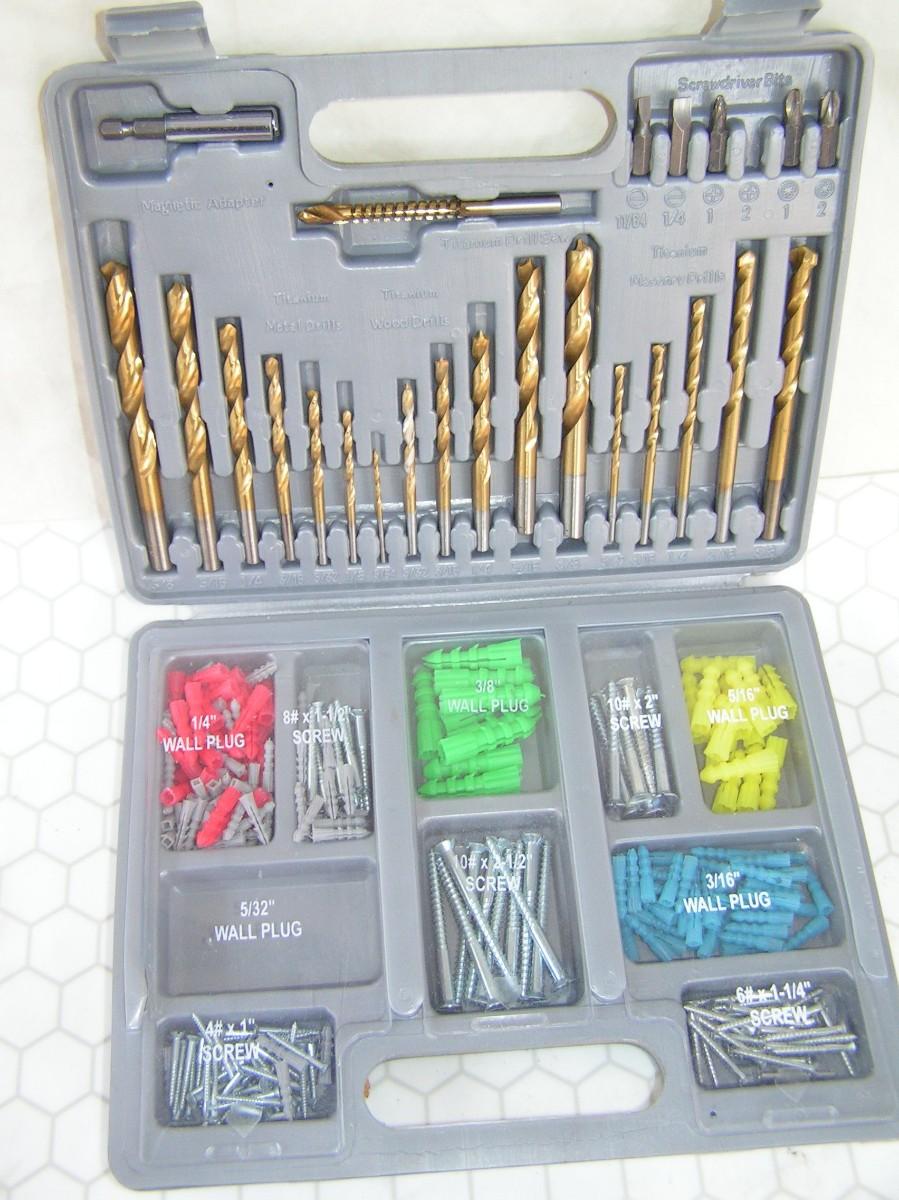 Wall anchor installation kit, with drill bits and lots of anchors w/screws.