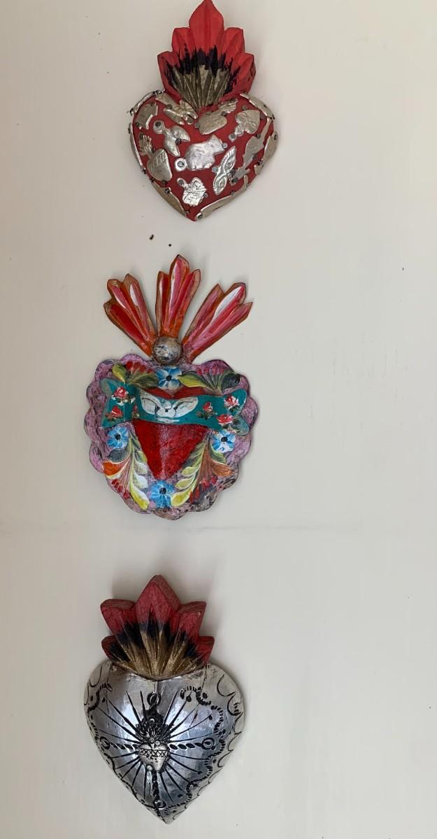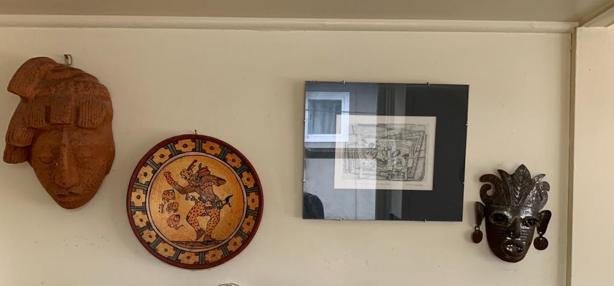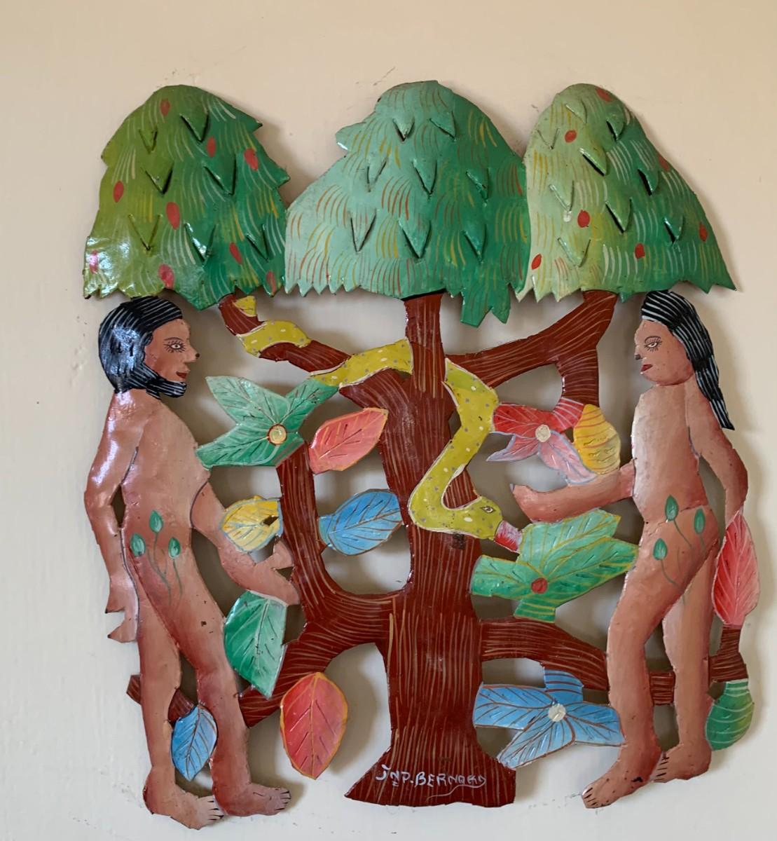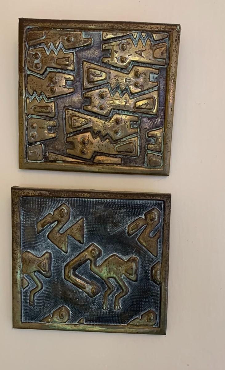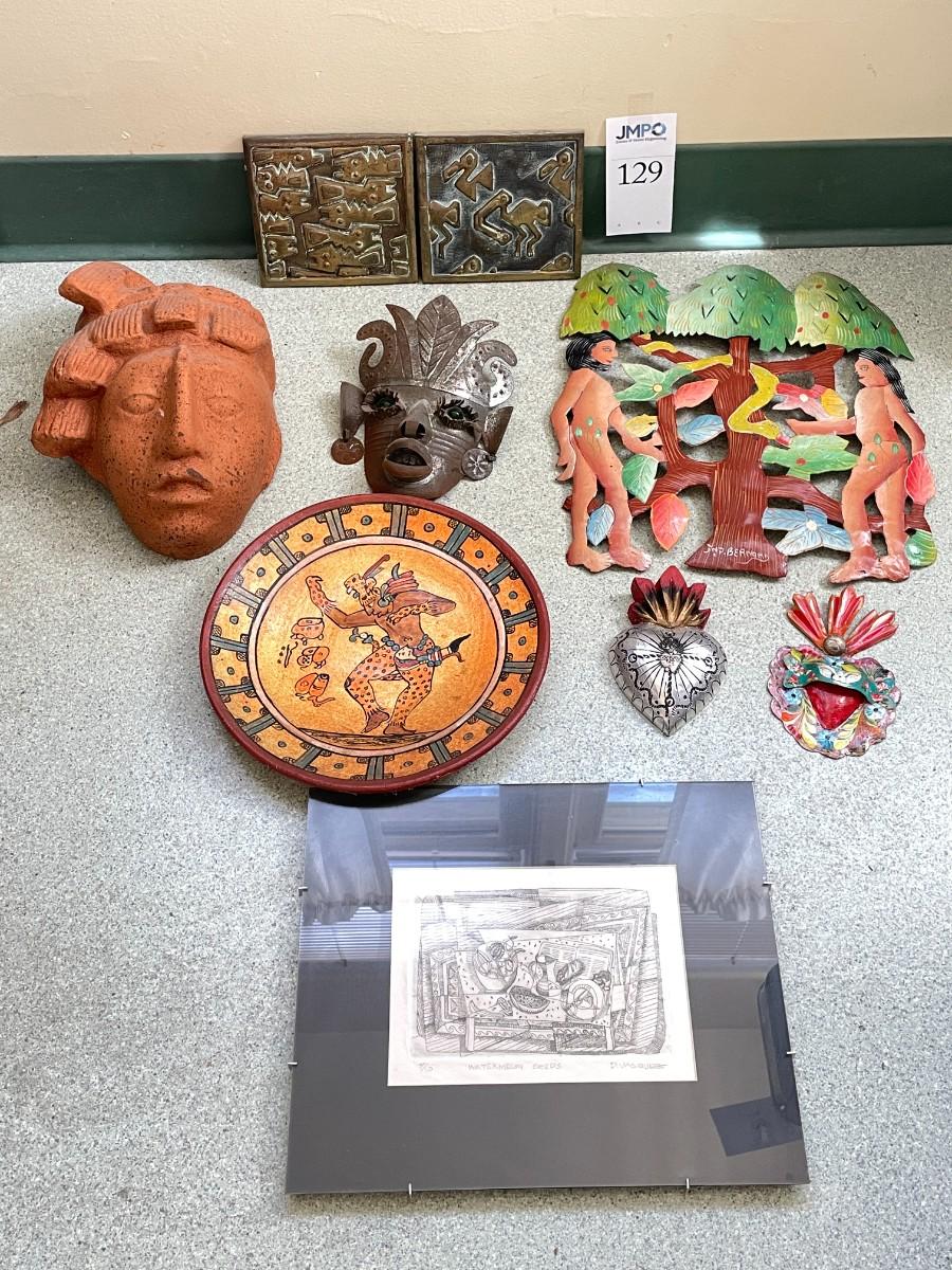 Terra cotta south american face. Thin metal adam and eve depiction. 2 square 4" metal plaques. Glass covered lithograph (unconfirmed original). 3 small metal wall art pieces