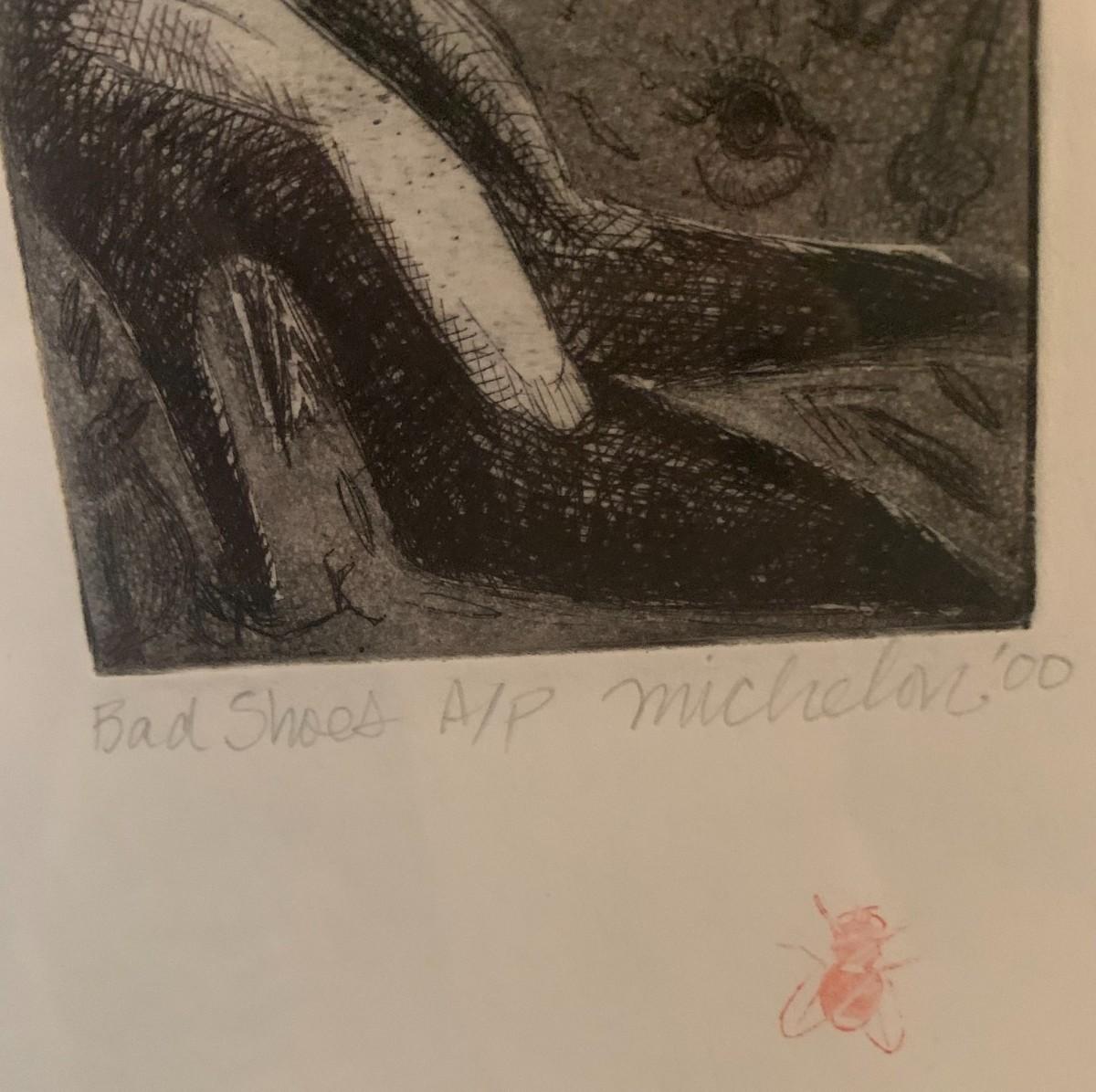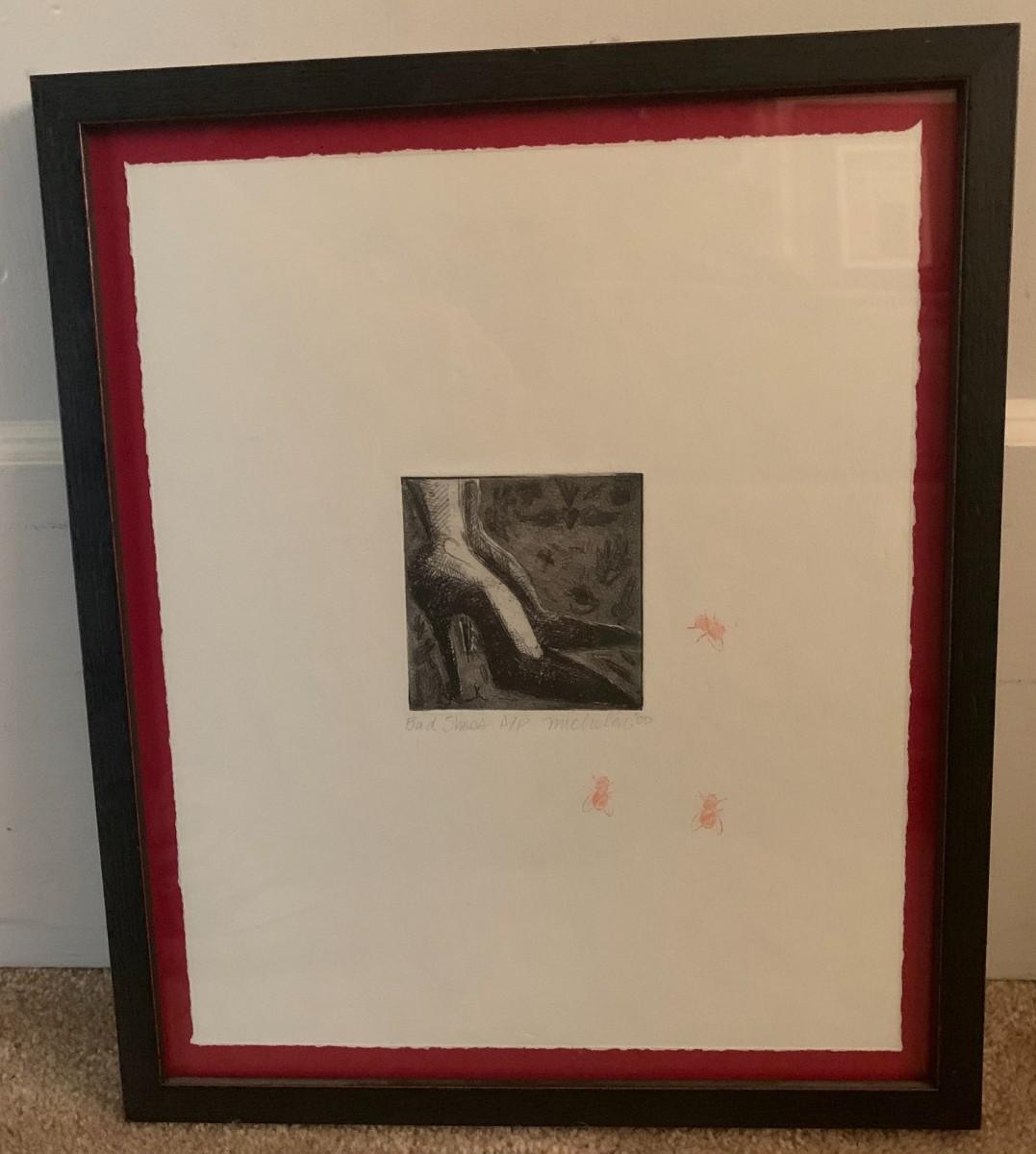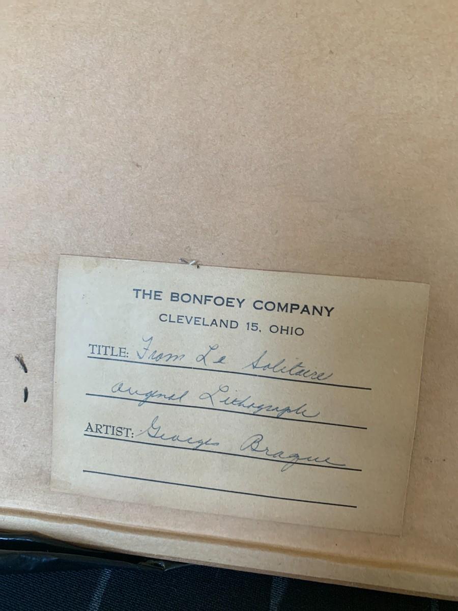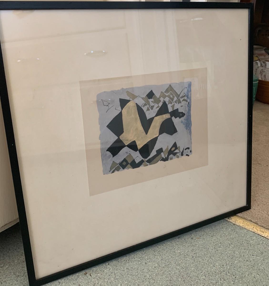 2 pieces total. Lithograph by George Braque (1882-1963, French). From Le Solitaire series. Unsigned. Paper gallery label on verso. Framed 18x16" Also, Framed art titled "Bad Shoes" by Michelon with 3 red flies. 11x13"