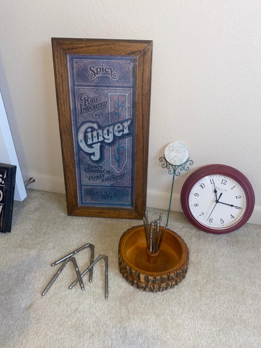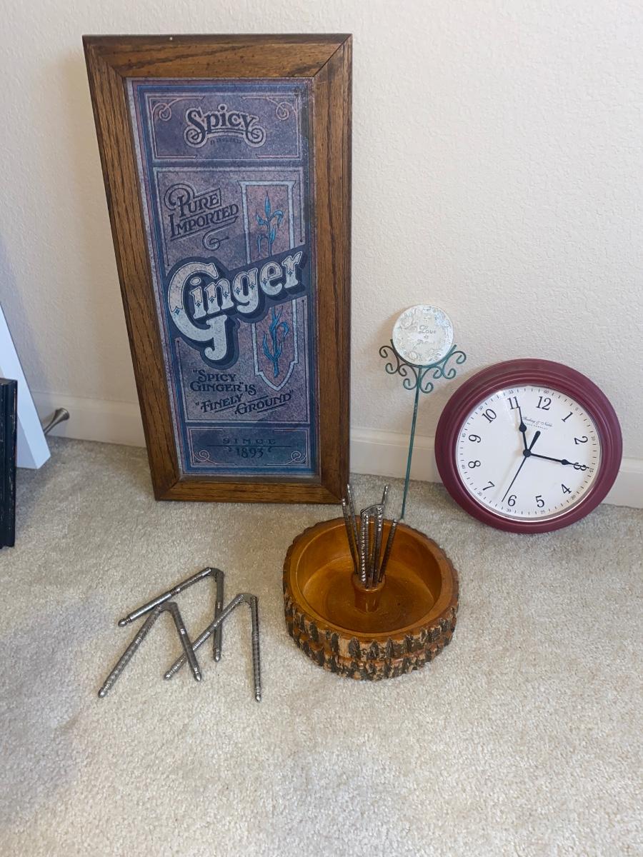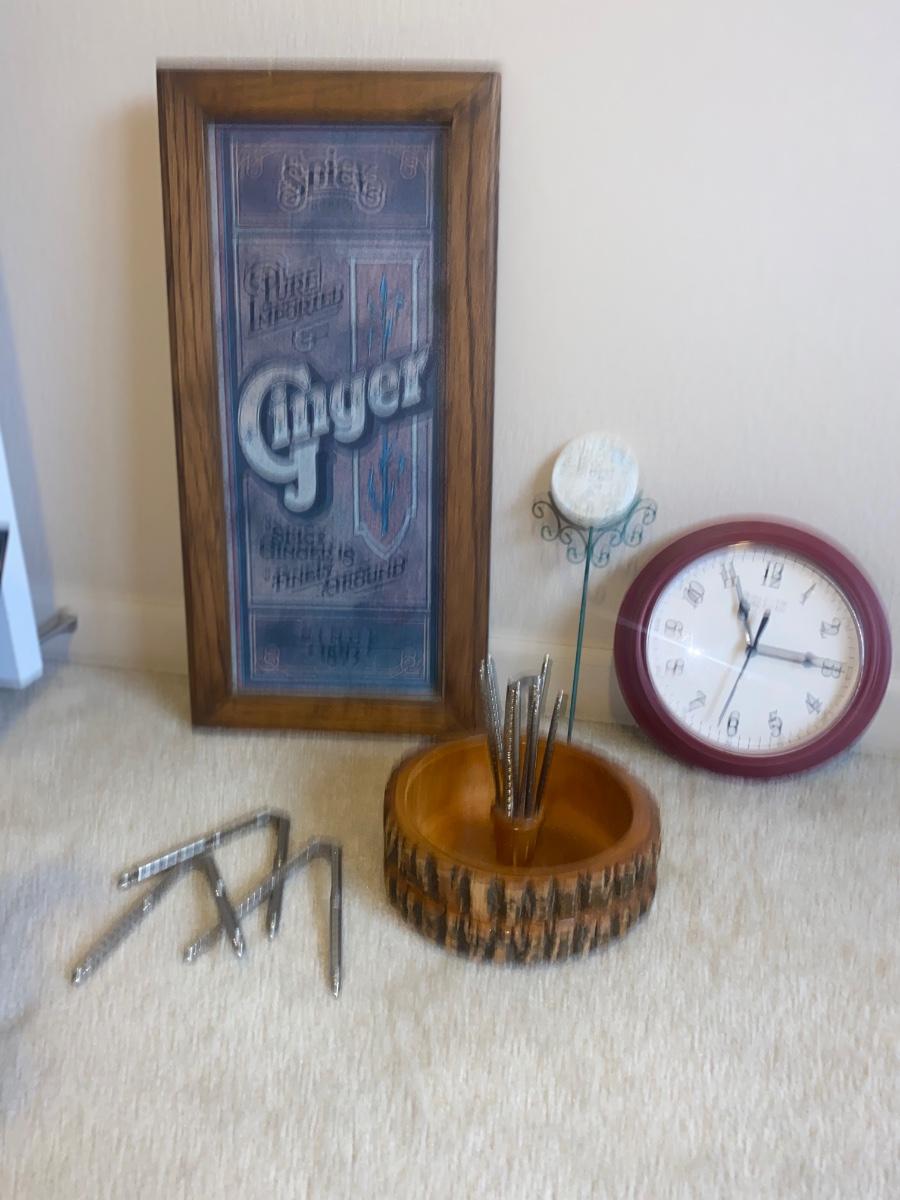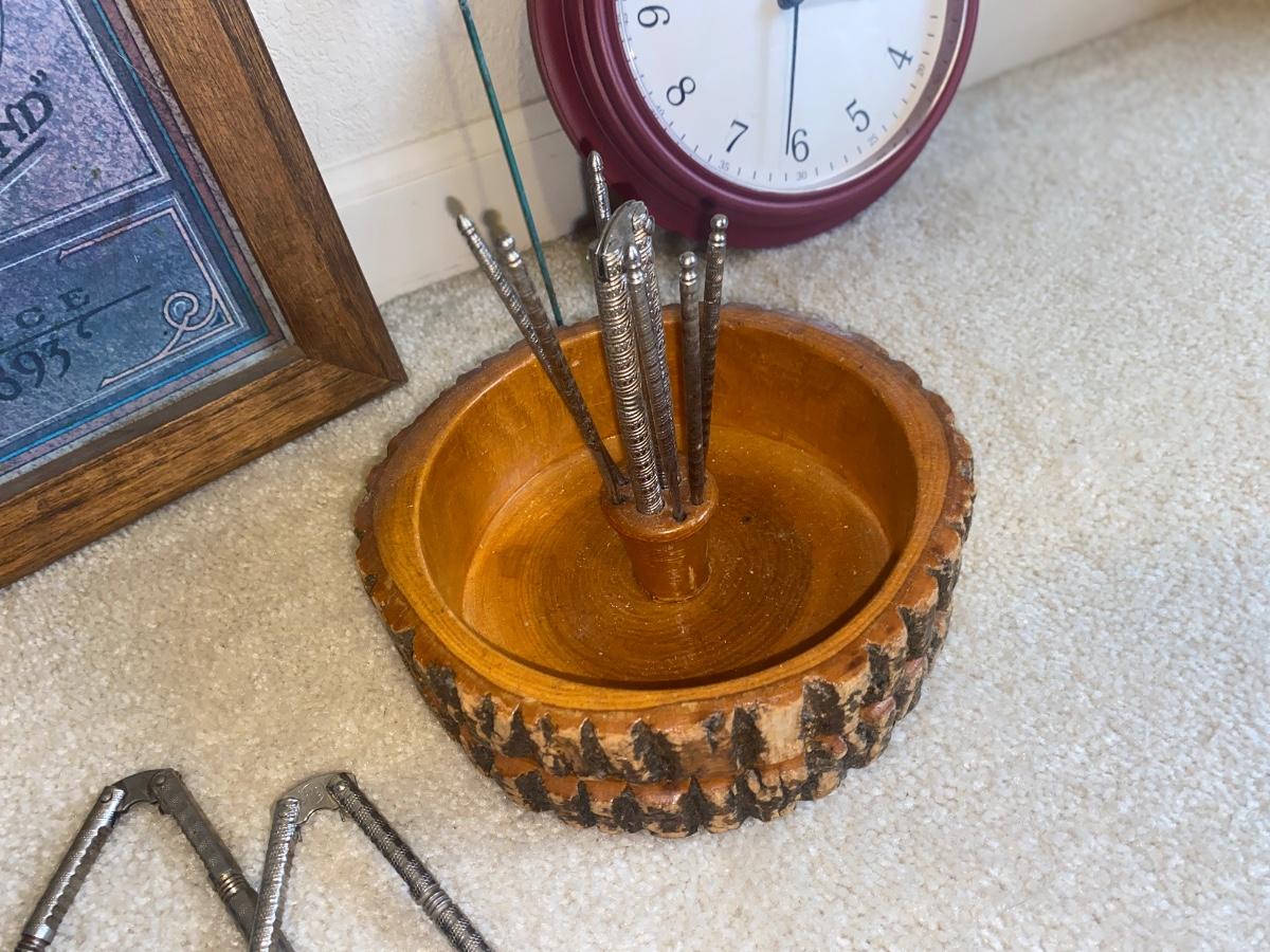 WALL ART AND CLOCK, NUT BOWL/W TOOLS AND A STAKED FLOWER POT SIGN