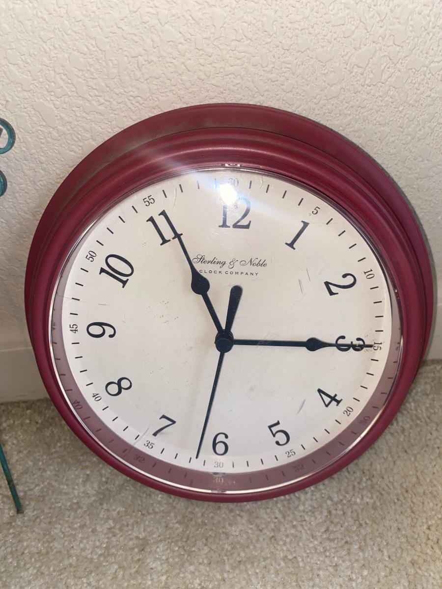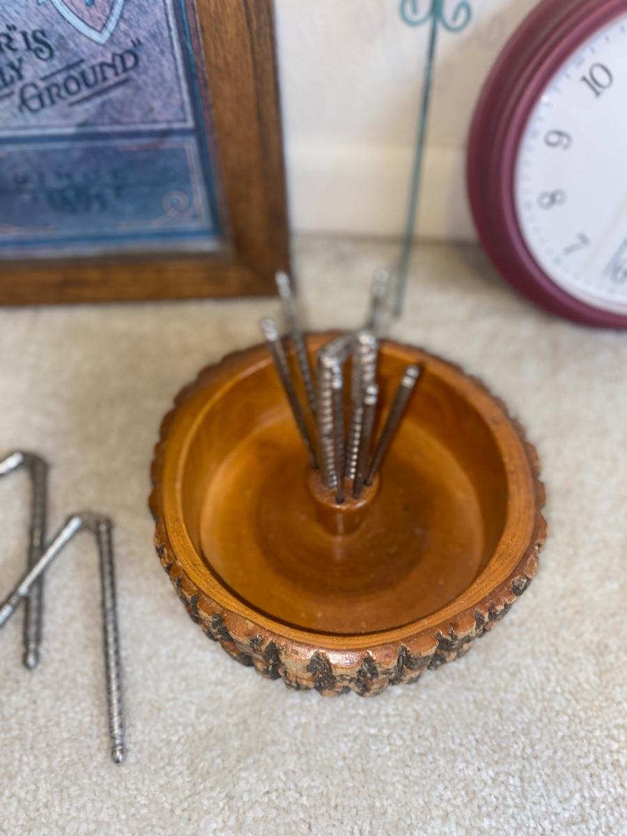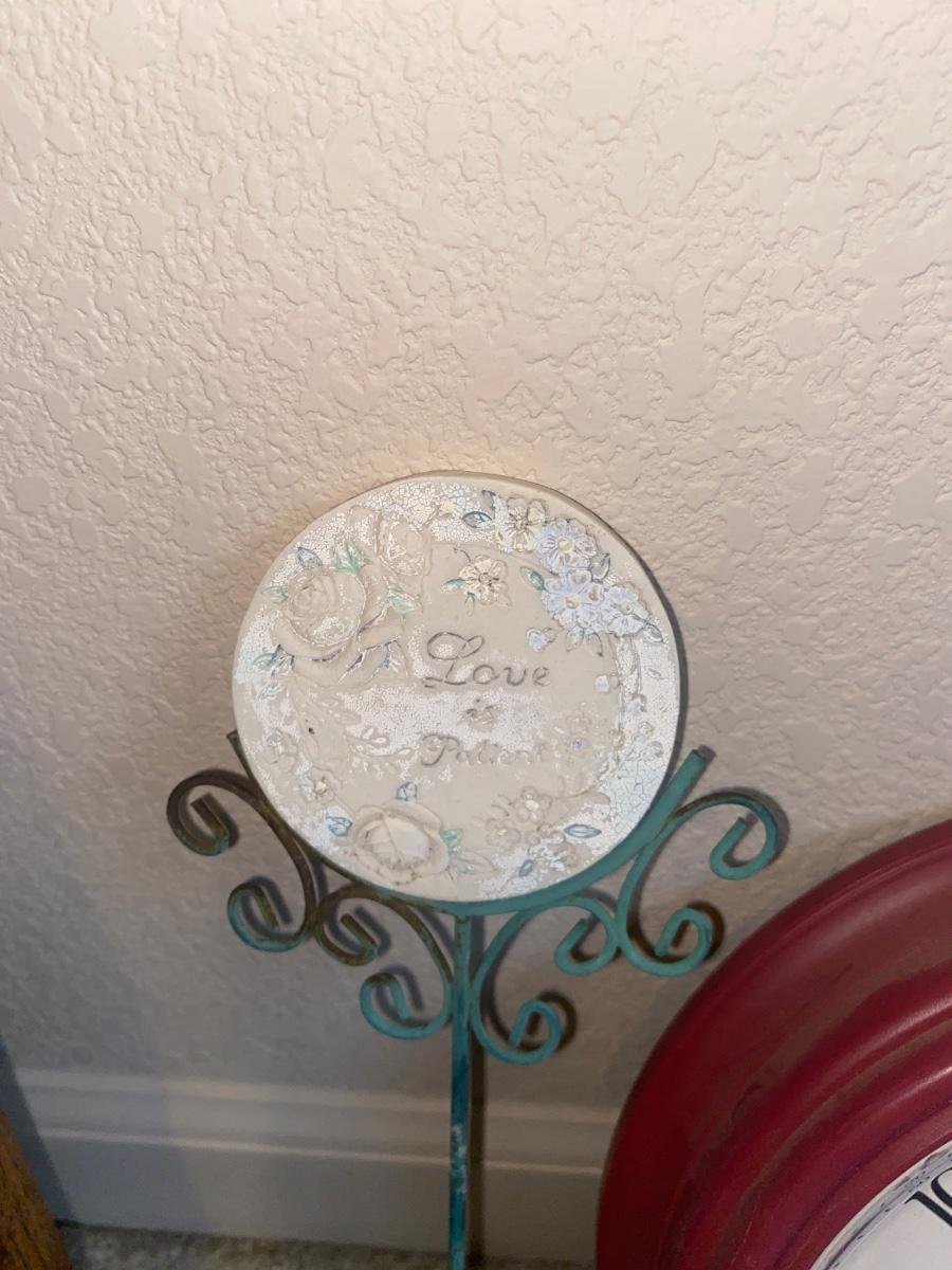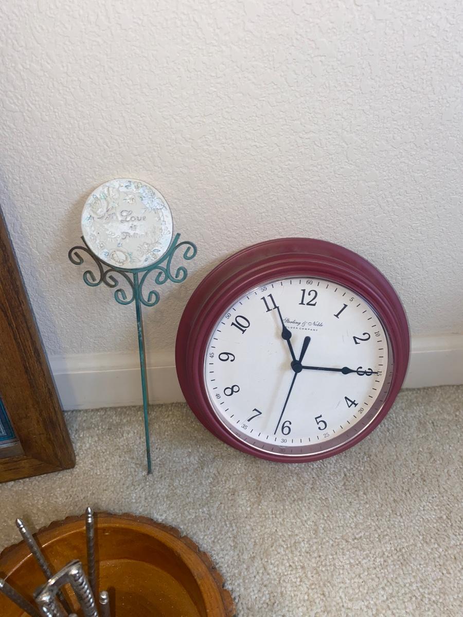 WALL ART AND CLOCK, NUT BOWL/W TOOLS AND A STAKED FLOWER POT SIGN
