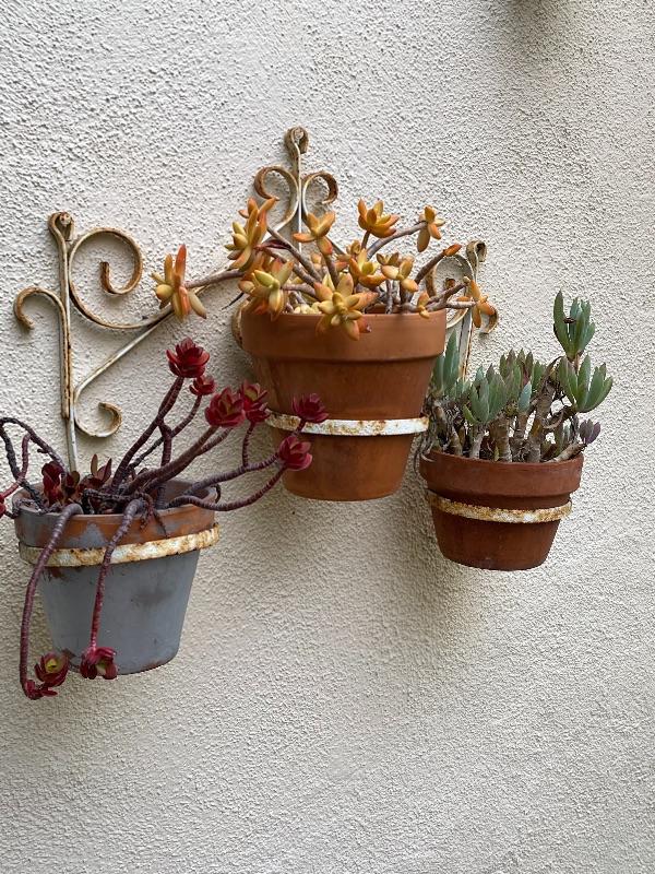 Wall art, garden art, rustic wrought iron with potted plants