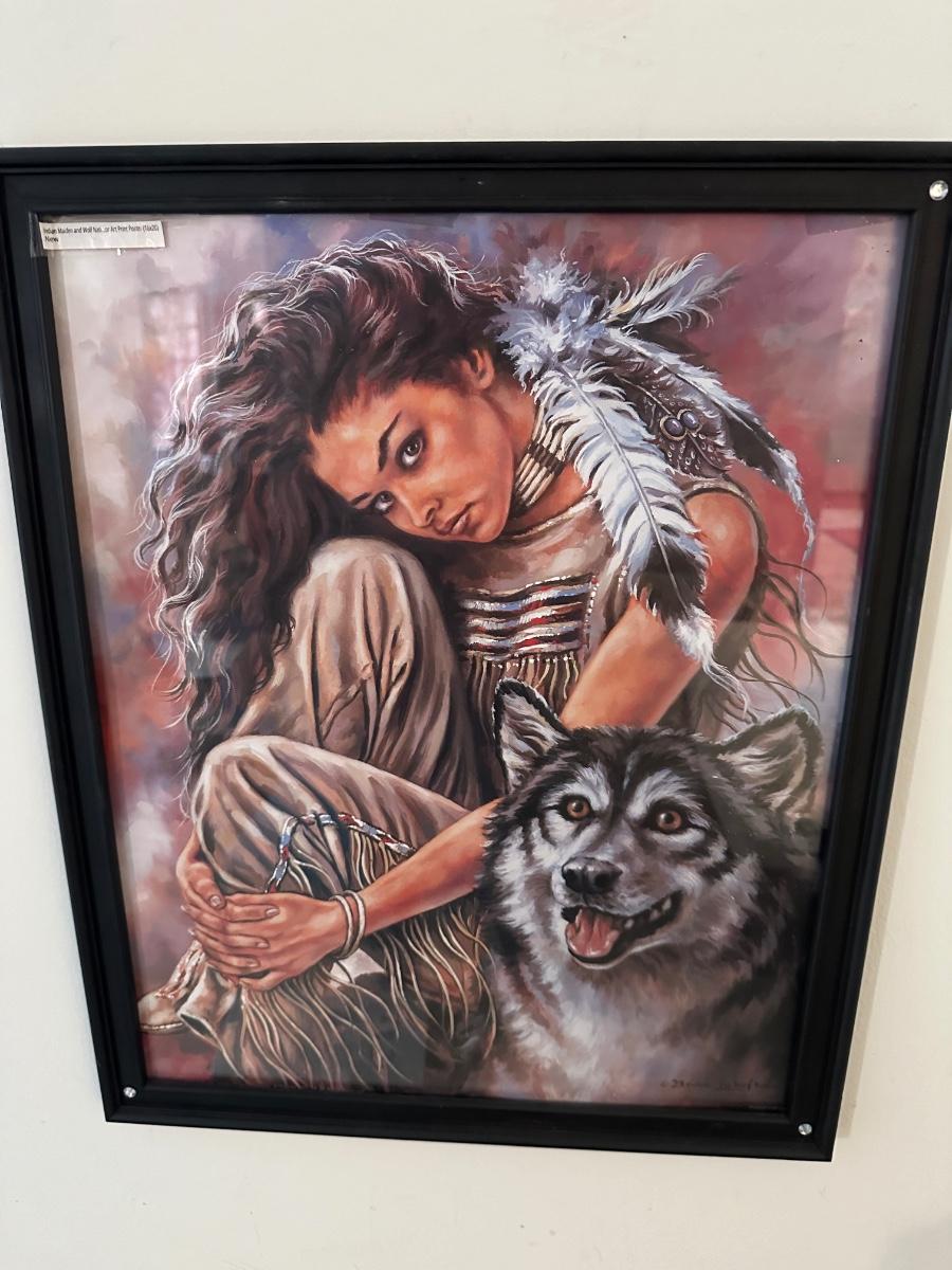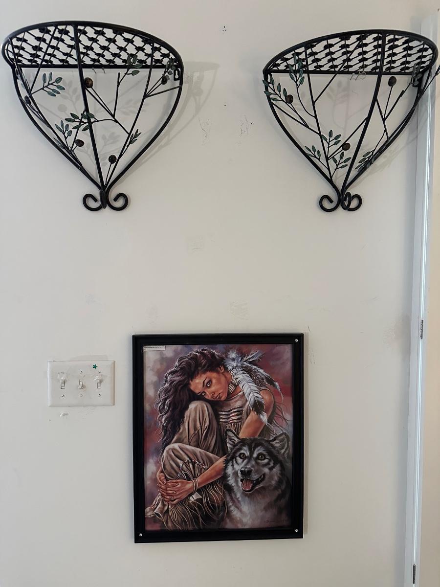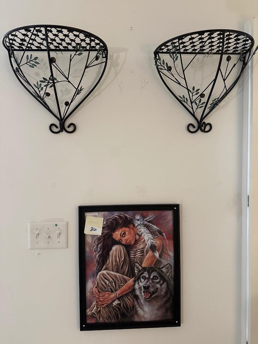 18X22 FRAMED WOLF INDIAN GIRL PICTURE, PAIR OF METAL WALL SCONCES